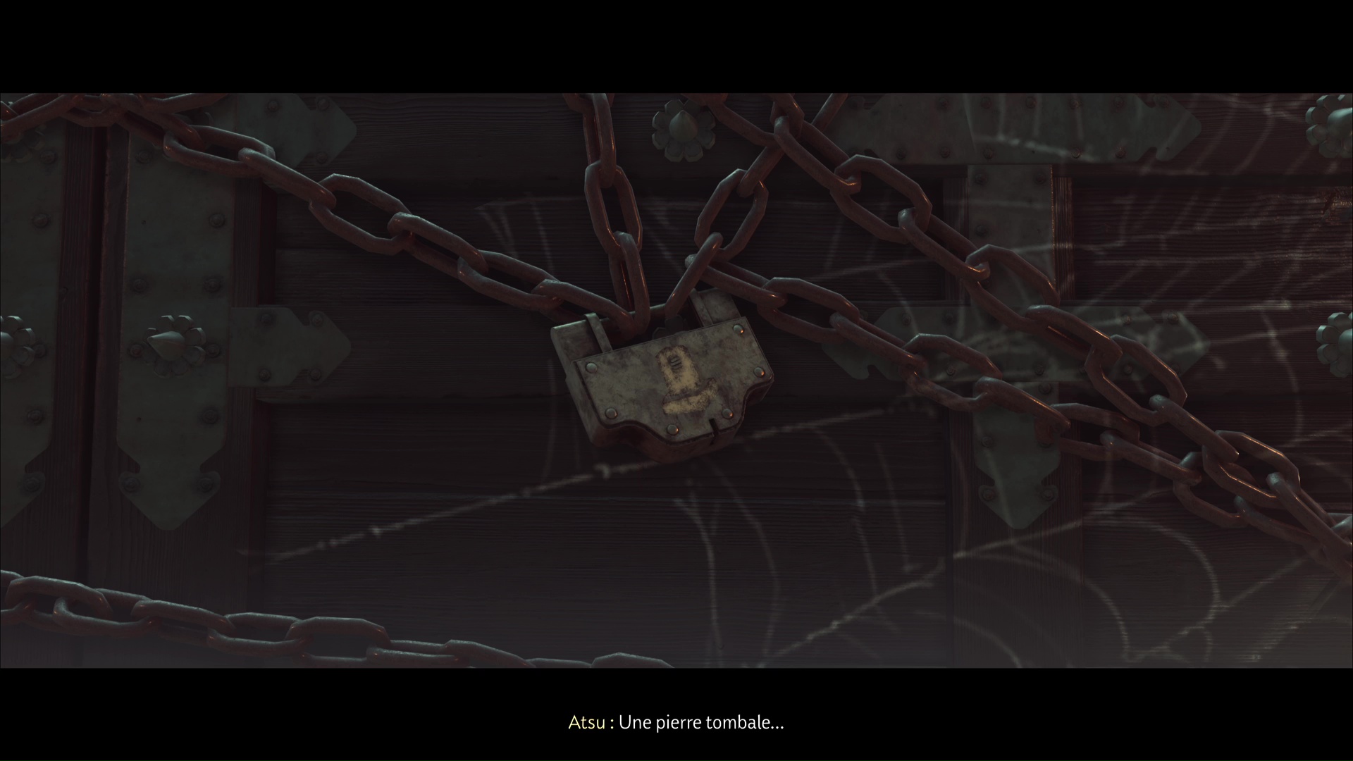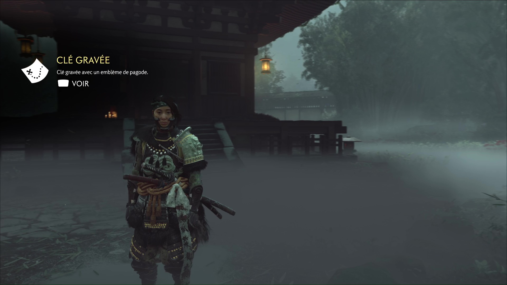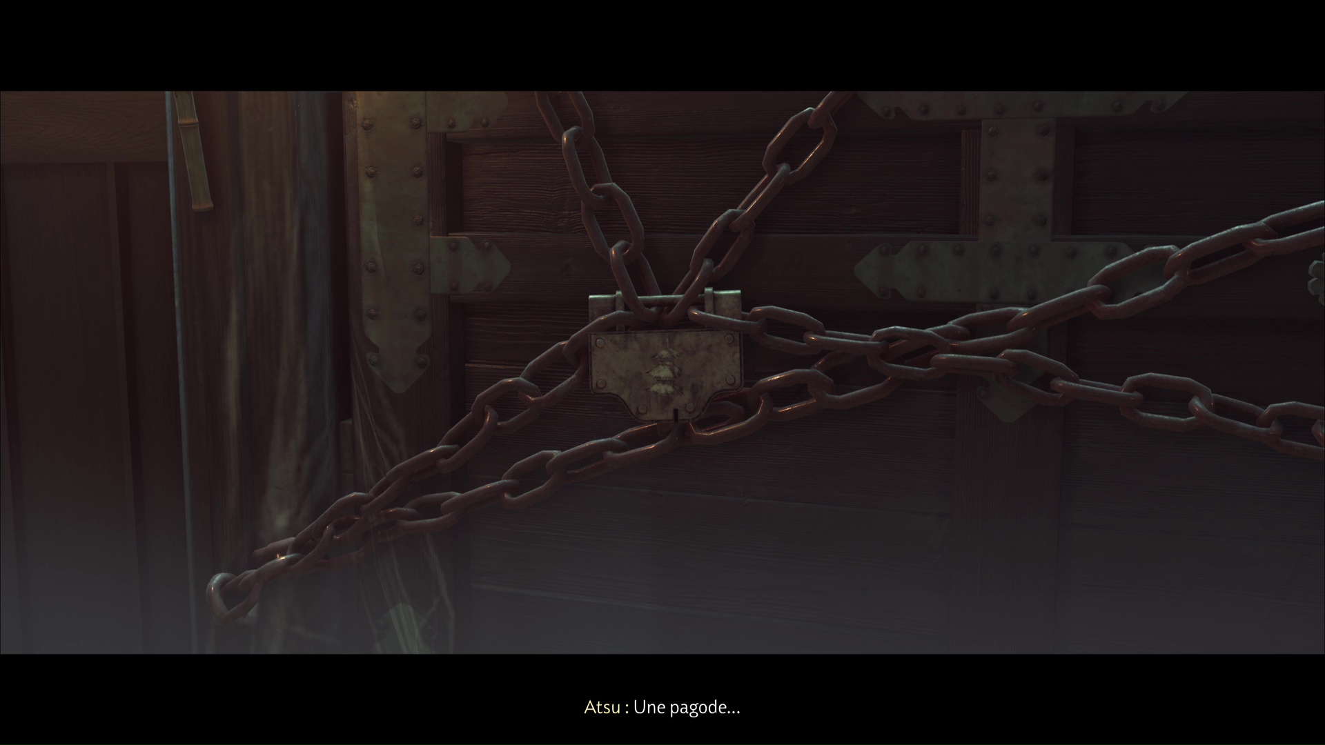 La clé suivante est on ne peut plus simple à obtenir. Rendez-vous au pied de la pagode et cherchez un coffre. Ouvrez-le pour obtenir la Clé gravée en forme de pagode. Vous aurez droit ensuite à une apparition du Général Tominaga, qui prend Atsu pour sa fille Yuri. Partez ensuite dans la direction droit devant vous pour rejoindre l’emplacement de la dernière clé.