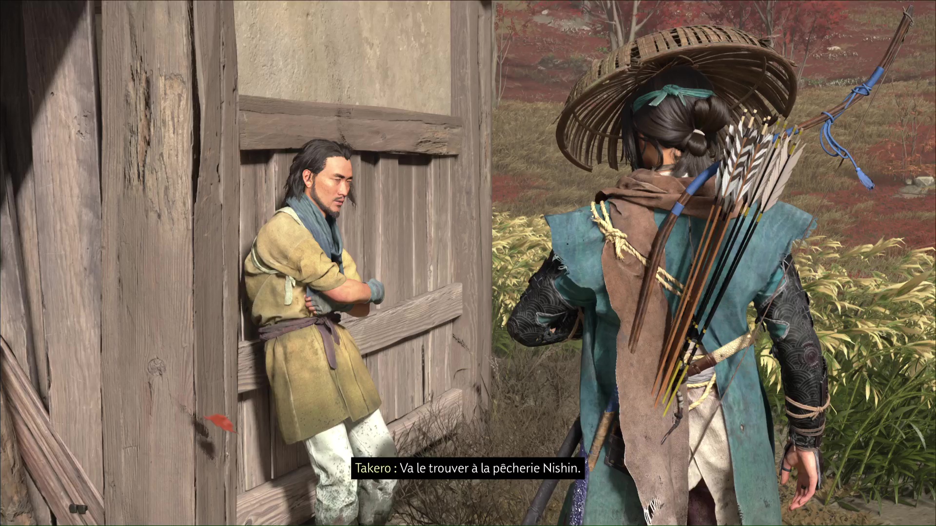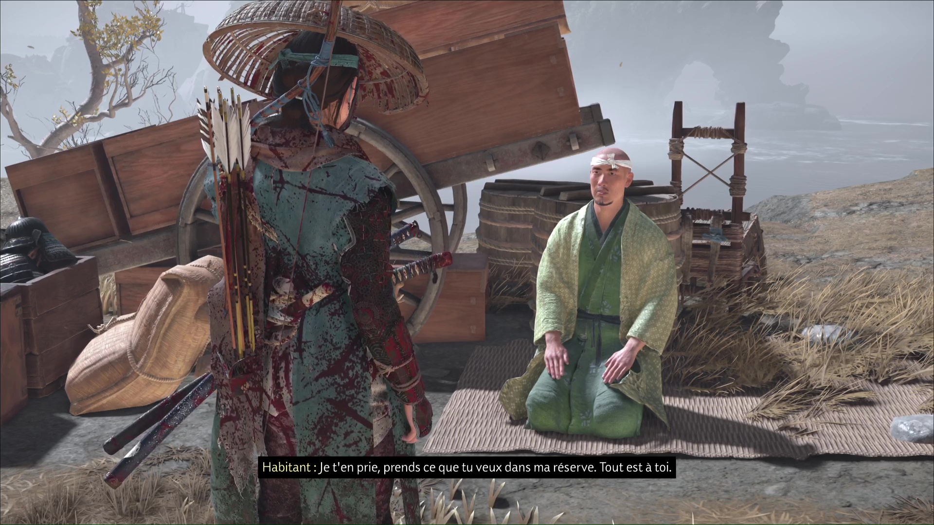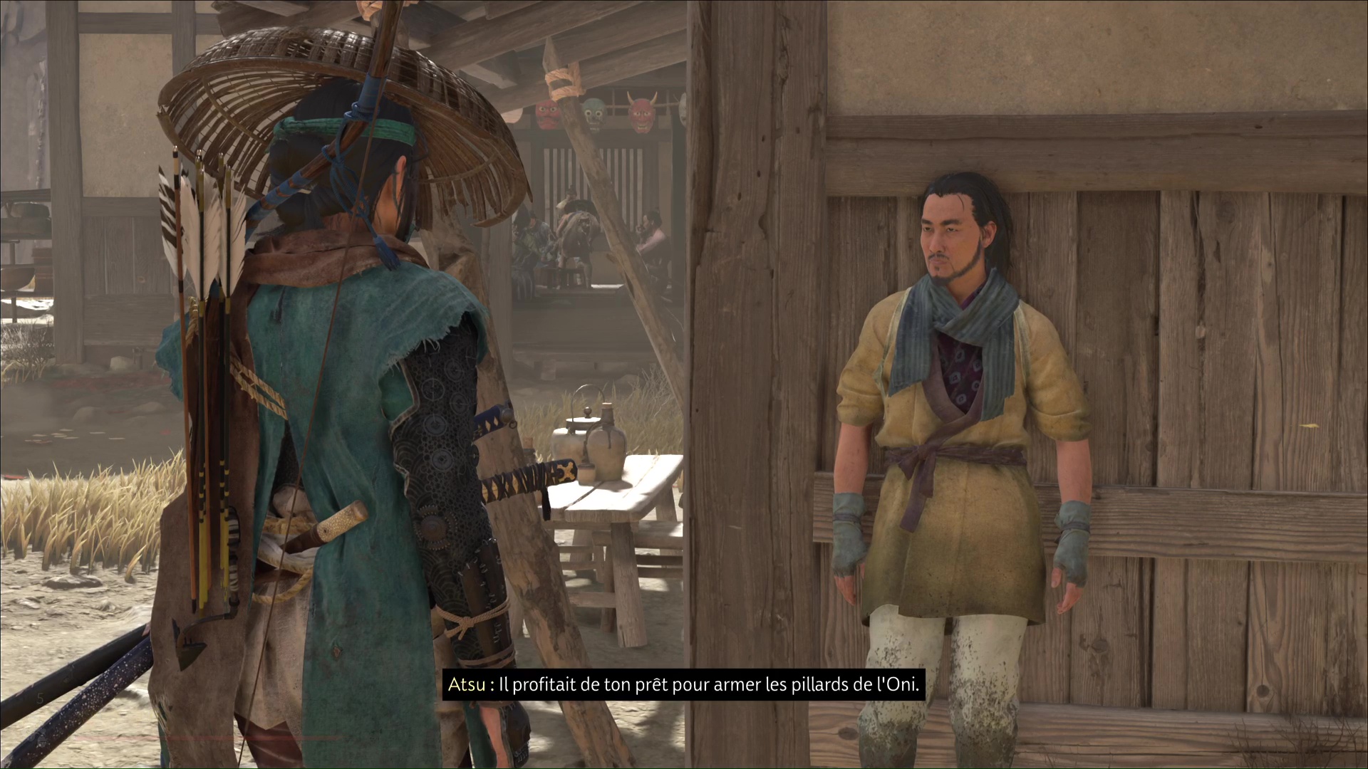 Il vous demande donc de vous aventurer au niveau de la Pêcherie Nishin, au sud-ouest, pour le secouer. Là-bas, parlez au marchand pour rapidement découvrir que ce sont des armes qui sont vendues. Des pillards de l’Oni débarquent, et vous allez devoir les battre.