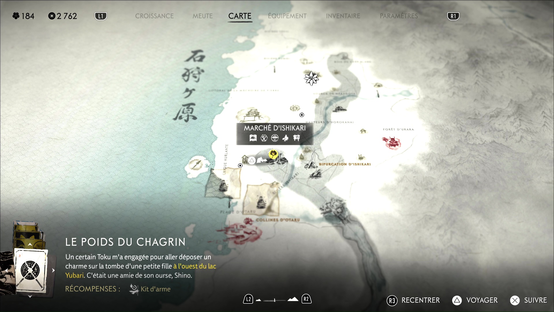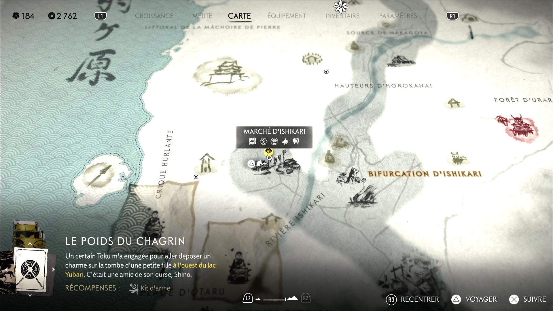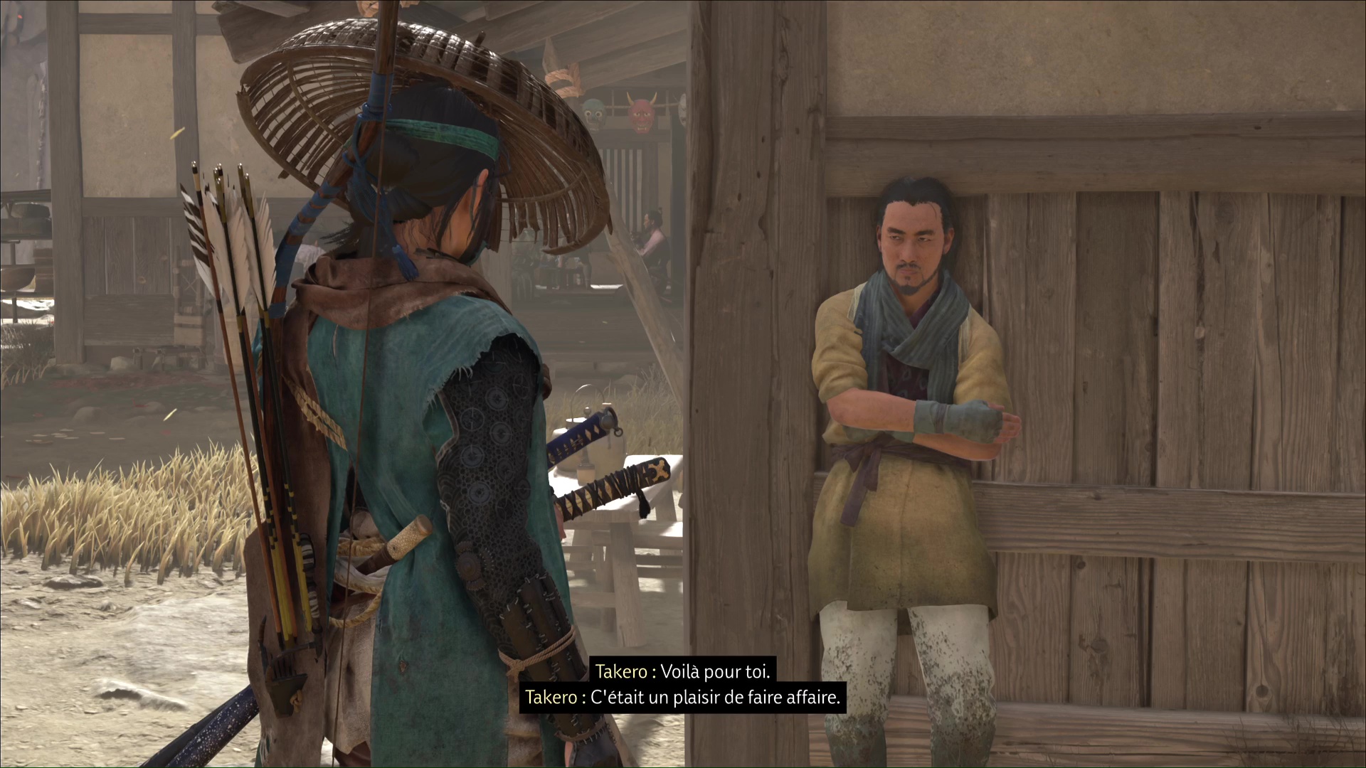Ramenez l’argent à Takero au Marché d’Ishikari. Ce dernier vous remercie pour votre travail et vous confie 450 pièces et 6 fragments de masque Oni.