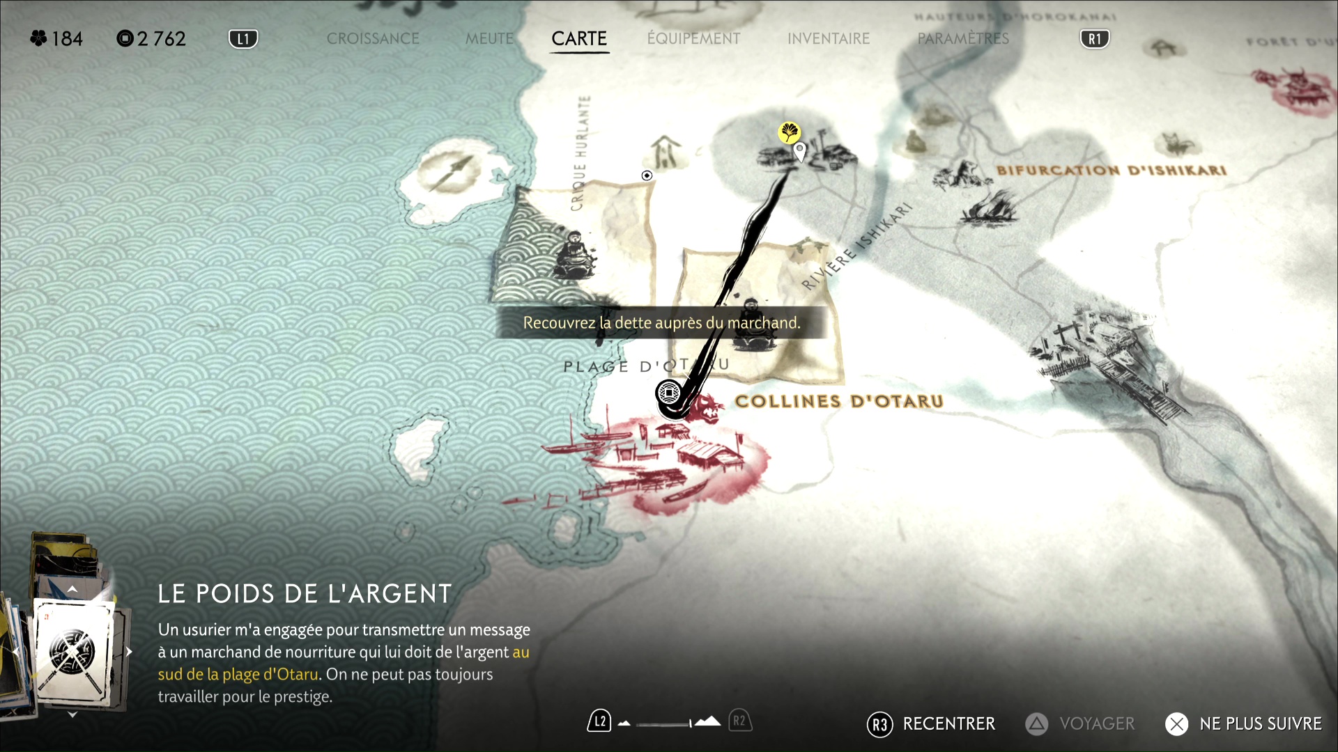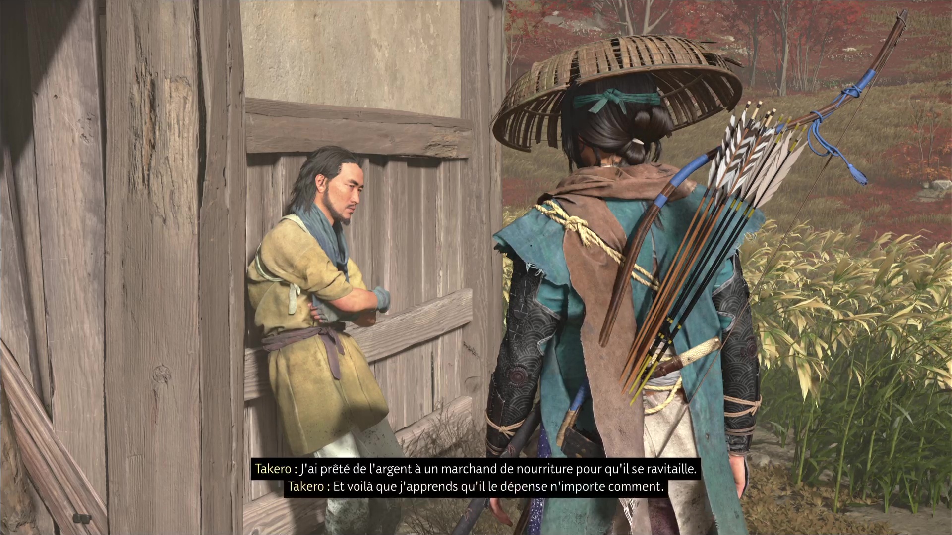 Au nord du Marché d’Ishikari, vous trouverez un usurier du nom de Takero. En passant près de lui, il vous interpellera. Parlez-lui pour découvrir son histoire. Il vous apprendra qu’il a prêté de l’argent à un marchand de nourriture, mais que ce dernier ne le dépense pas comme l’usurier l’entend.