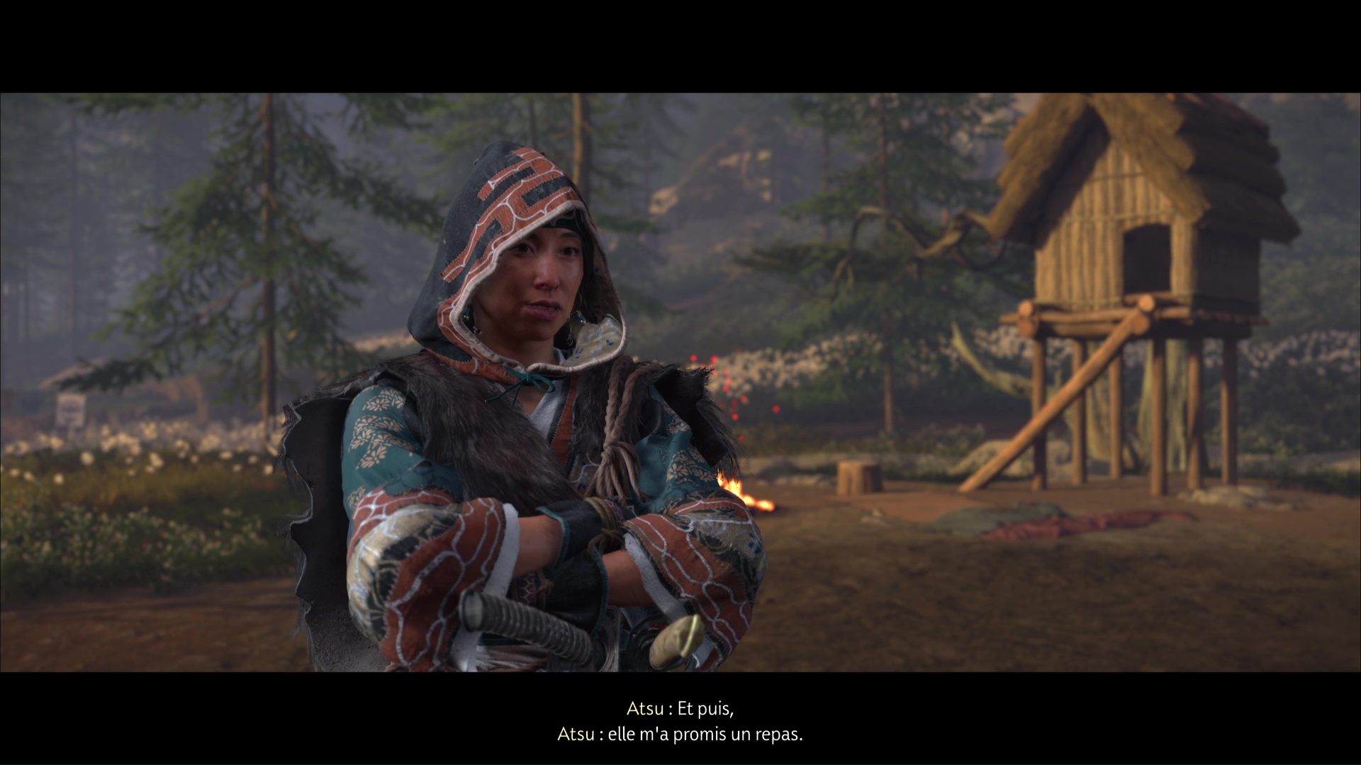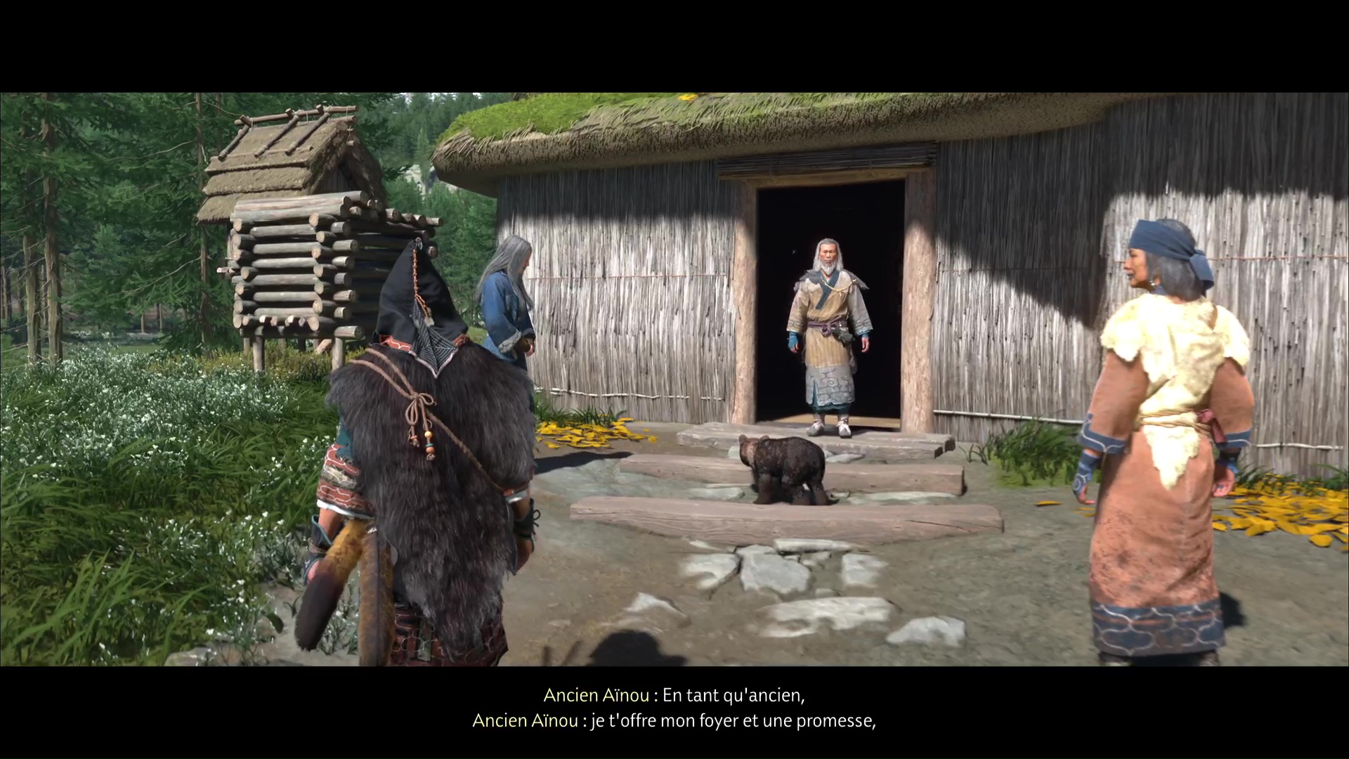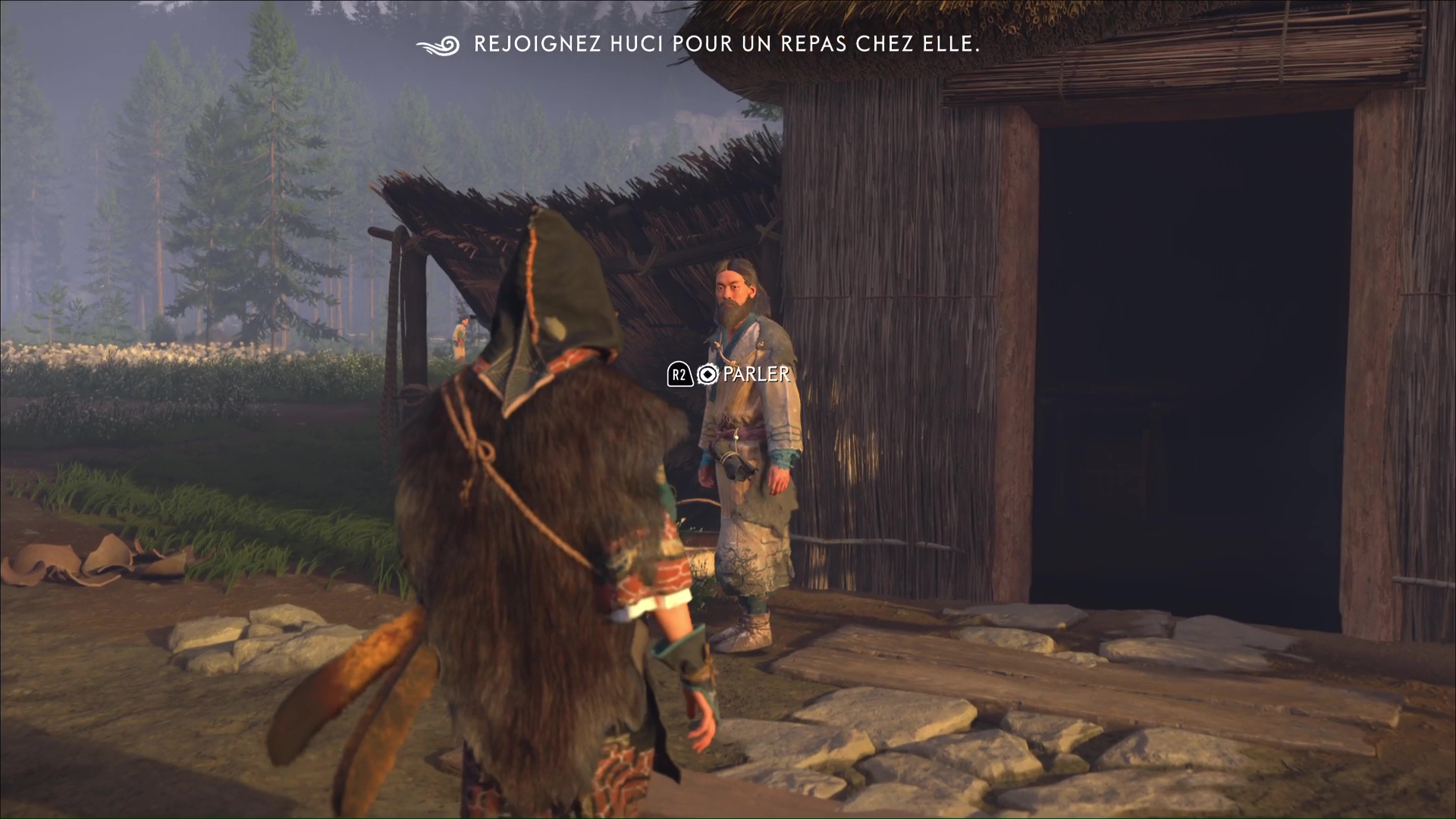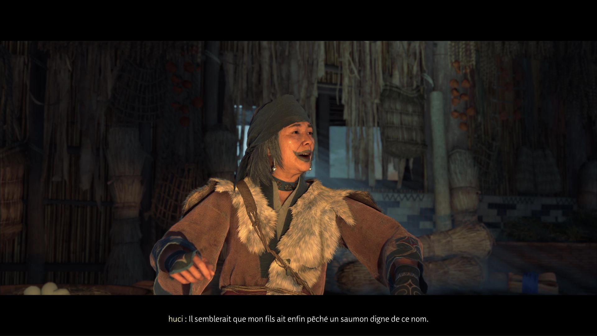 Votre arrivée dans les Terres sauvages de Nayoro de Ghost of Yōtei fut l’occasion de lancer le récit « Le cœur d’une aïnoue », en compagnie de huci, une femme aïnoue soucieuse de son peuple. Au terme de ce récit, elle a invité Atsu à venir partager un repas avec elle. Notre héroïne va donc s’adresser à son fils pour honorer cette invitation,