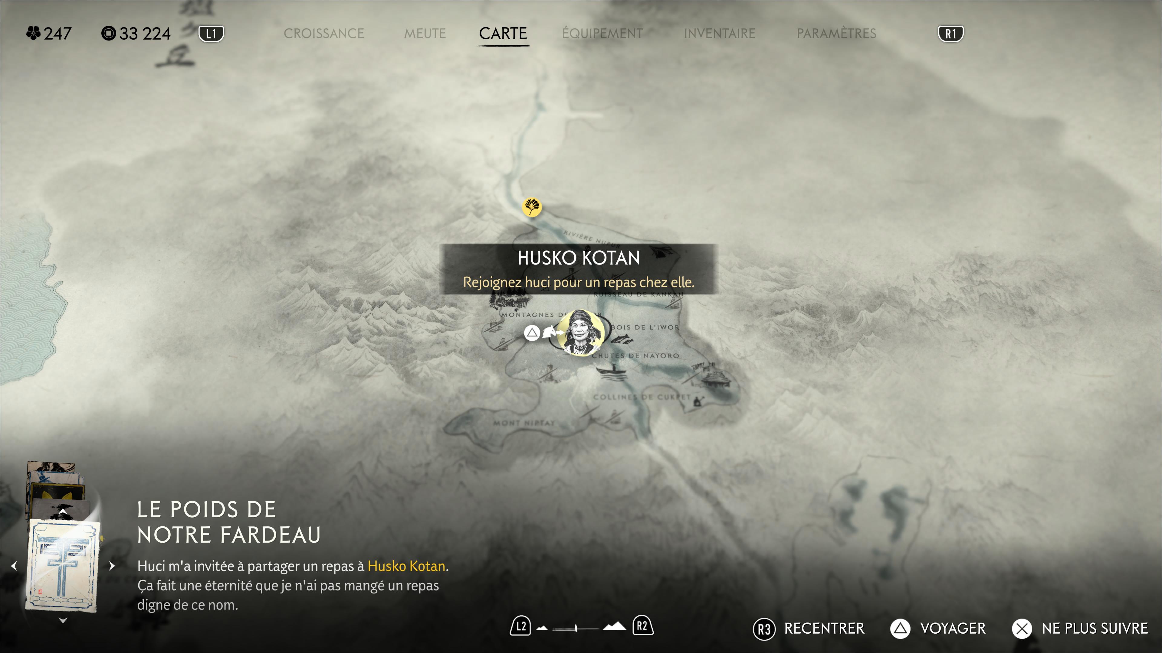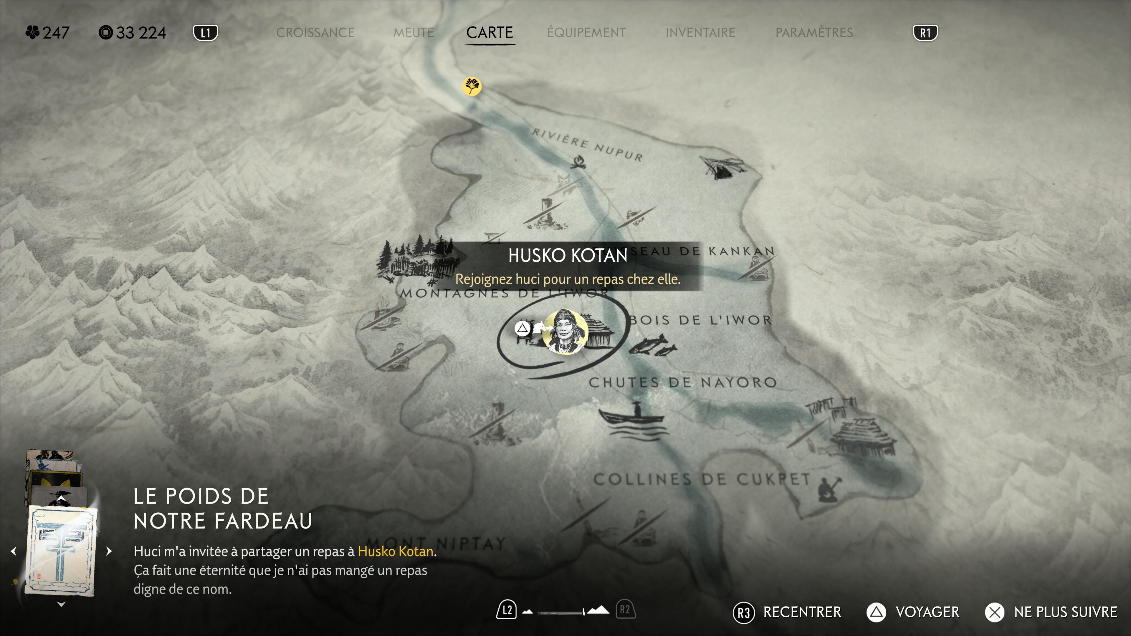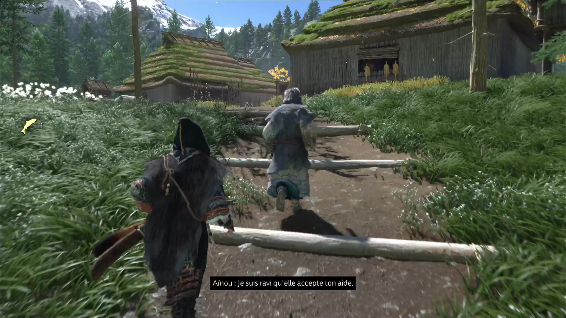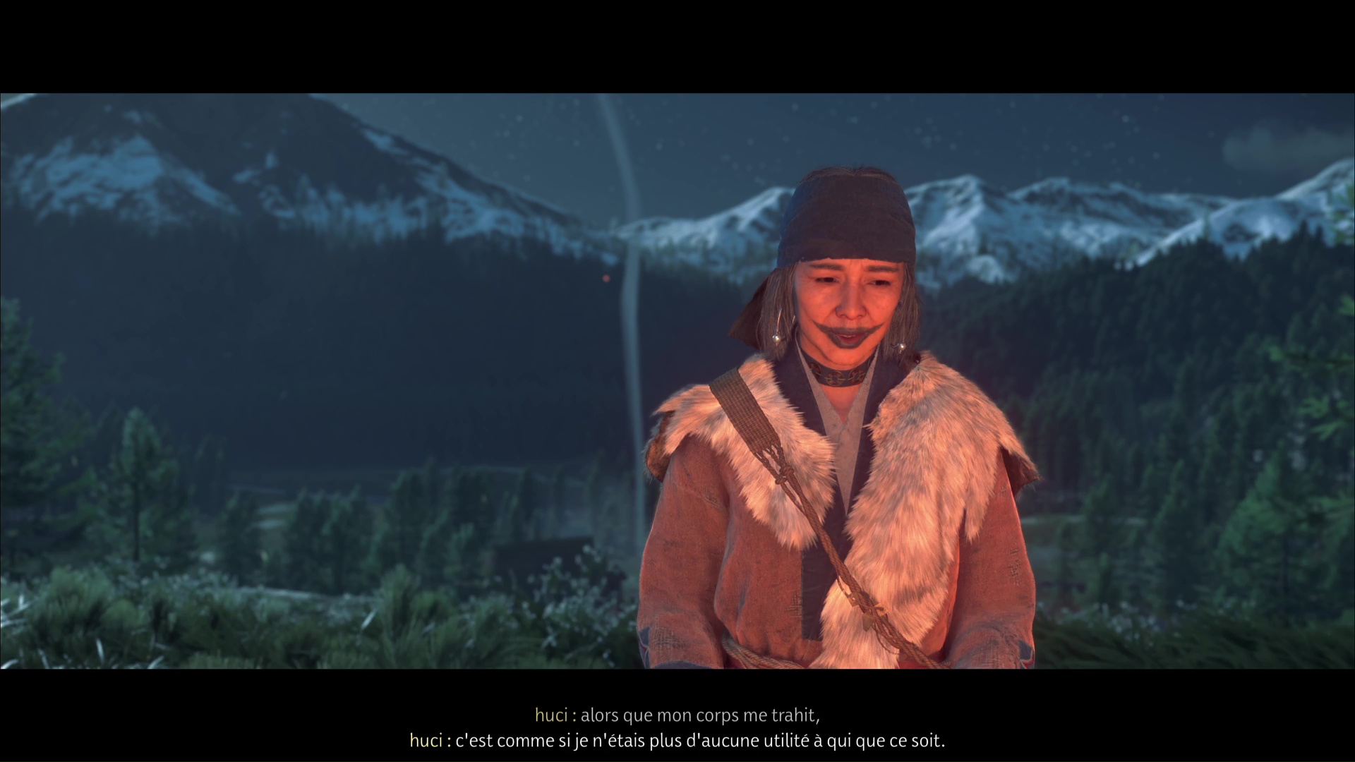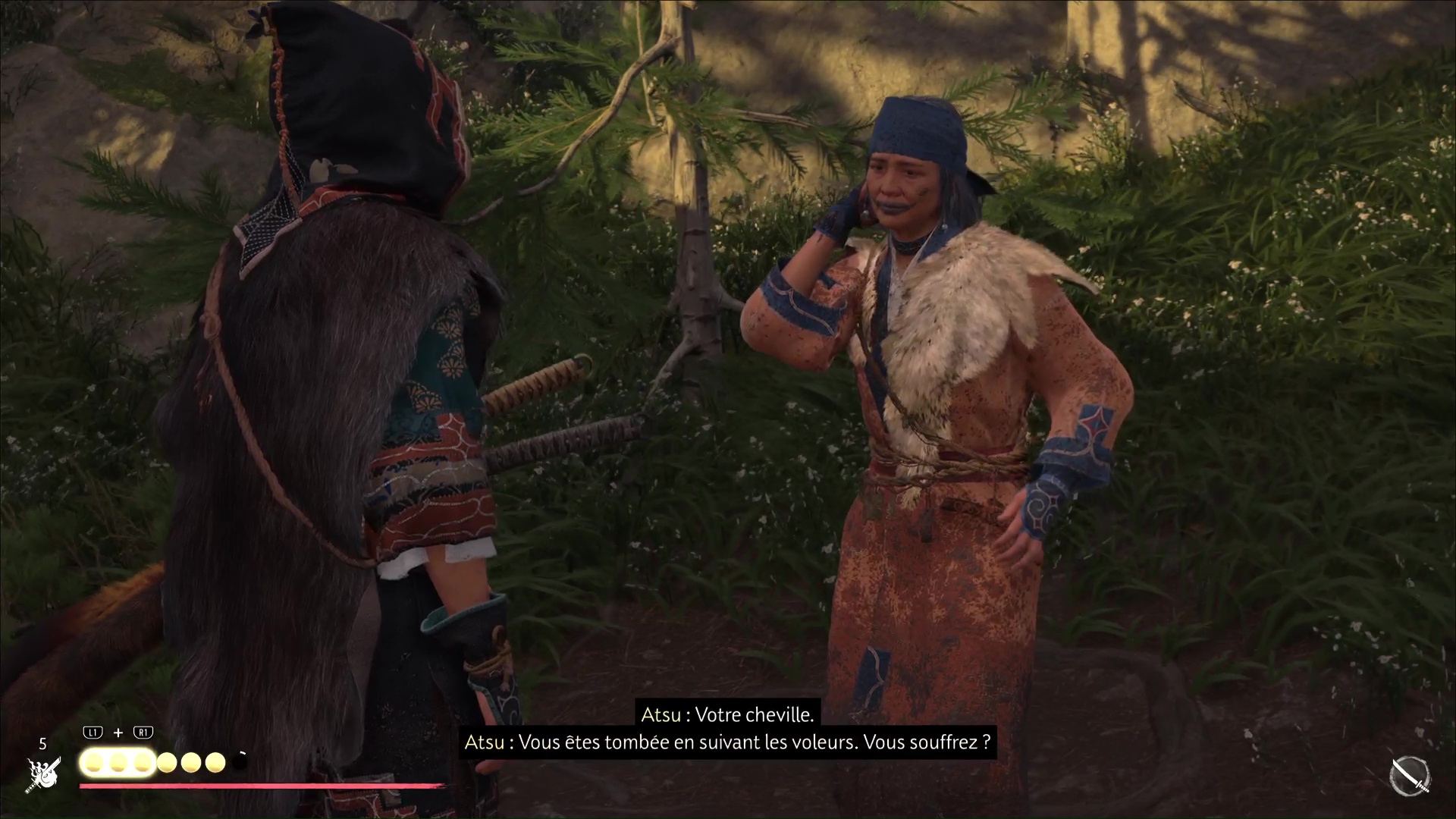 Votre arrivée dans les Terres sauvages de Nayoro de Ghost of Yōtei fut l’occasion de lancer le récit « Le cœur d’une aïnoue », en compagnie de huci, une femme aïnoue soucieuse de son peuple. Au terme de ce récit, elle a invité Atsu à venir partager un repas avec elle. Notre héroïne va donc s’adresser à son fils pour honorer cette invitation,