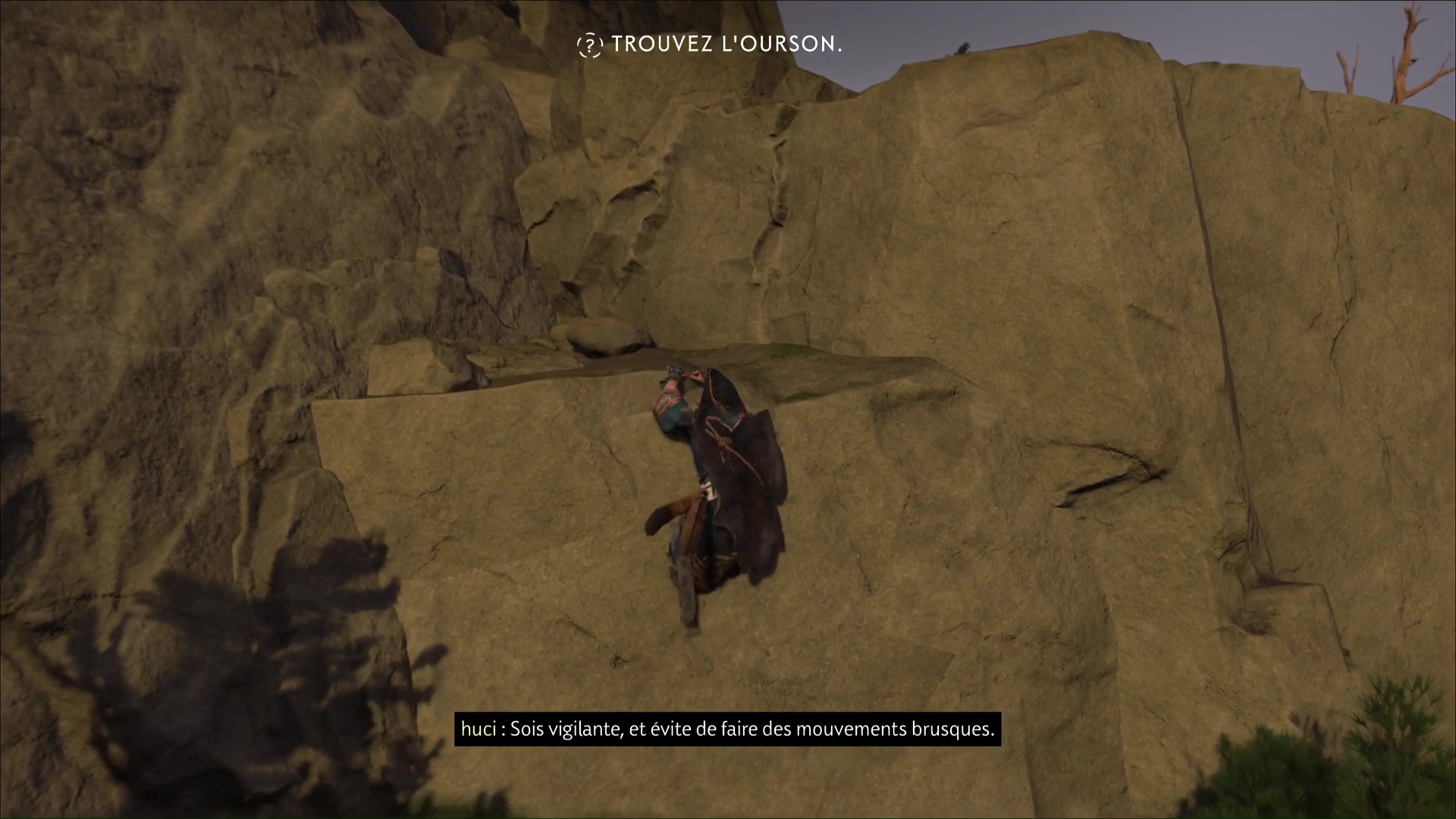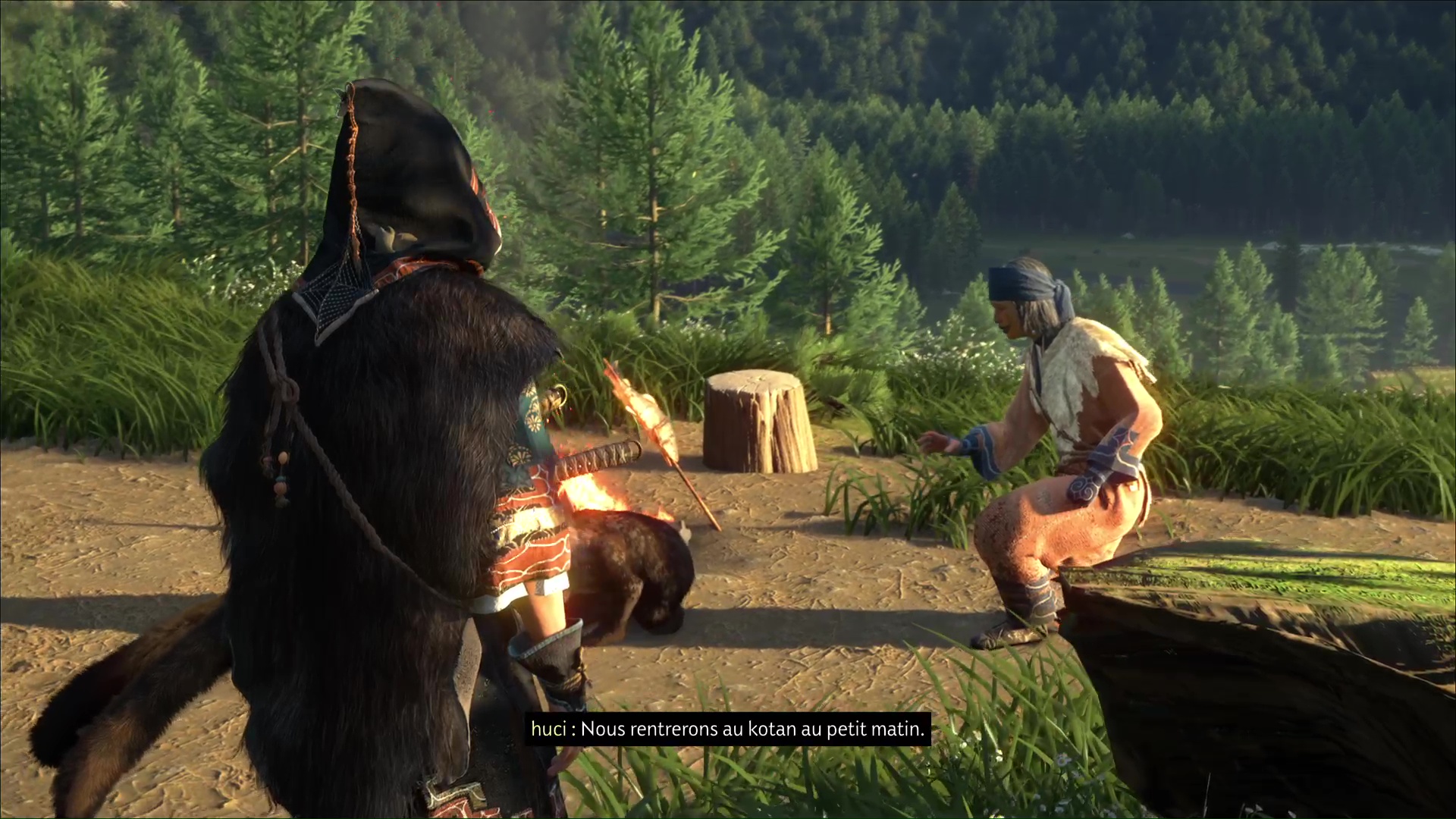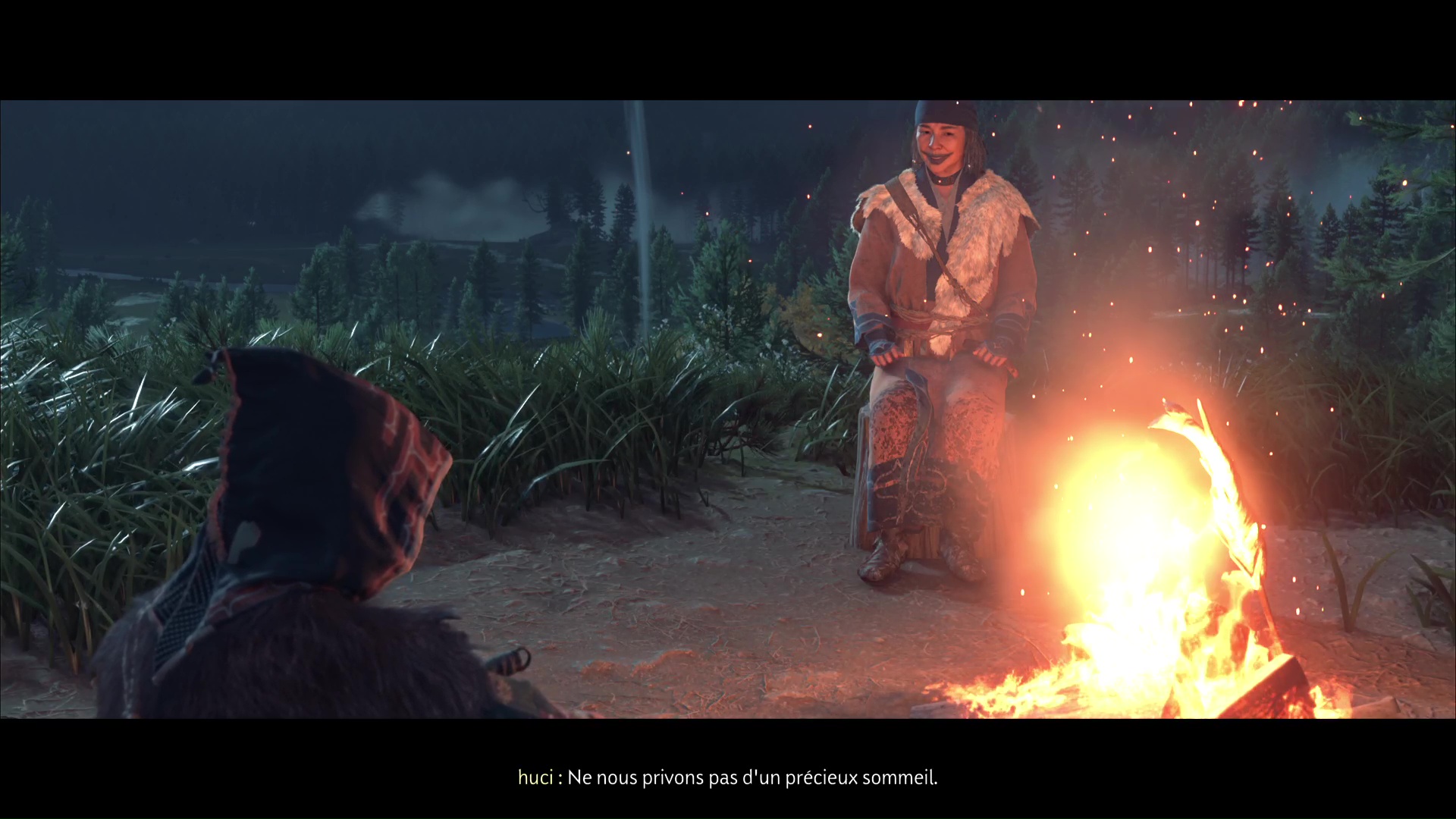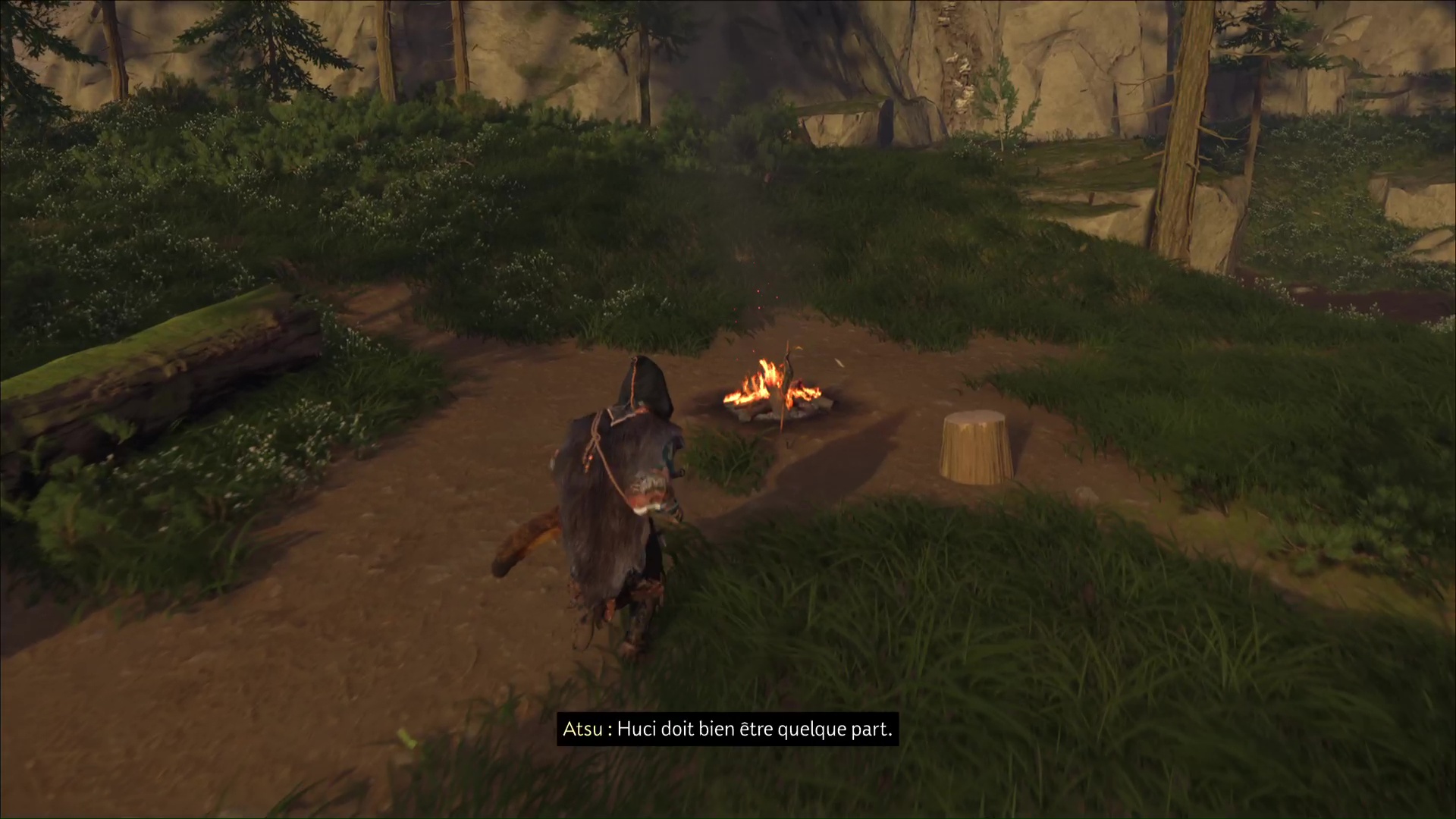 Escaladez-les et vous débarquerez près d’un feu. Huci se trouve juste un peu plus loin en contrebas. Rejoignez-la grâce au tronc couché et parlez-lui.