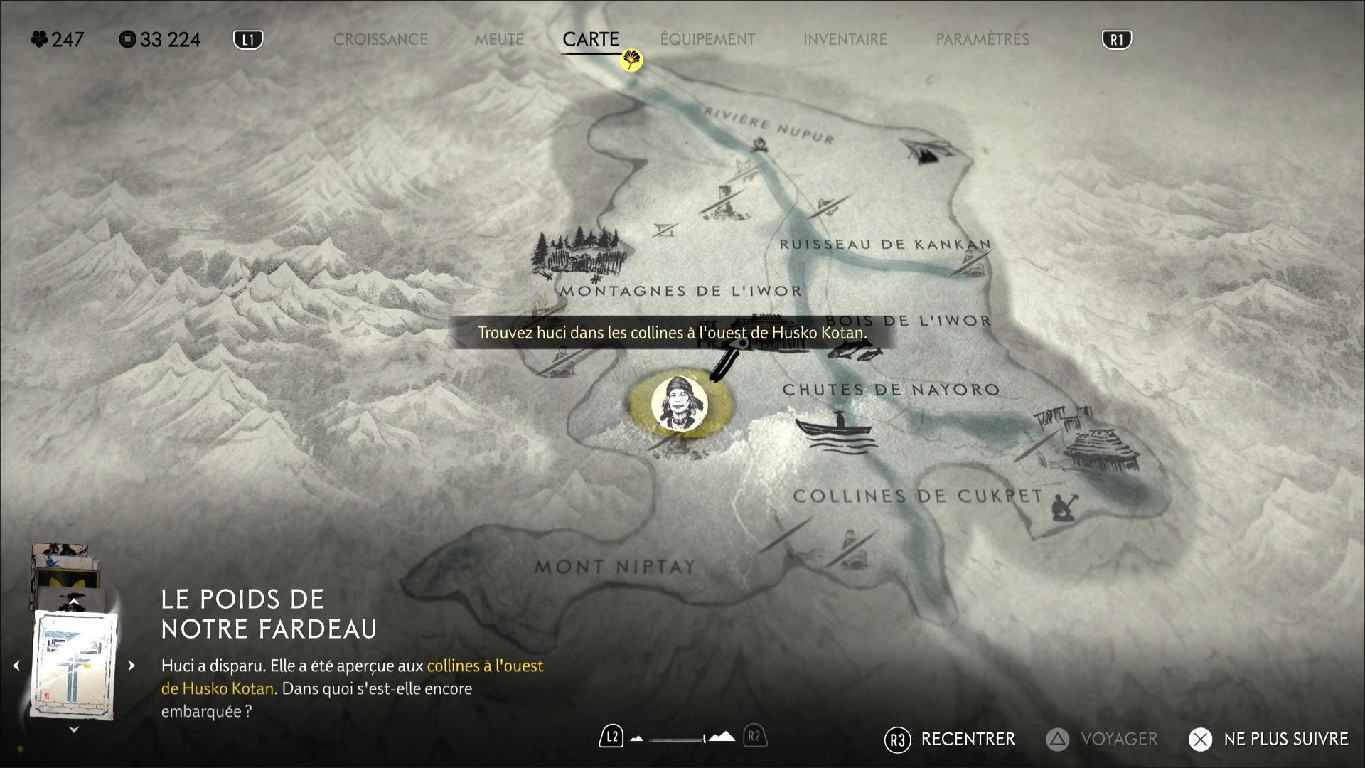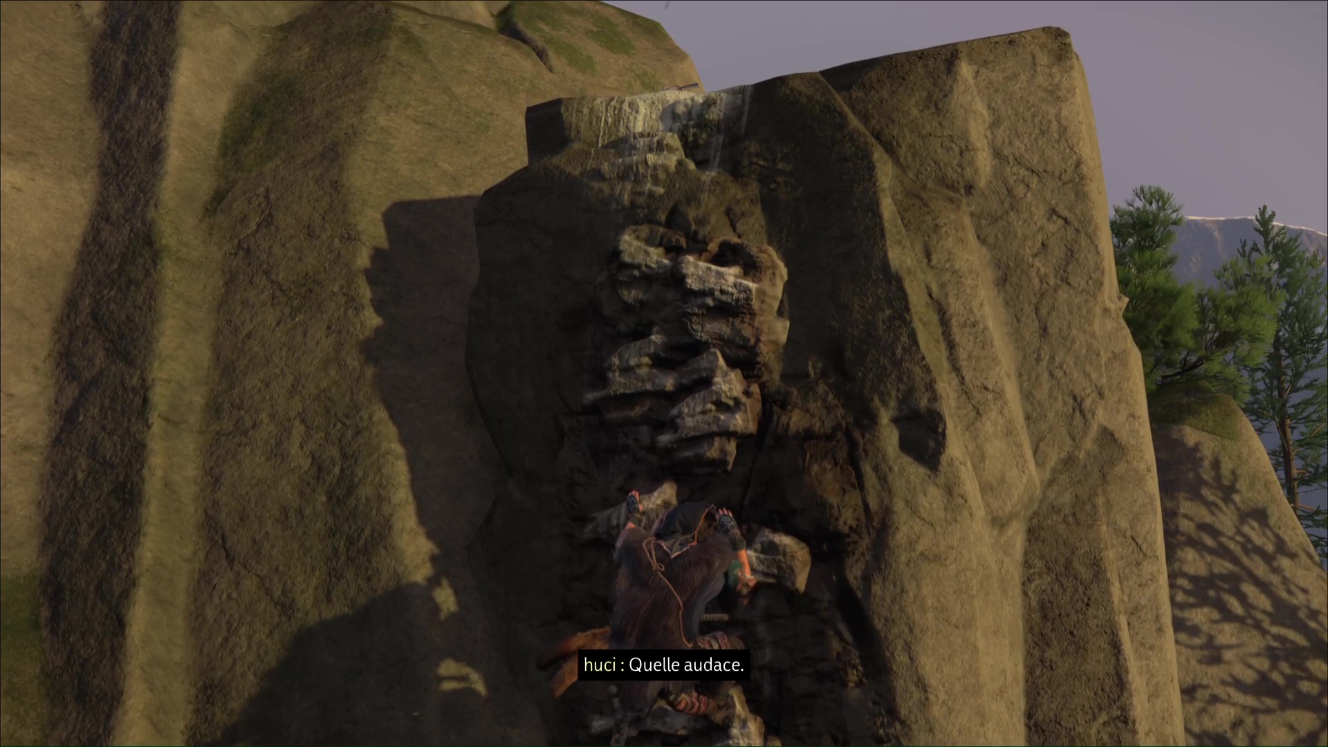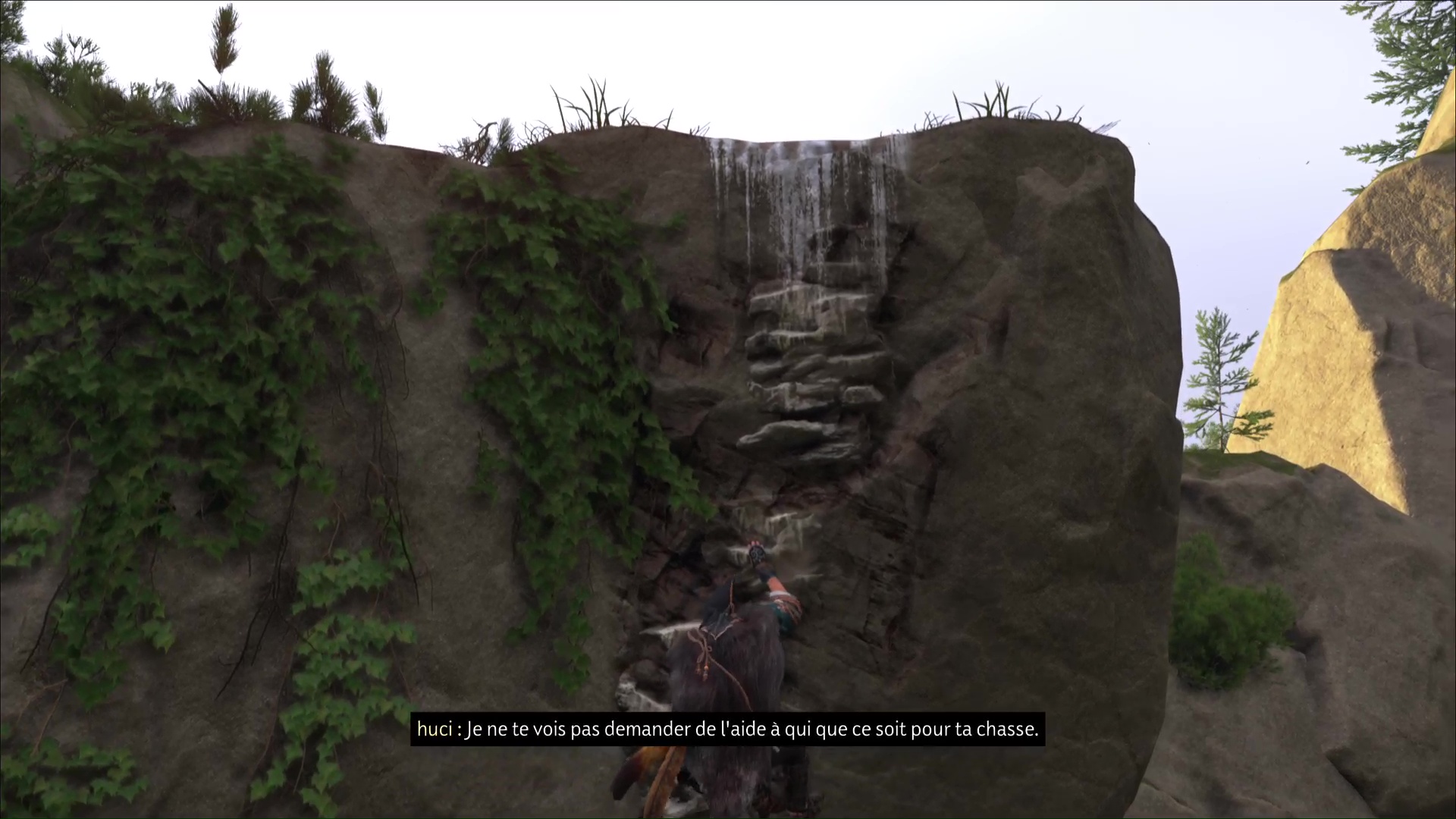Parlez-lui et, forcément, il vous révèle que huci est en vadrouille. Elle cueille des herbes dans les montagnes au sud-ouest. Dirigez-vous vers le repère jusqu’à tomber devant des parois rocheuses.
