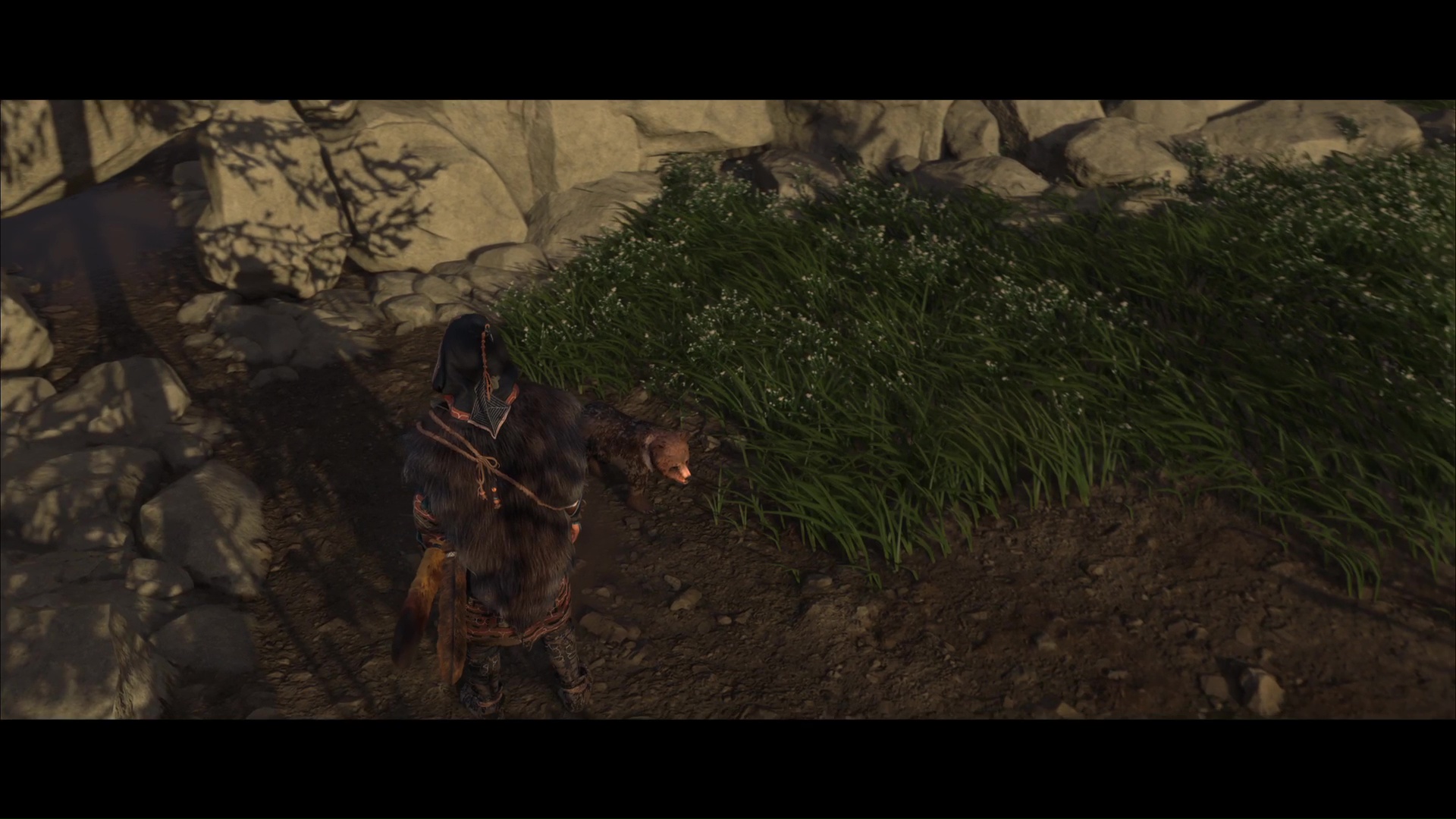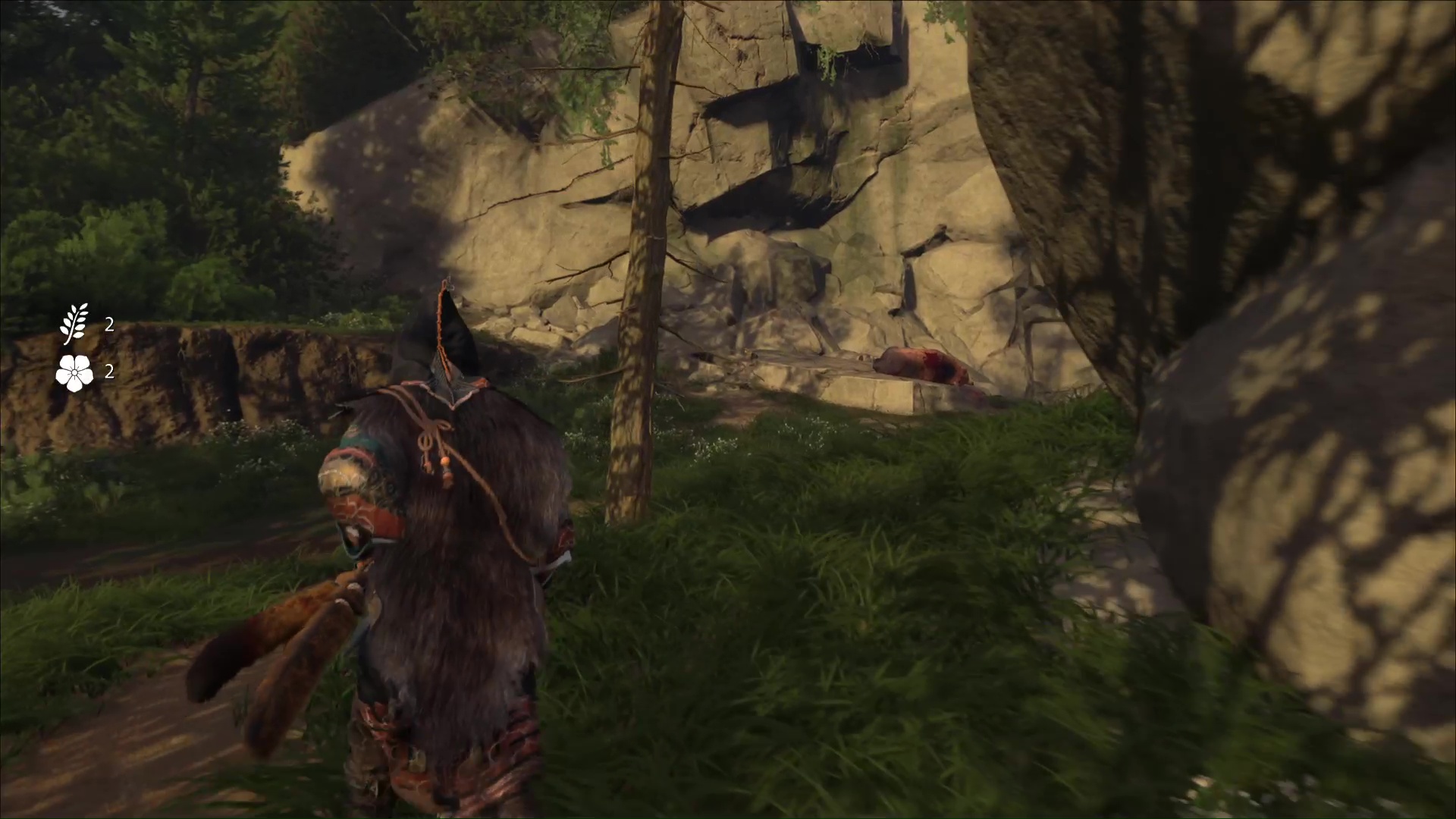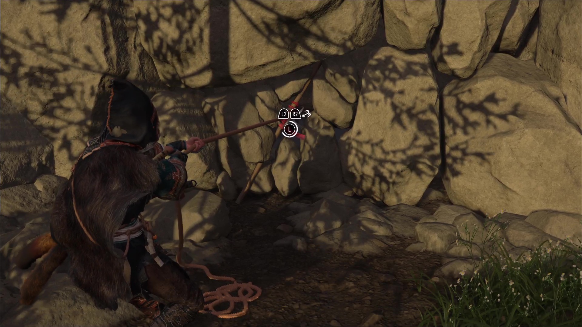 Vous constatez que la pauvre maman ourse est morte et que le petit est coincé derrière un éboulement. Avec votre grappin, tirez pour que l’ourson puisse sortir. Hélas, il a peur et n’ose pas se montrer. Sortez votre shamisen et jouez un petit air pour le mettre en confiance. Il va alors sortir et vous suivre.