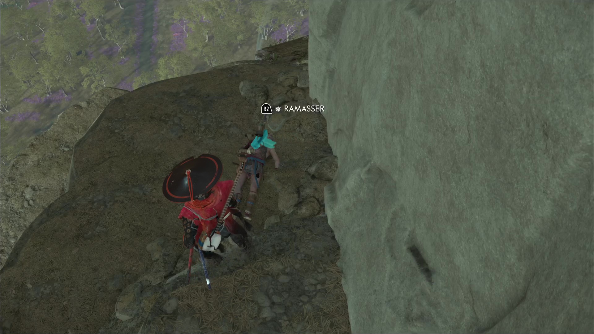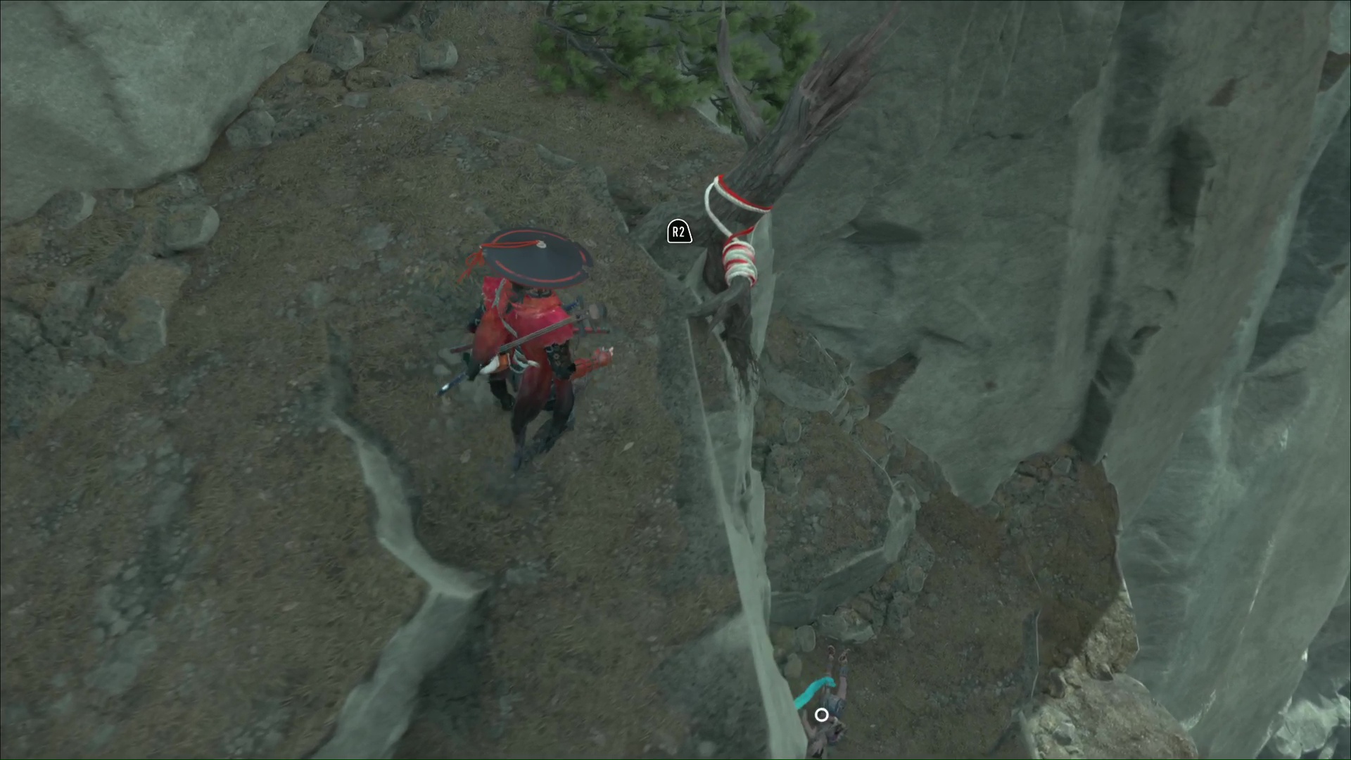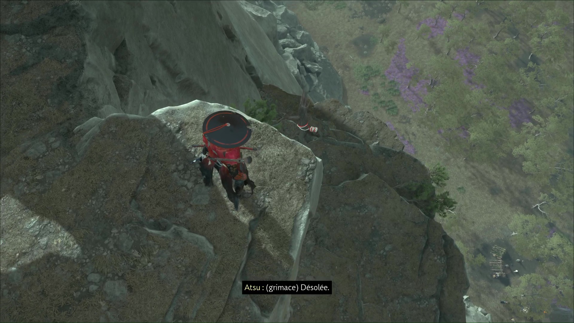 Allez-y et faites le tour du grand arbre par la droite. Au bord de la falaise, un tronc vous attend. Accrochez-vous dessus au grappin et descendez. Poursuivez cette descente grâce à des prises rocheuses.