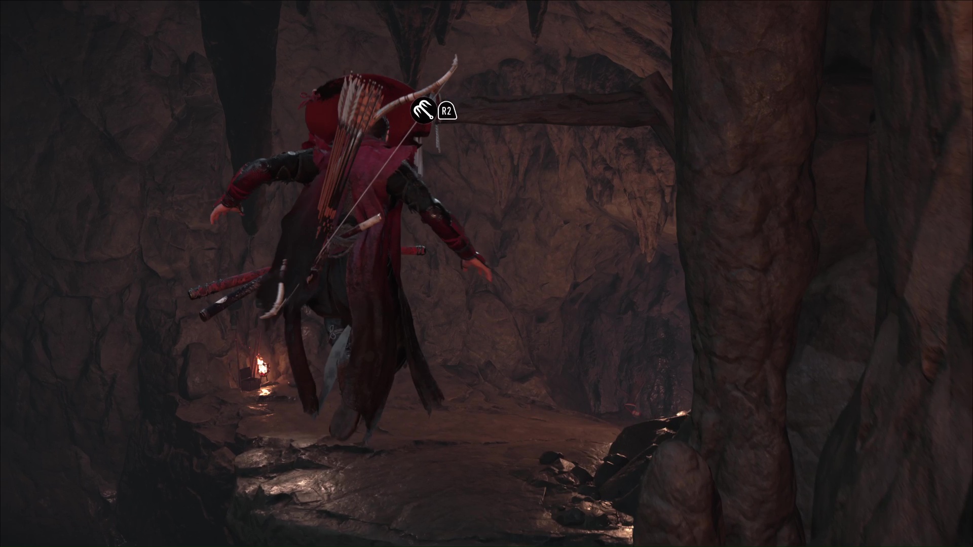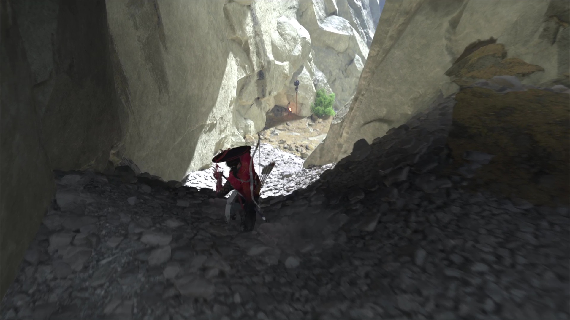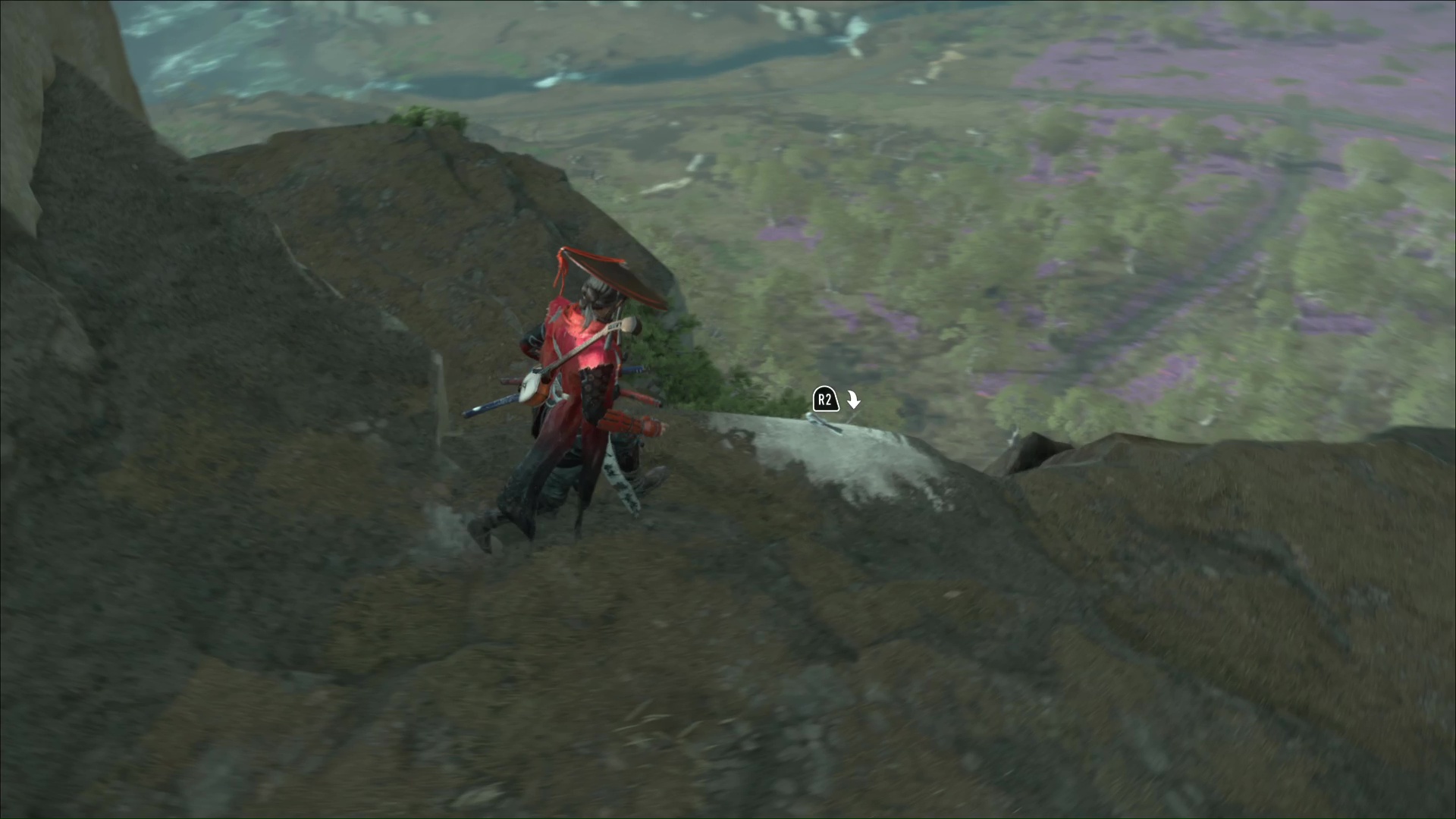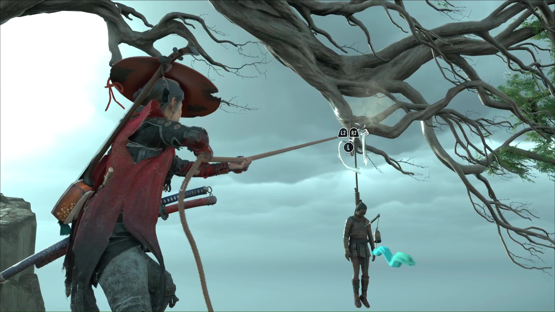 Allez-y et faites le tour du grand arbre par la droite. Au bord de la falaise, un tronc vous attend. Accrochez-vous dessus au grappin et descendez. Poursuivez cette descente grâce à des prises rocheuses.