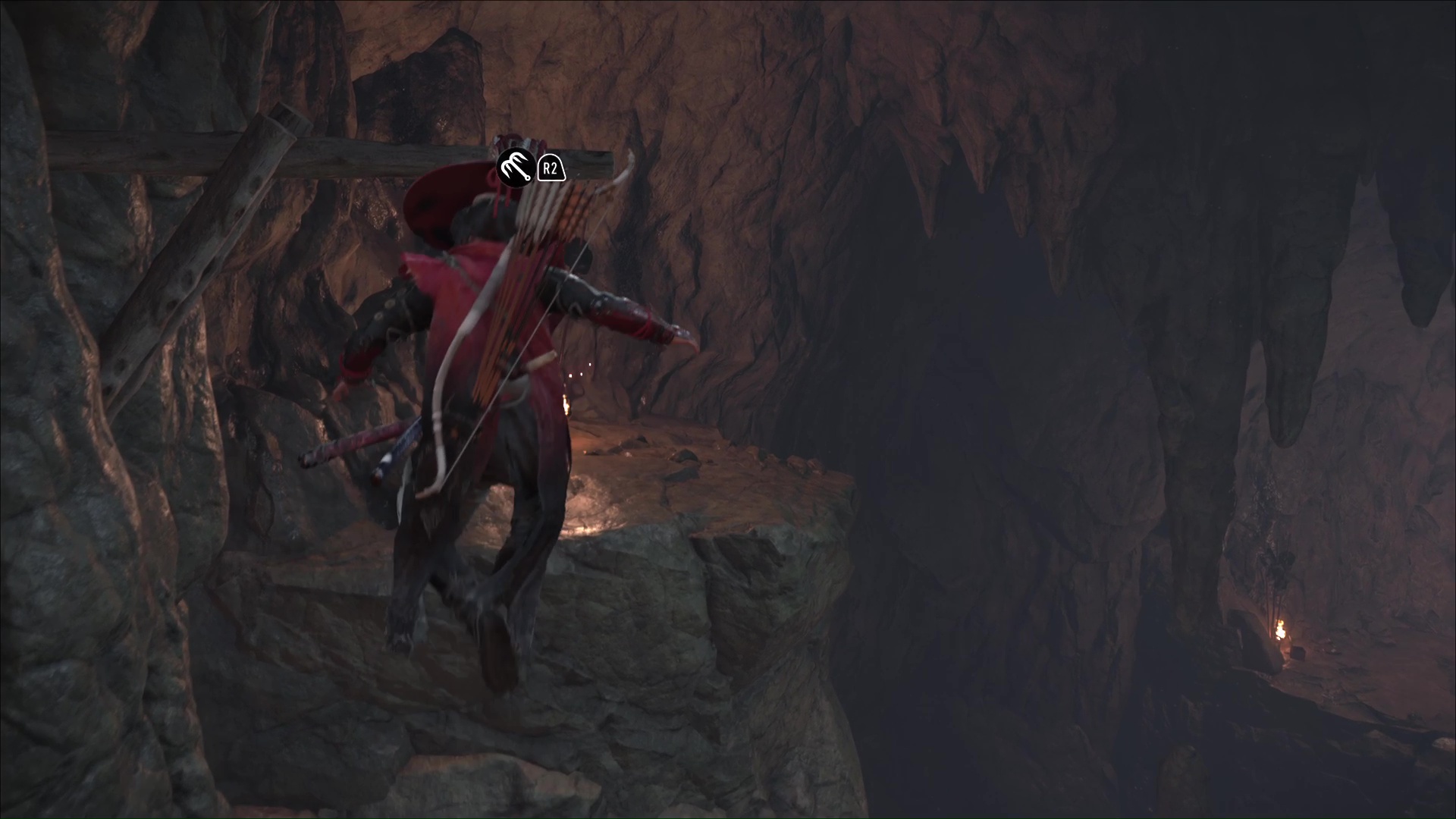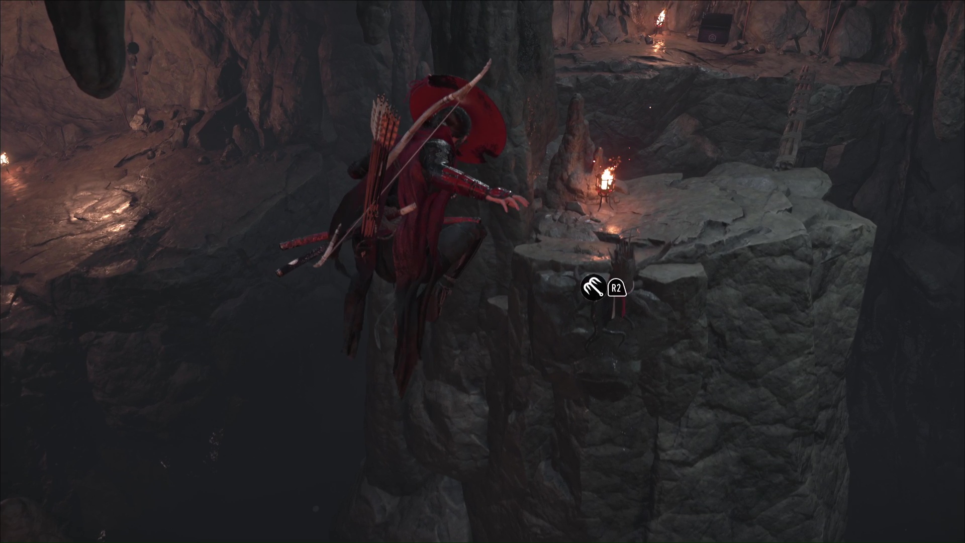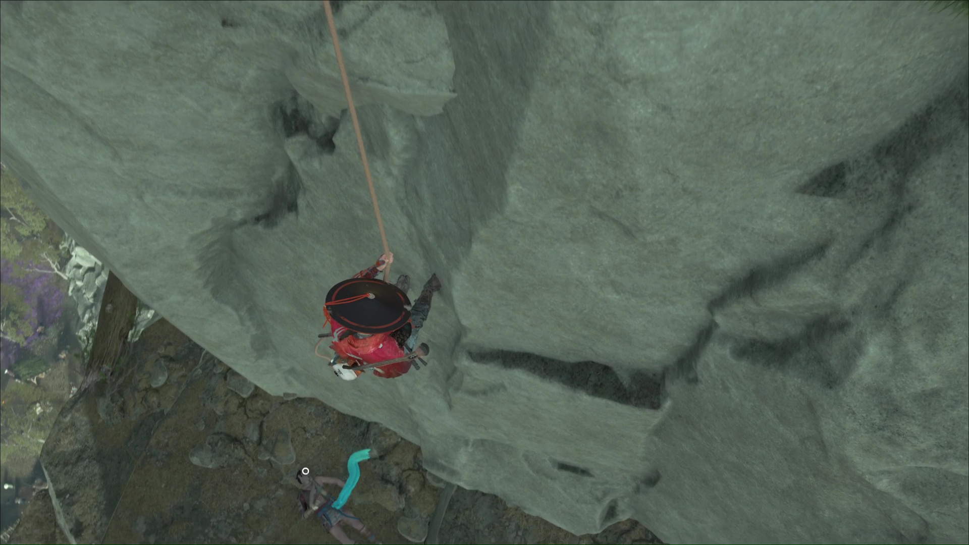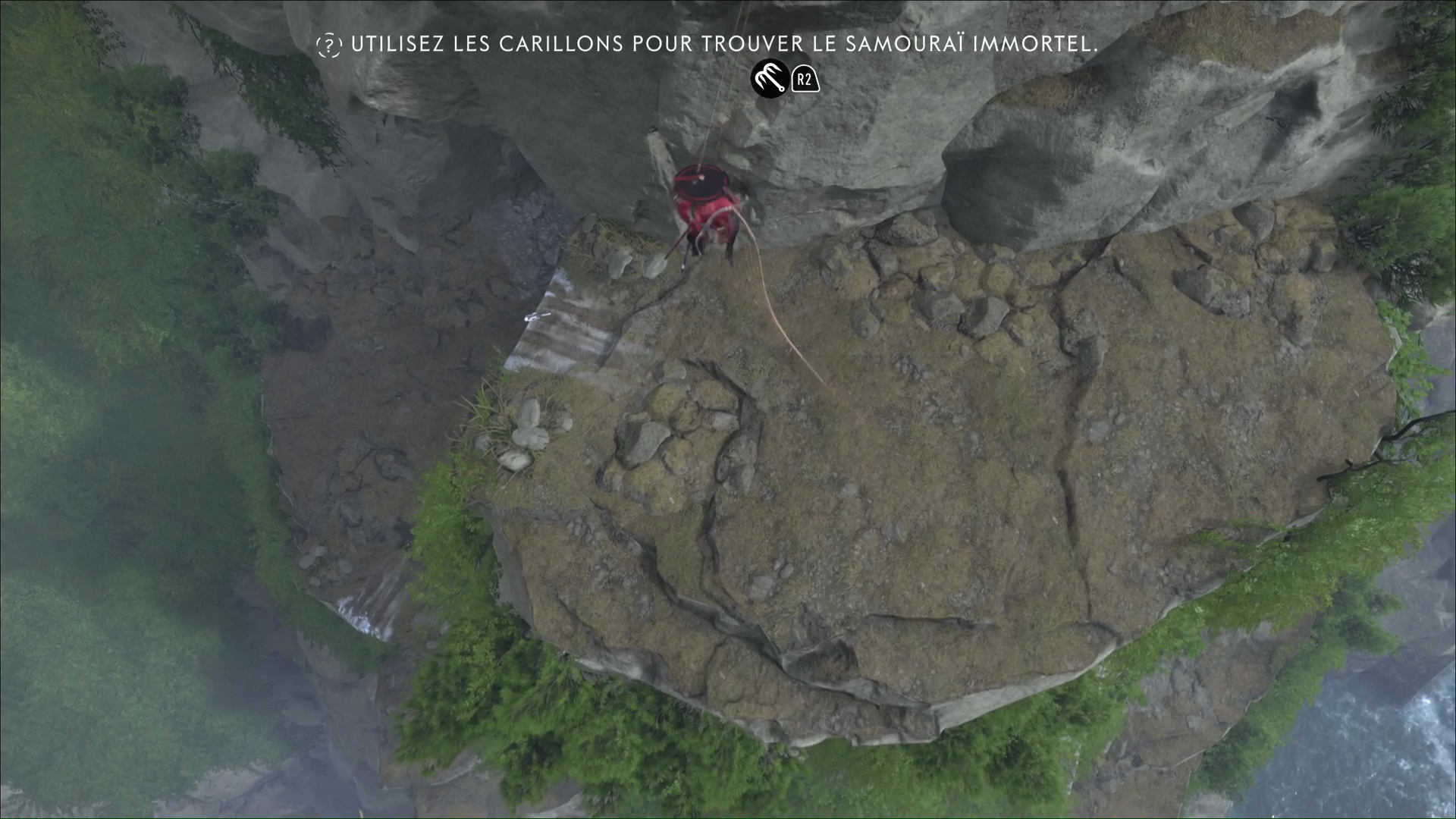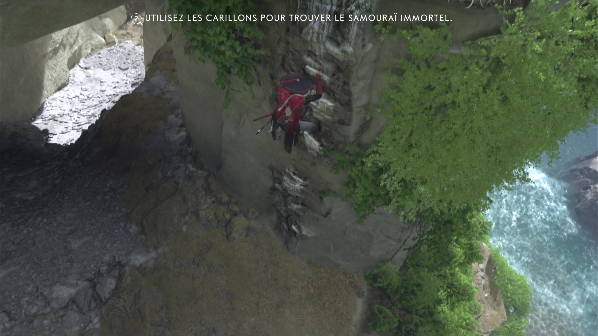Avec votre grappin, tirez sur la corde pour faire tomber le carillon. Hélas, il tombe plus bas dans les falaises. Près de vous, sur la droite, descendez des prises murales pour rejoindre le corps.