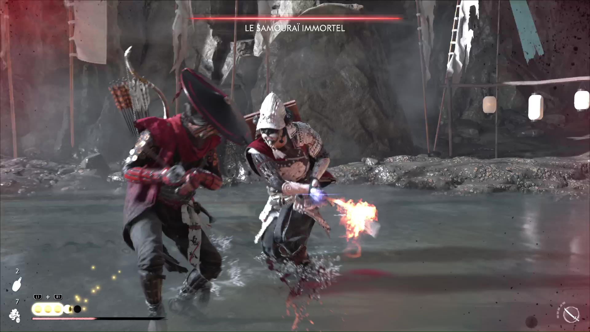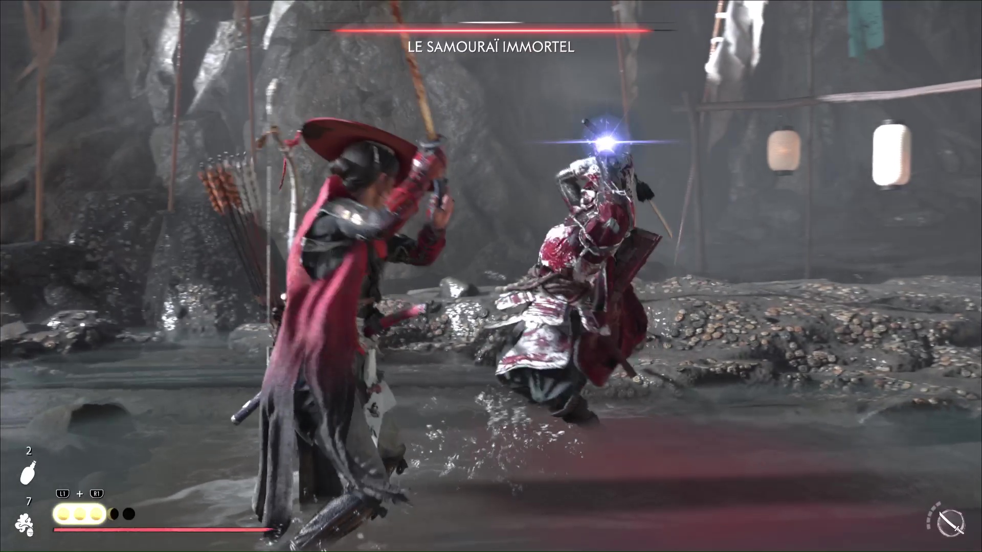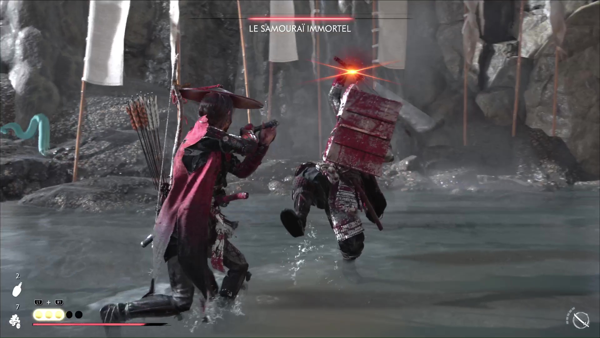 Le samouraï sortira aussi un bouclier, accompagné d’attaques rouges. Vous pourrez détruire ce bouclier avec le kusarigama, si vous l’avez.