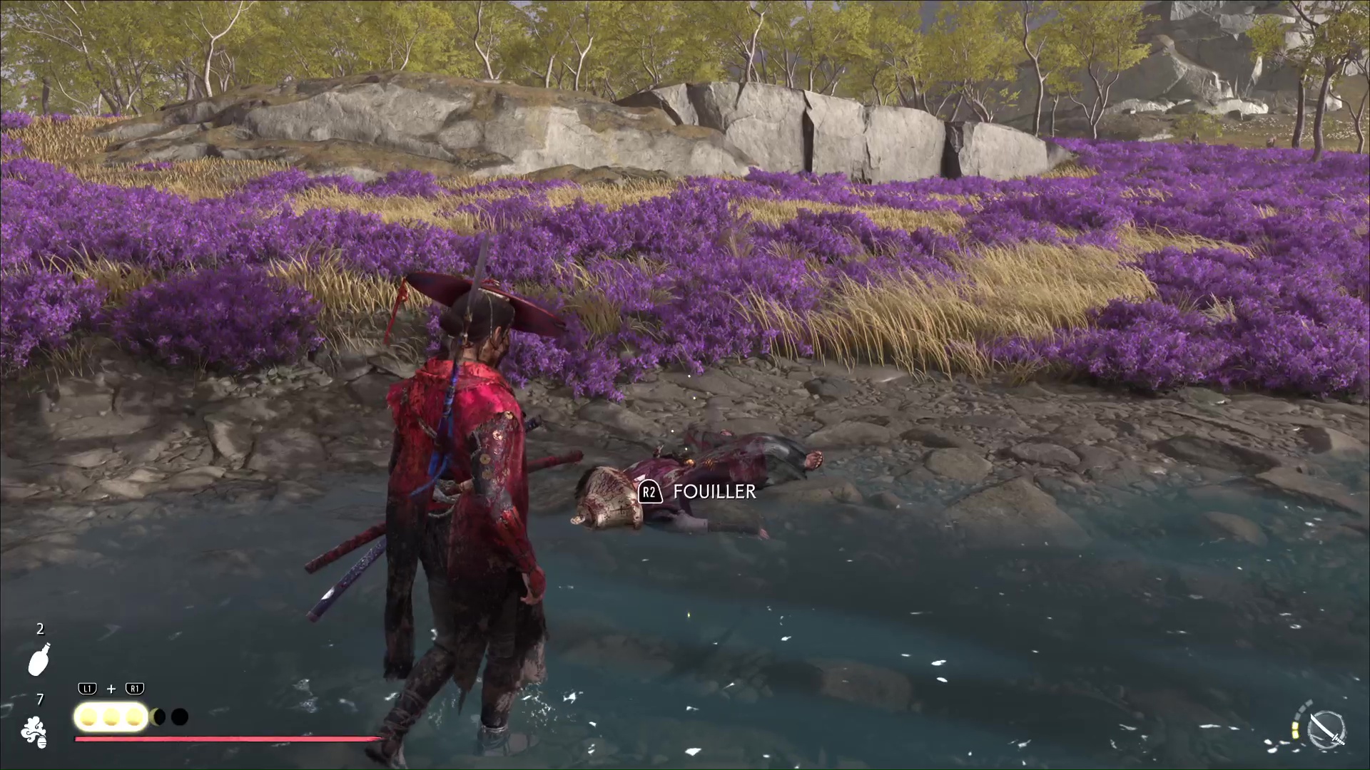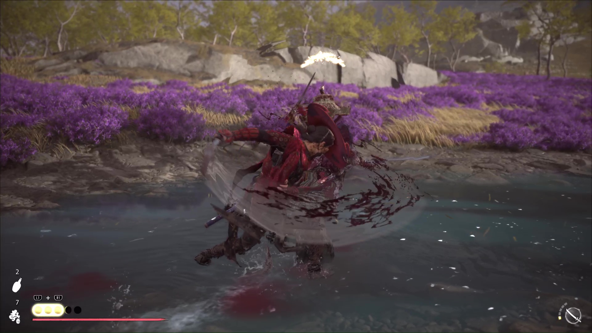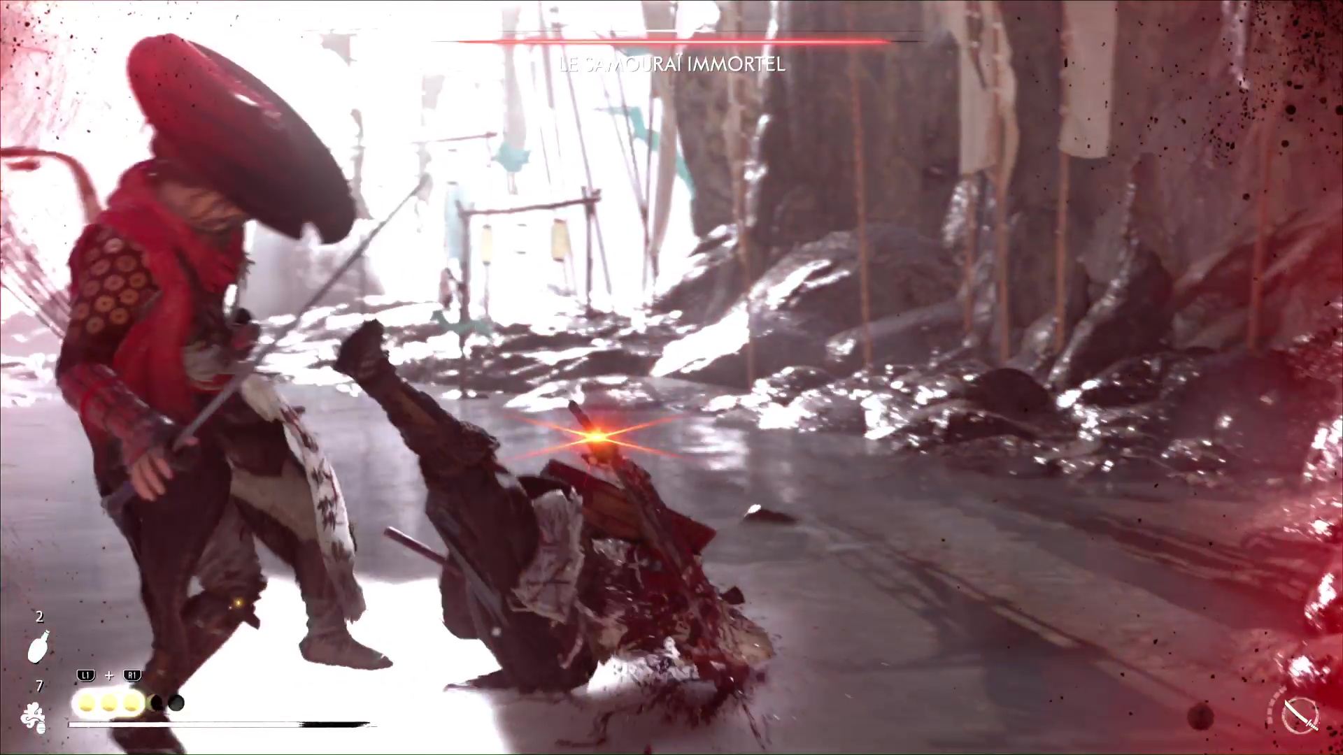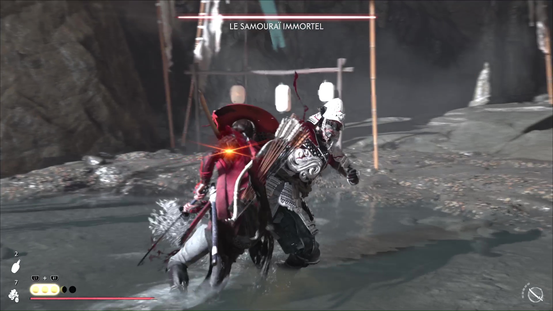 Le samouraï sortira aussi un bouclier, accompagné d’attaques rouges. Vous pourrez détruire ce bouclier avec le kusarigama, si vous l’avez.