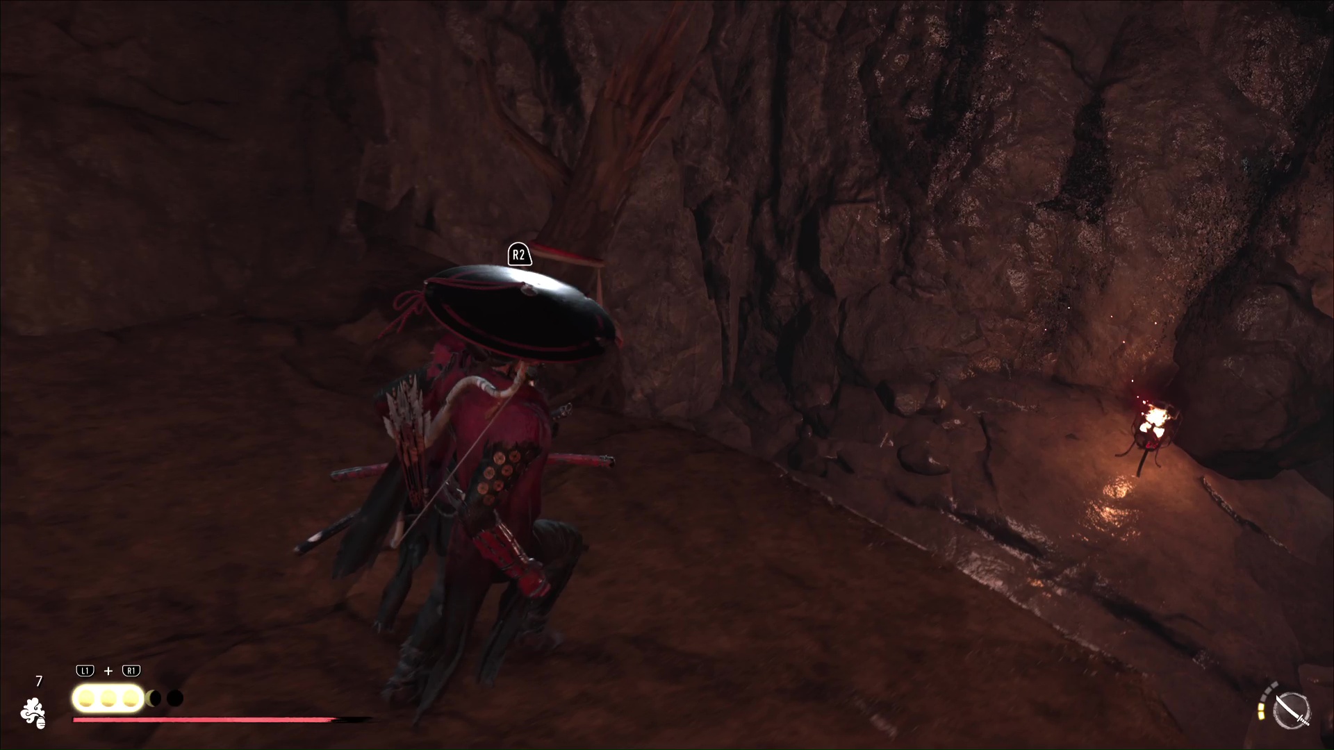 En bas, préparez-vous à glisser sur une pente, au bout de laquelle vous devrez passer à travers une ouverture. Vous voici dans une grotte. Franchissez le petit pont de bambous puis sautez au grappin pour arriver en face.
