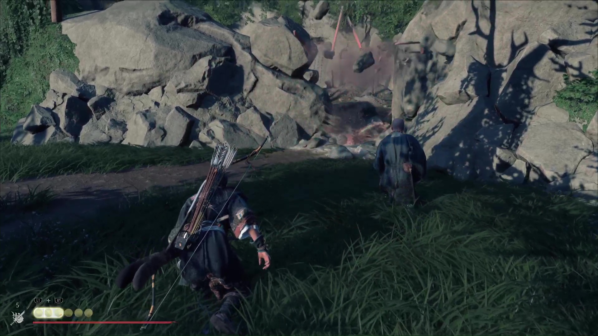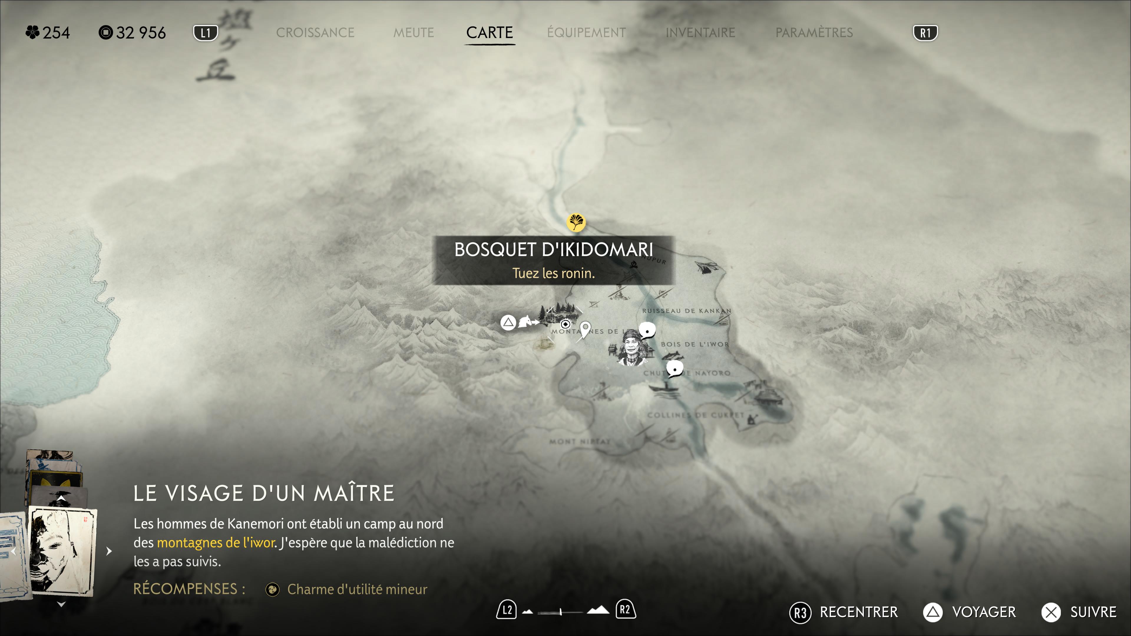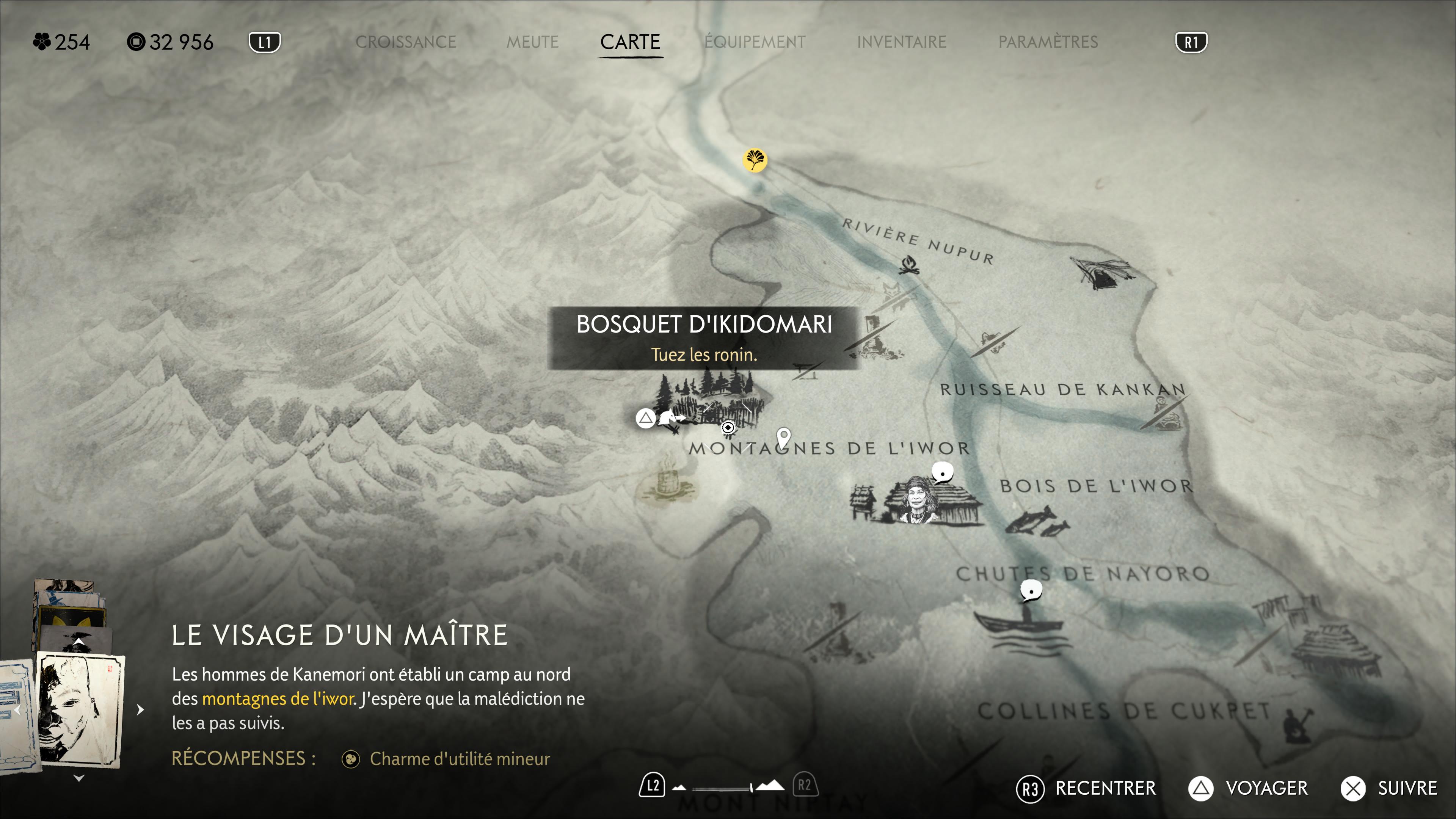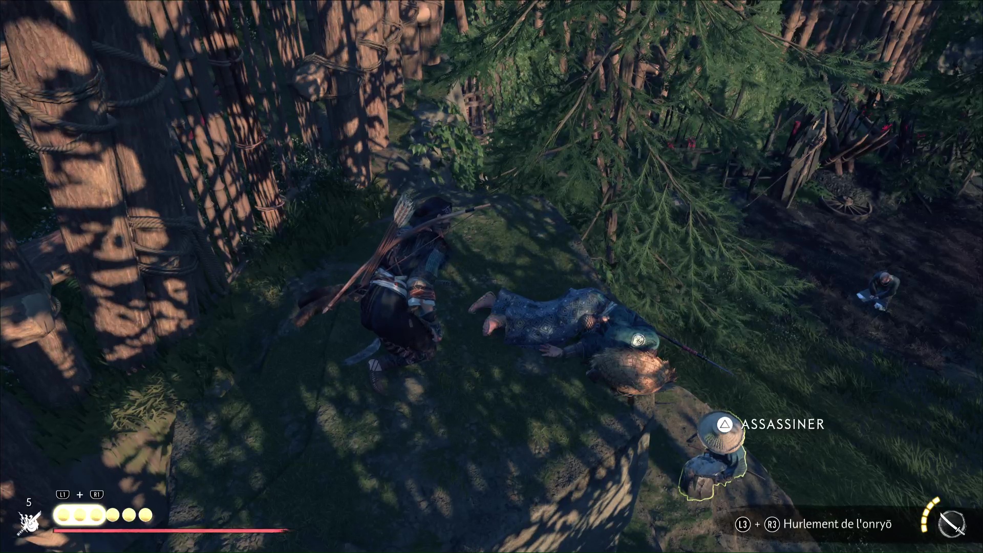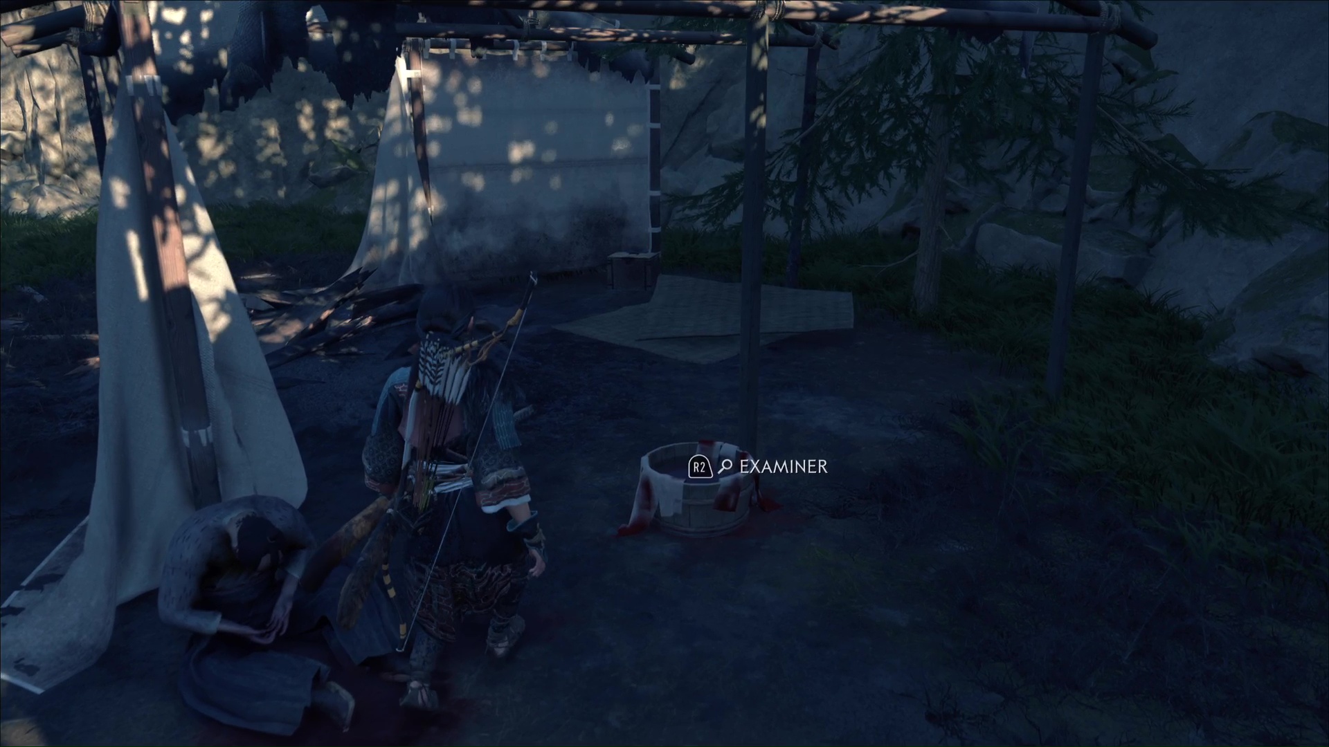 Au nord des Montagnes de l’Iwor des Terres sauvages de Nayoro s’étend le Bosquet d’Ikidomari. En approchant d’une espèce de camp, vous remarquerez la présence de ronin, menaçant un civil. Vous pouvez lancer une Confrontation ou bien tenter d’être un peu plus furtif. En faisant face au camp, contournez par la gauche et éliminez le ronin en hauteur.