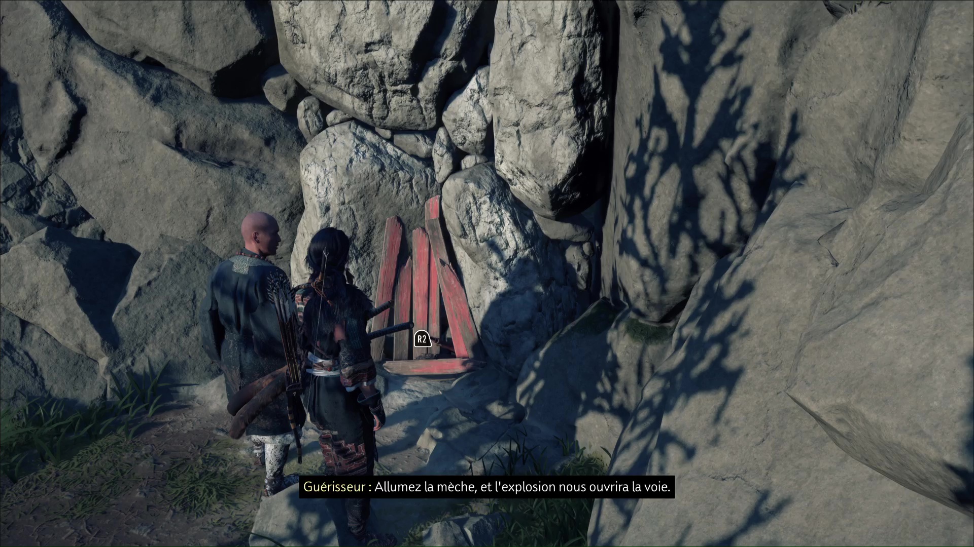Ce n’est pas suffisant pour savoir ce qui s’est réellement passé. Suivez le guérisseur jusqu’à un mur destructible. Laissez-le préparer de la poudre noire, puis appuyez sur le bouton affiché à l’écran pour déclencher une explosion.