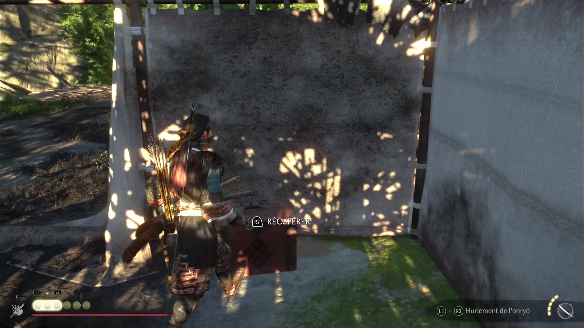 En haut, allez fouiller la tente sur la gauche pour ouvrir un coffre. À l’intérieur repose le Charme de détermination maladive. Lisez ensuite, en face, le rouleau posé sur une étagère afin de connaître la localisation de la dépouille de Kanemori.