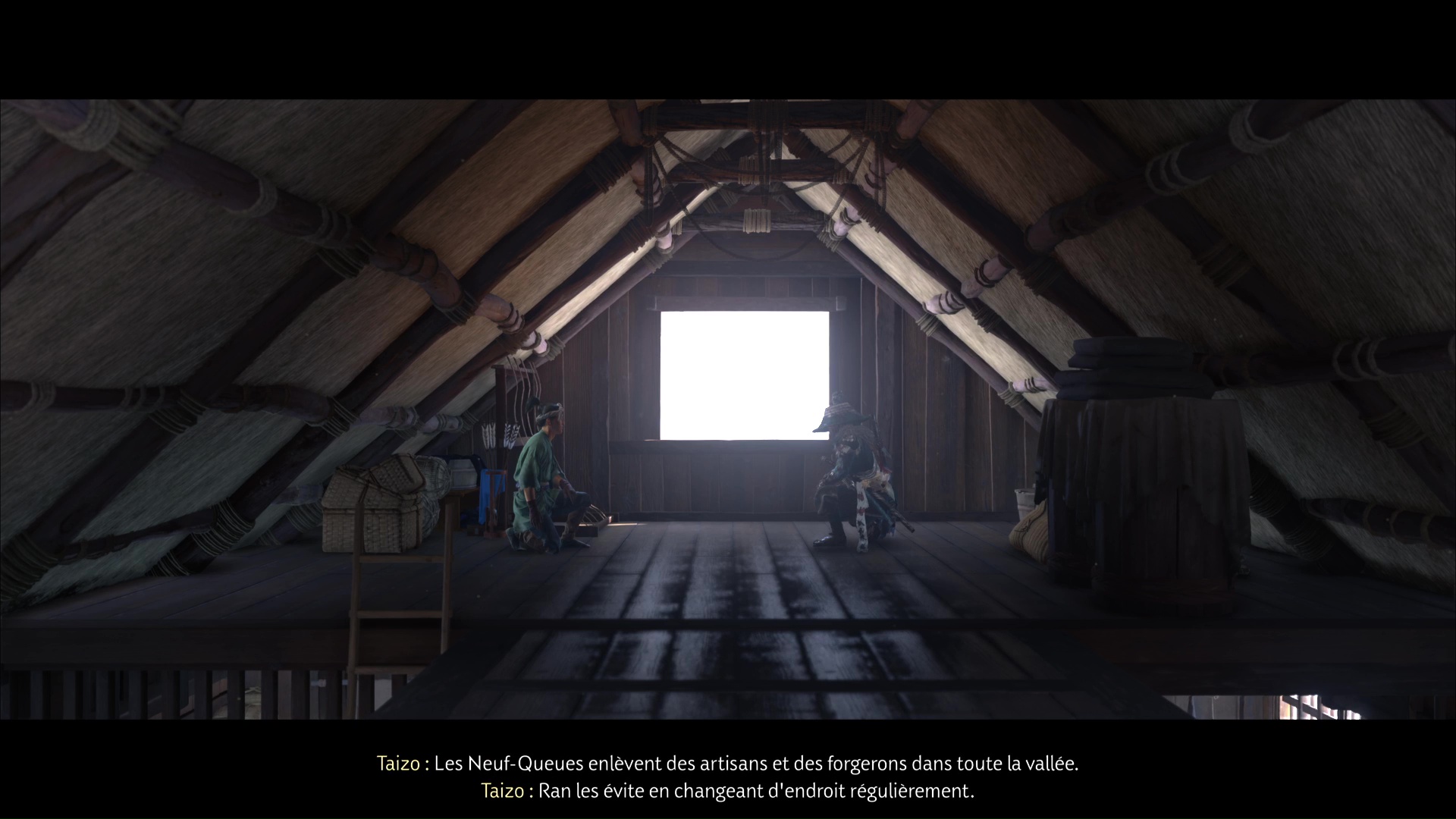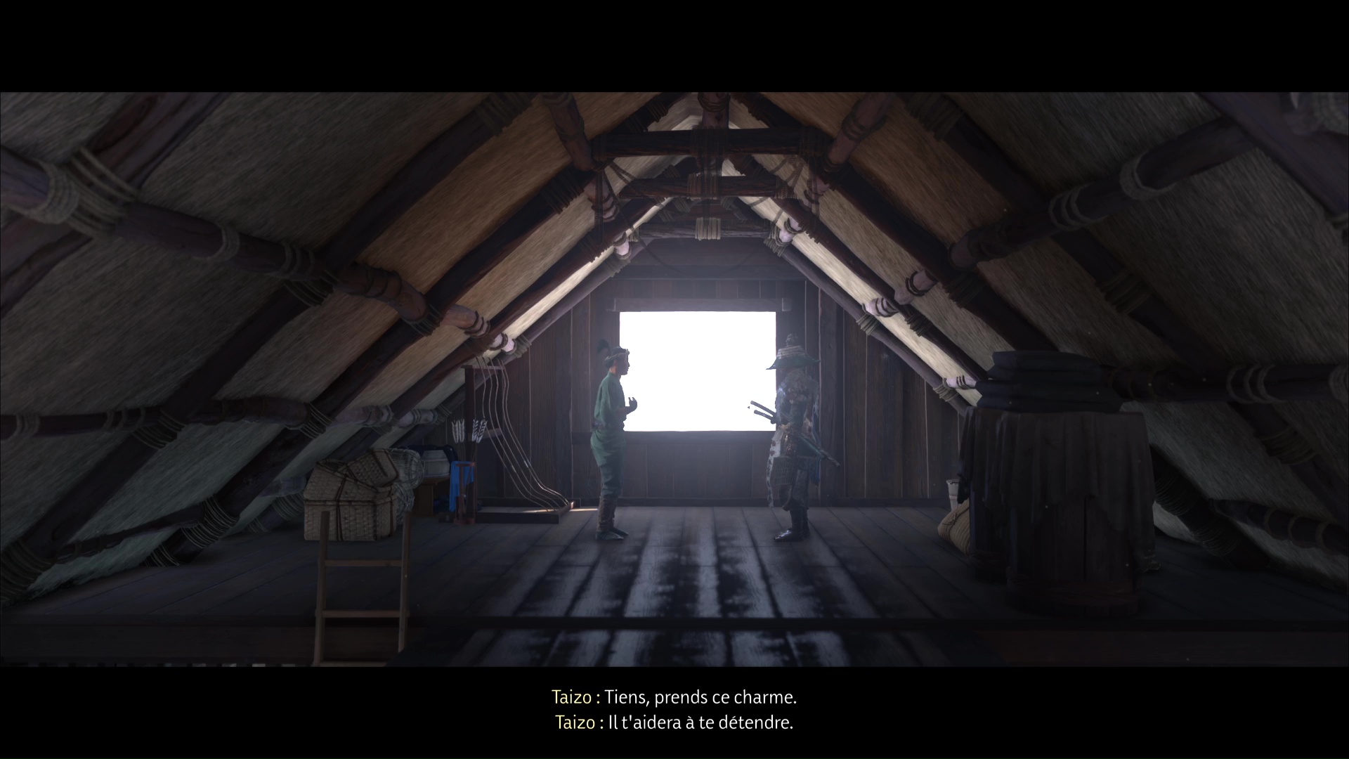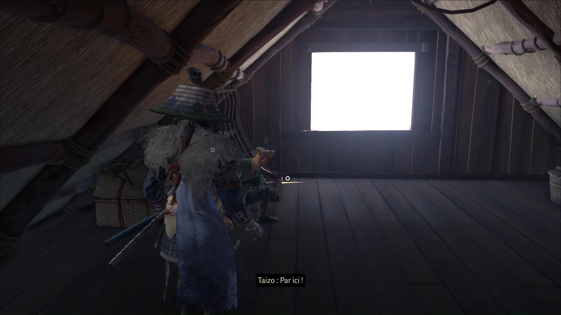 Une fois les alentours vidés de la menace adverse, cherchez Taizo à votre tour en entrant dans la maison. Cherchez l’échelle menant à l’étage supérieur et grimpez. En haut, vous apercevez un homme, et il s’agit de Taizo.