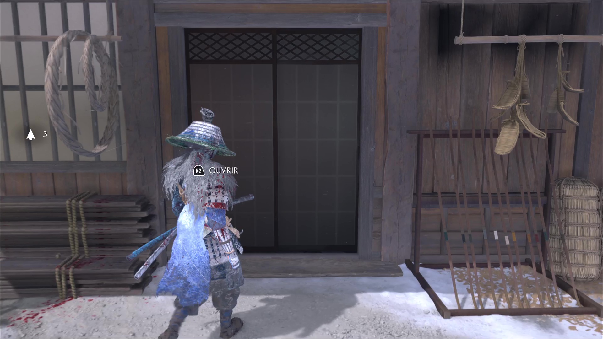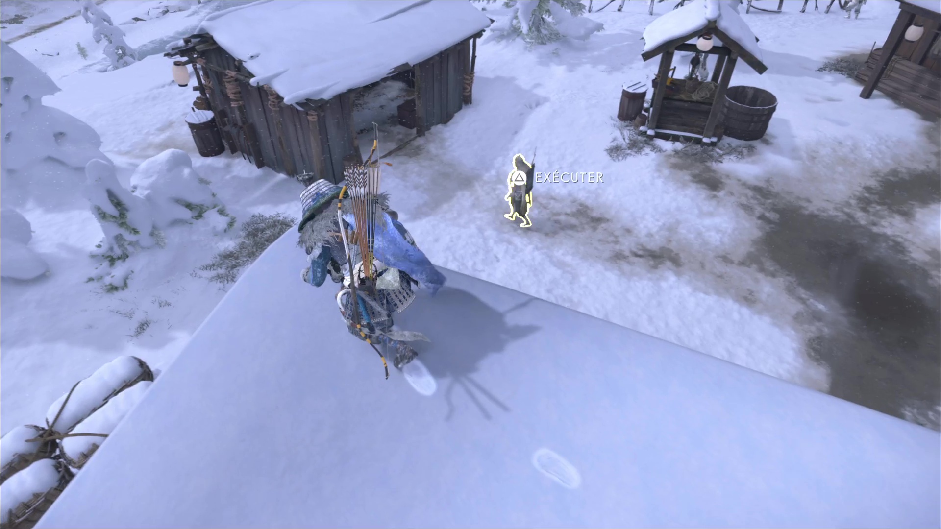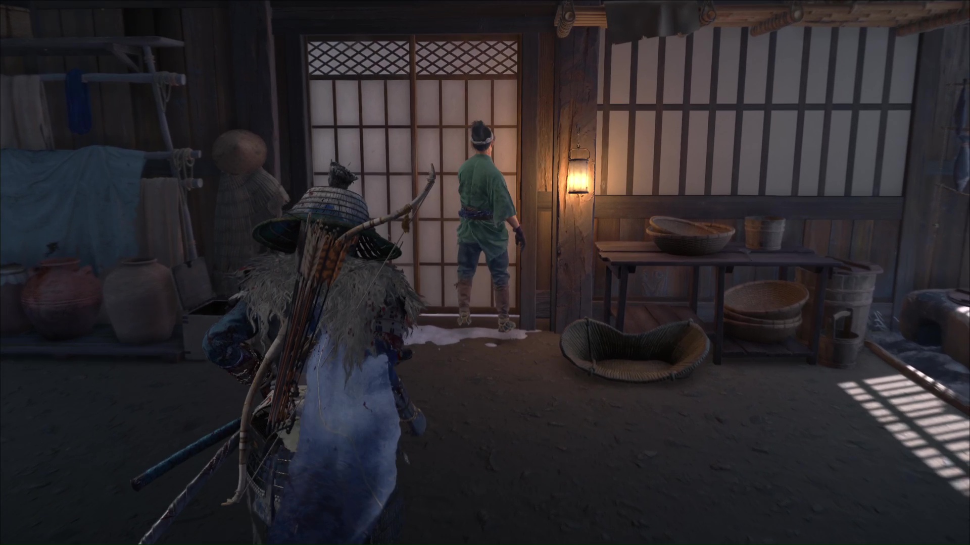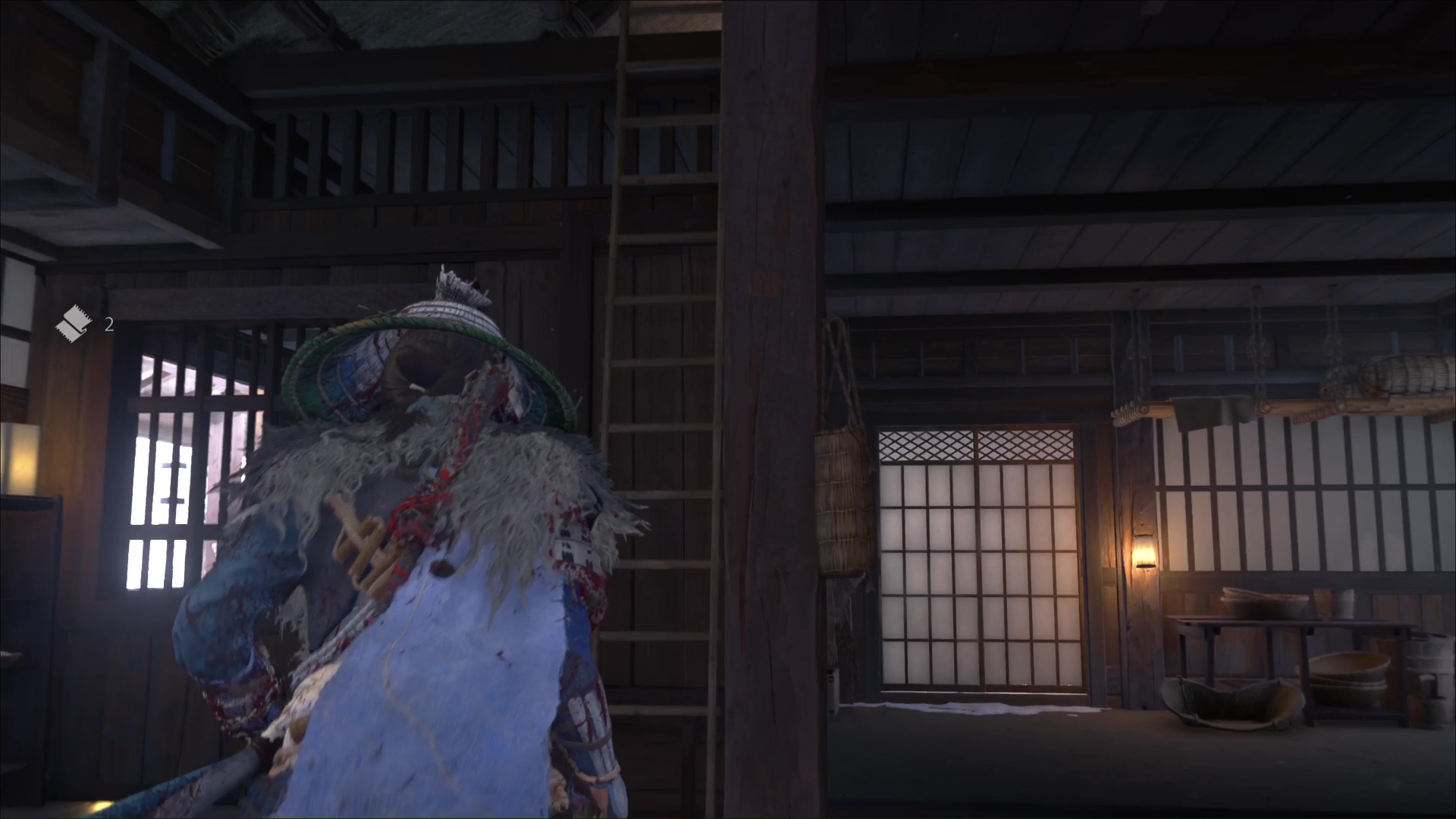 Une fois les alentours vidés de la menace adverse, cherchez Taizo à votre tour en entrant dans la maison. Cherchez l’échelle menant à l’étage supérieur et grimpez. En haut, vous apercevez un homme, et il s’agit de Taizo.