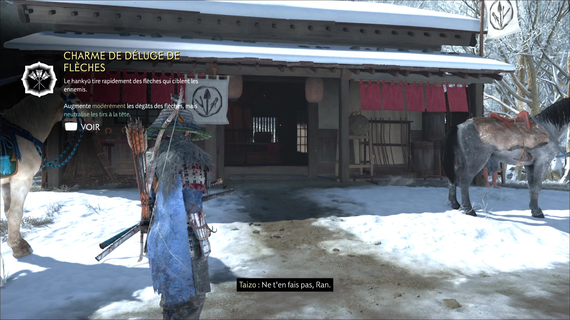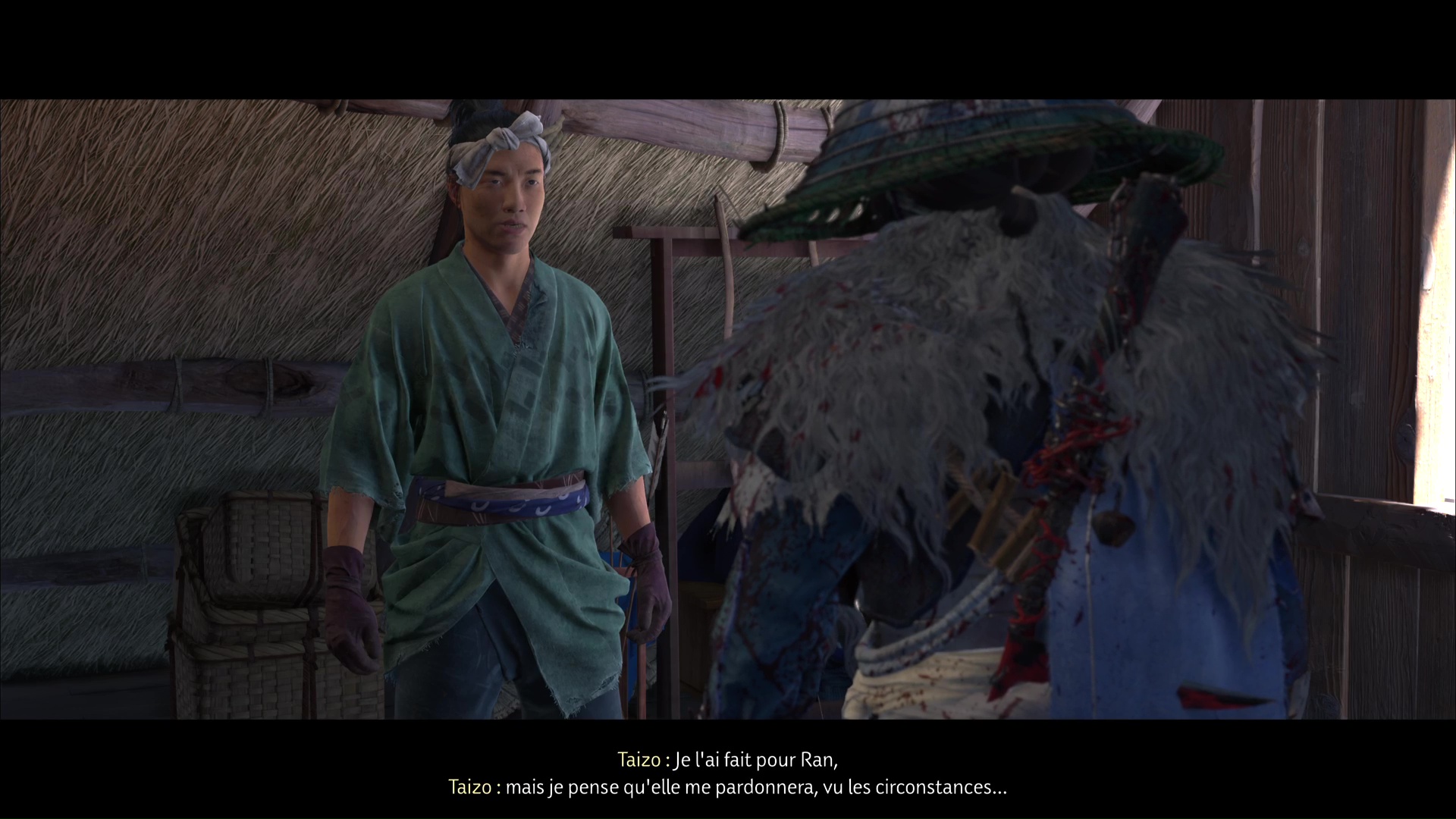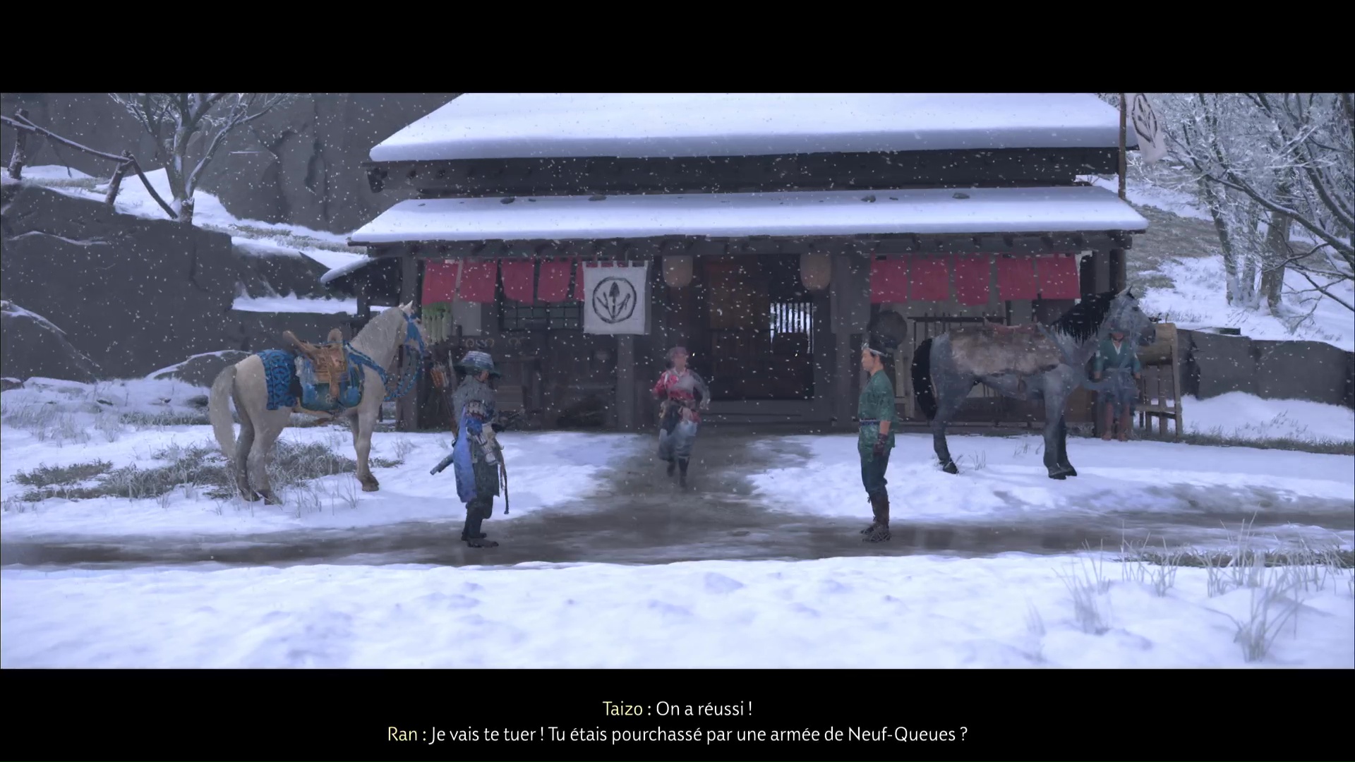 Dans la foulée, descendez en compagnie de Taizo et sortez. Parlez-lui pour en savoir plus sur lui et sa relation avec Ran, puis enfuyez-vous à cheval.