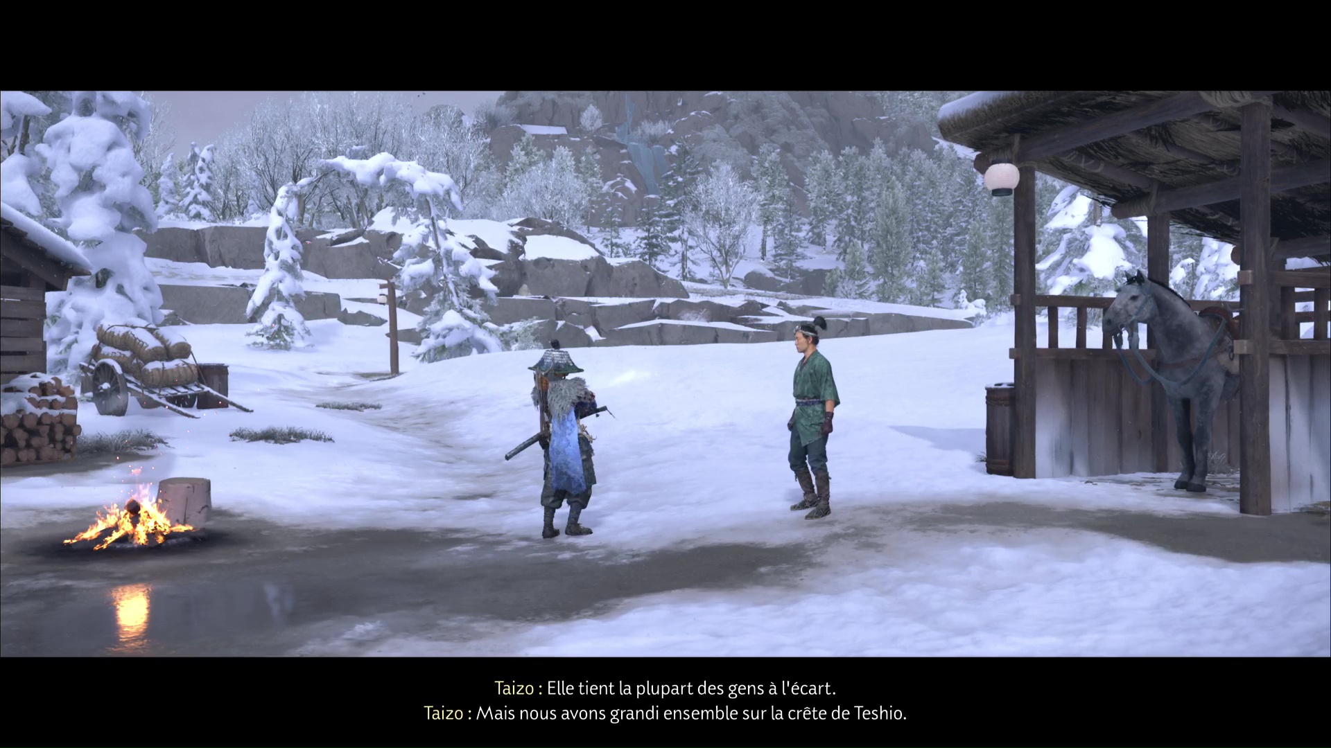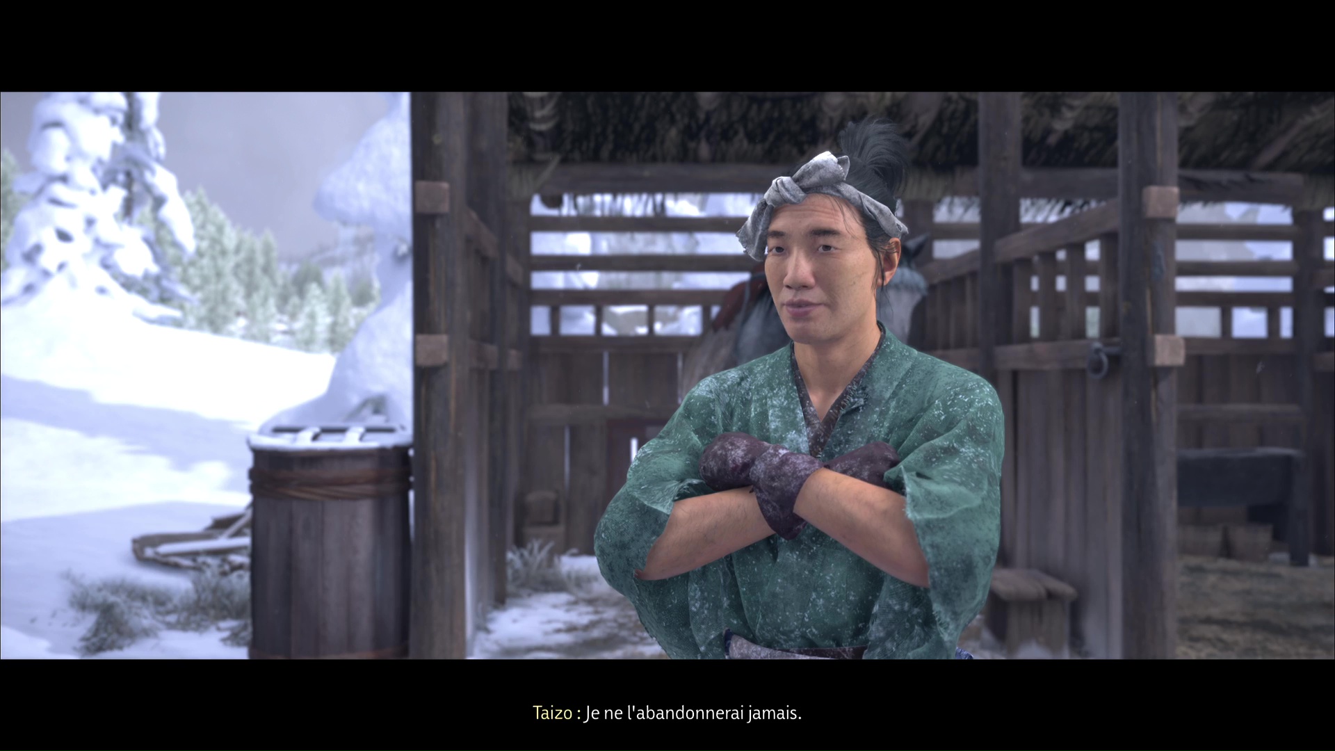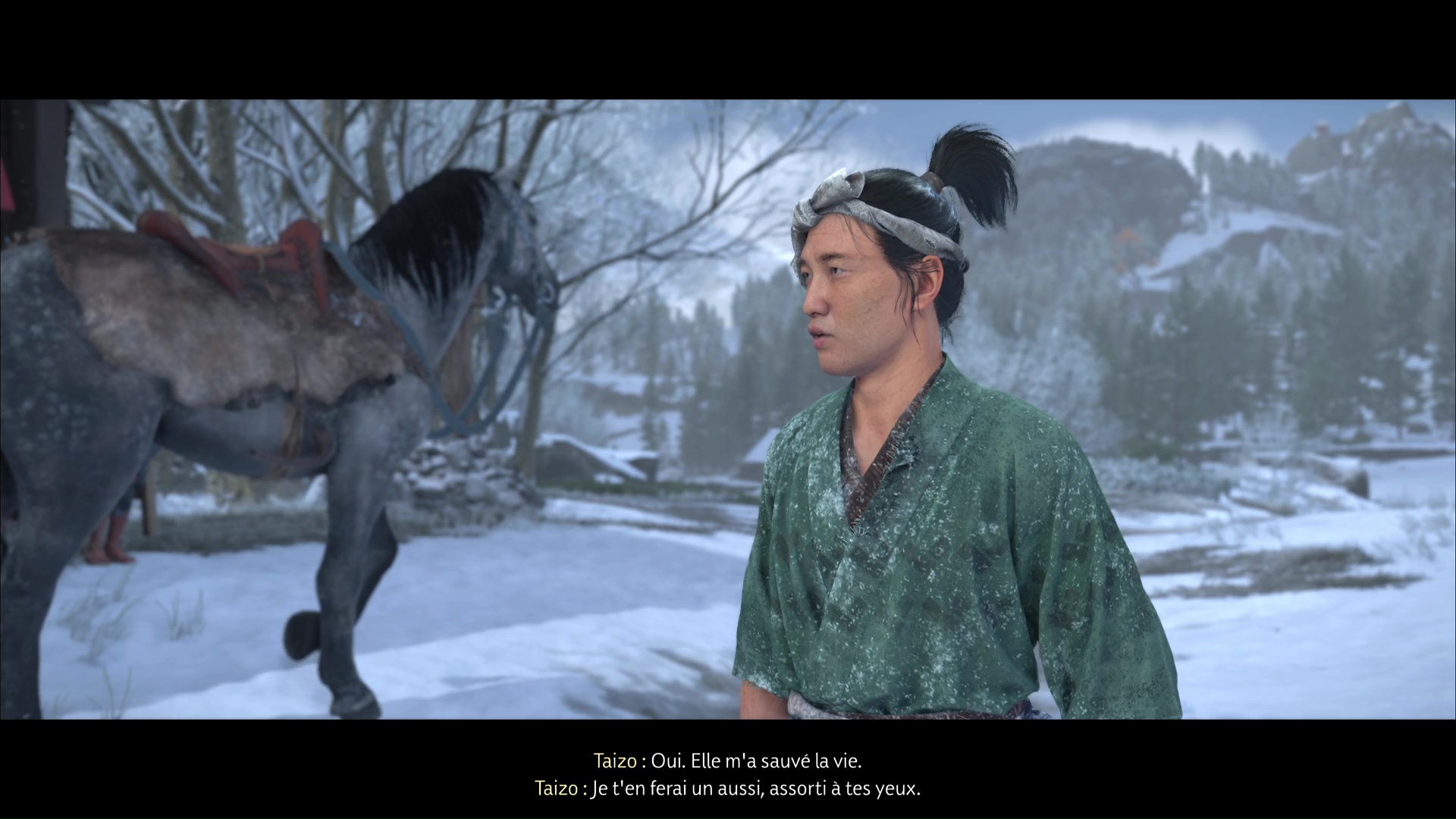 Dans la foulée, descendez en compagnie de Taizo et sortez. Parlez-lui pour en savoir plus sur lui et sa relation avec Ran, puis enfuyez-vous à cheval.