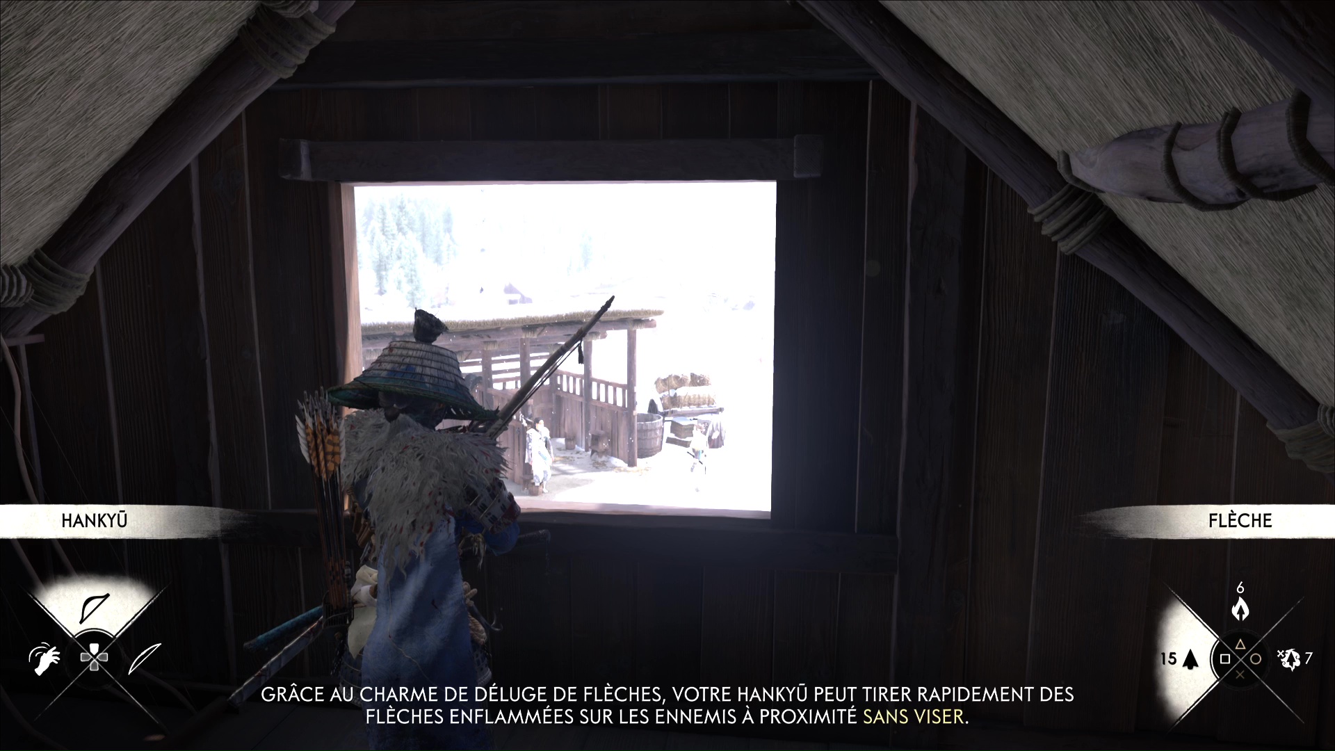 Sachant que le danger n’est pas totalement écarté, il vous donne le Charme de déluge de flèches. Approchez ensuite de la fenêtre, et essayez le charme sur les deux Neuf-Queues que vous avez en visu. Le charme vous permet de tirer à l’arc via une visée automatique, ce qui fluidifie l’usage de l’arc mais empêche les tirs à la tête.