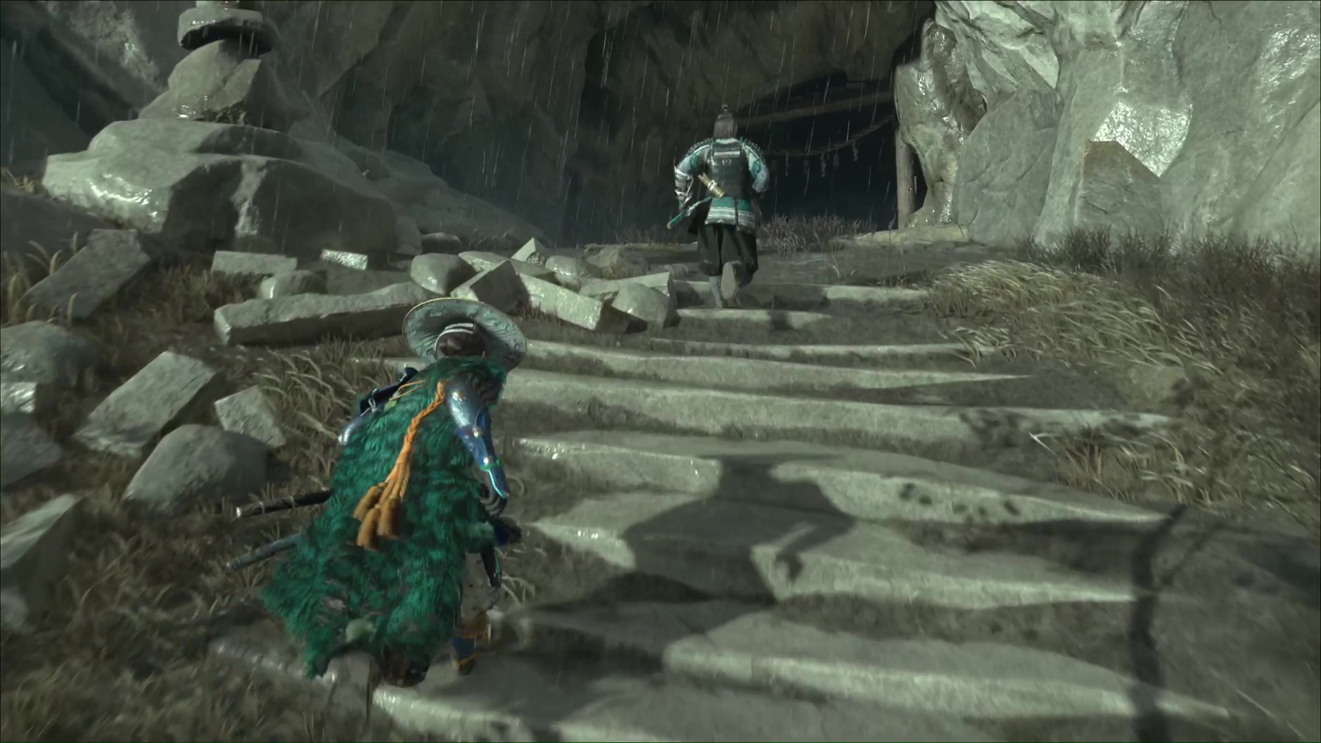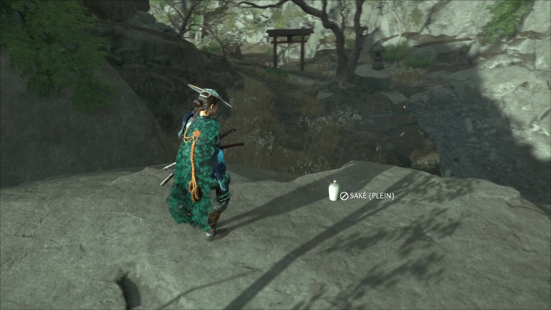 Sur place, l’accès est impossible puisque vous faites face à une pente glissante. Tournez la tête sur la gauche et vous verrez une paroi à gravir. Placez-vous à son pied pour faire passer Jubei au niveau supérieur. Il vous hissera dans la foulée. Montez ensuite le petit chemin pour rejoindre le torii du début du sanctuaire.