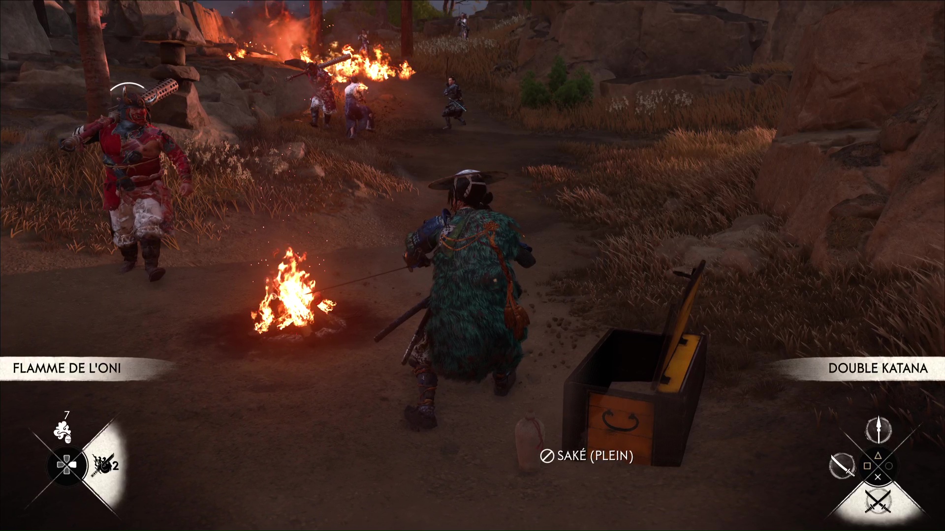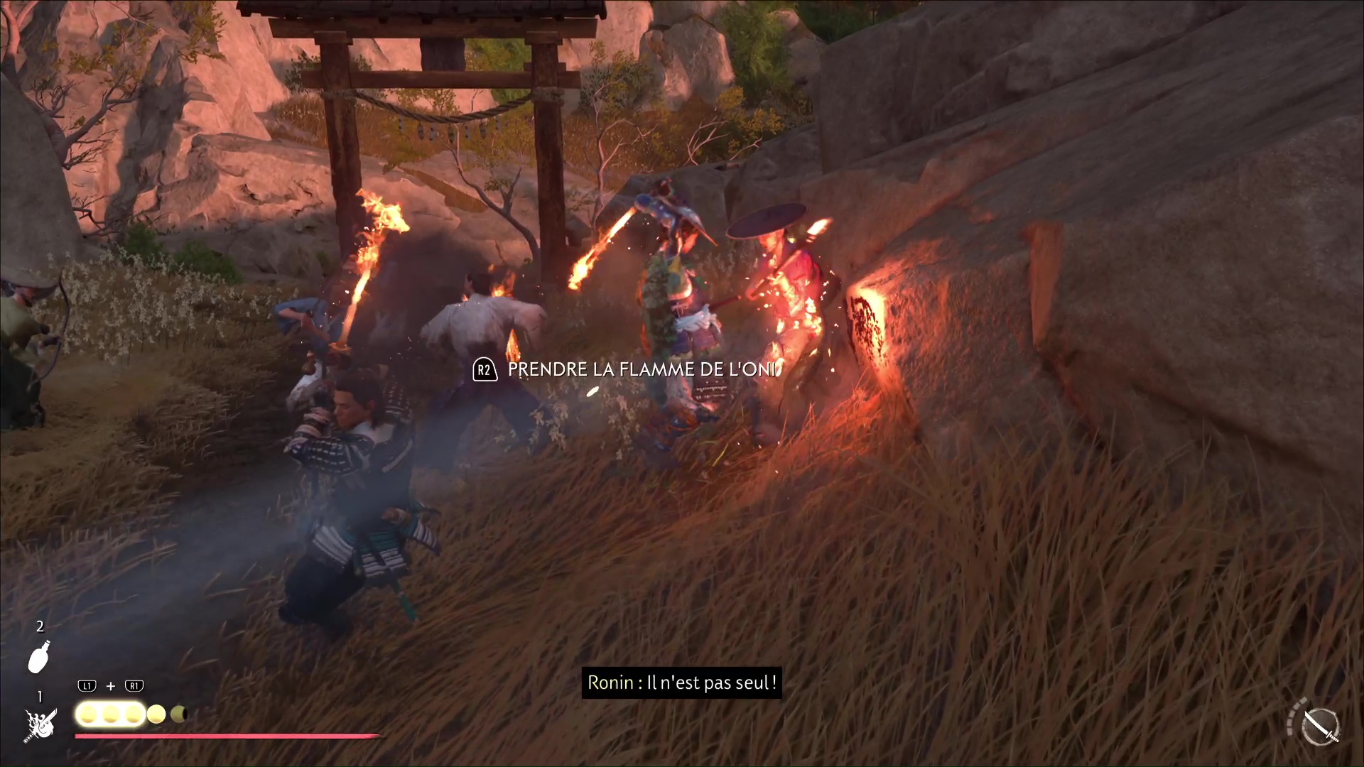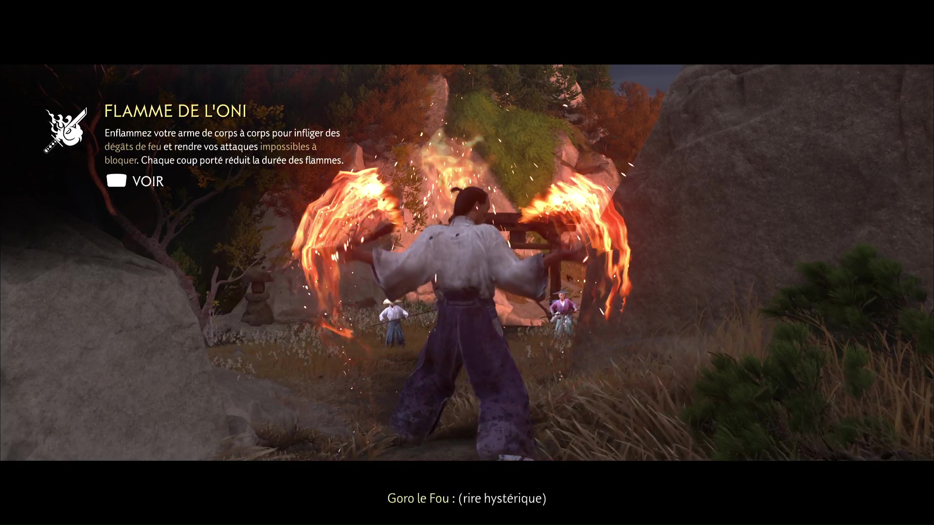 Testez-la tout de suite face aux ronin plus bas en sachant que, de base, l’effet ne dure pas très longtemps. N’oubliez pas de prendre des munitions auprès de Goro. Une fois la première vague de ronin battue, continuez de vous battre face à une deuxième, un peu plus loin.