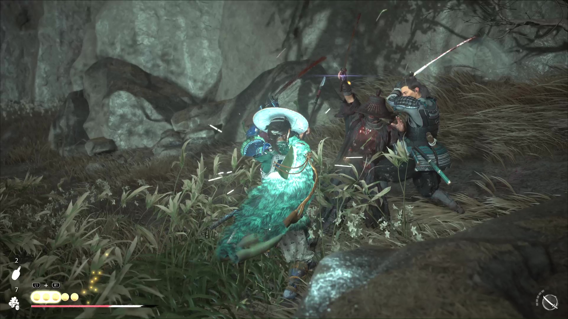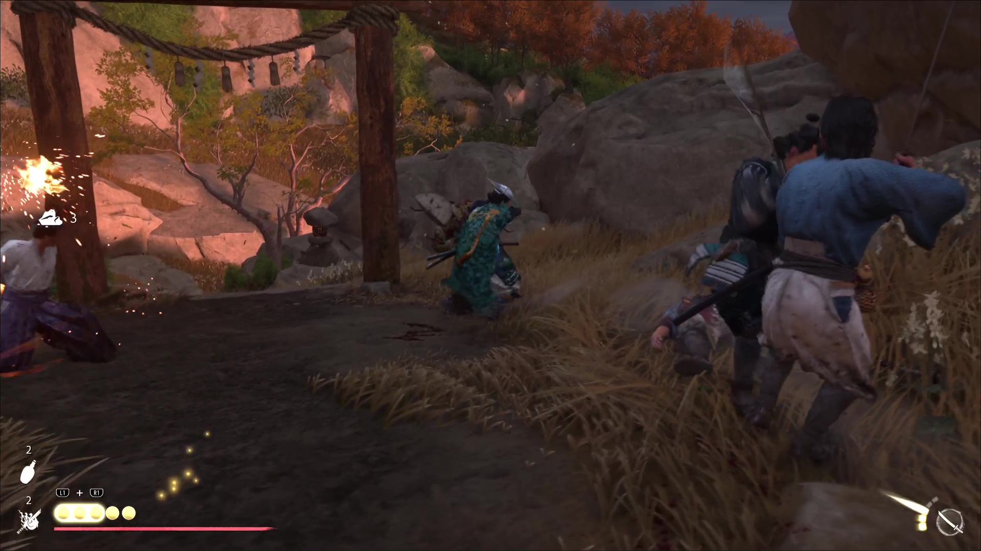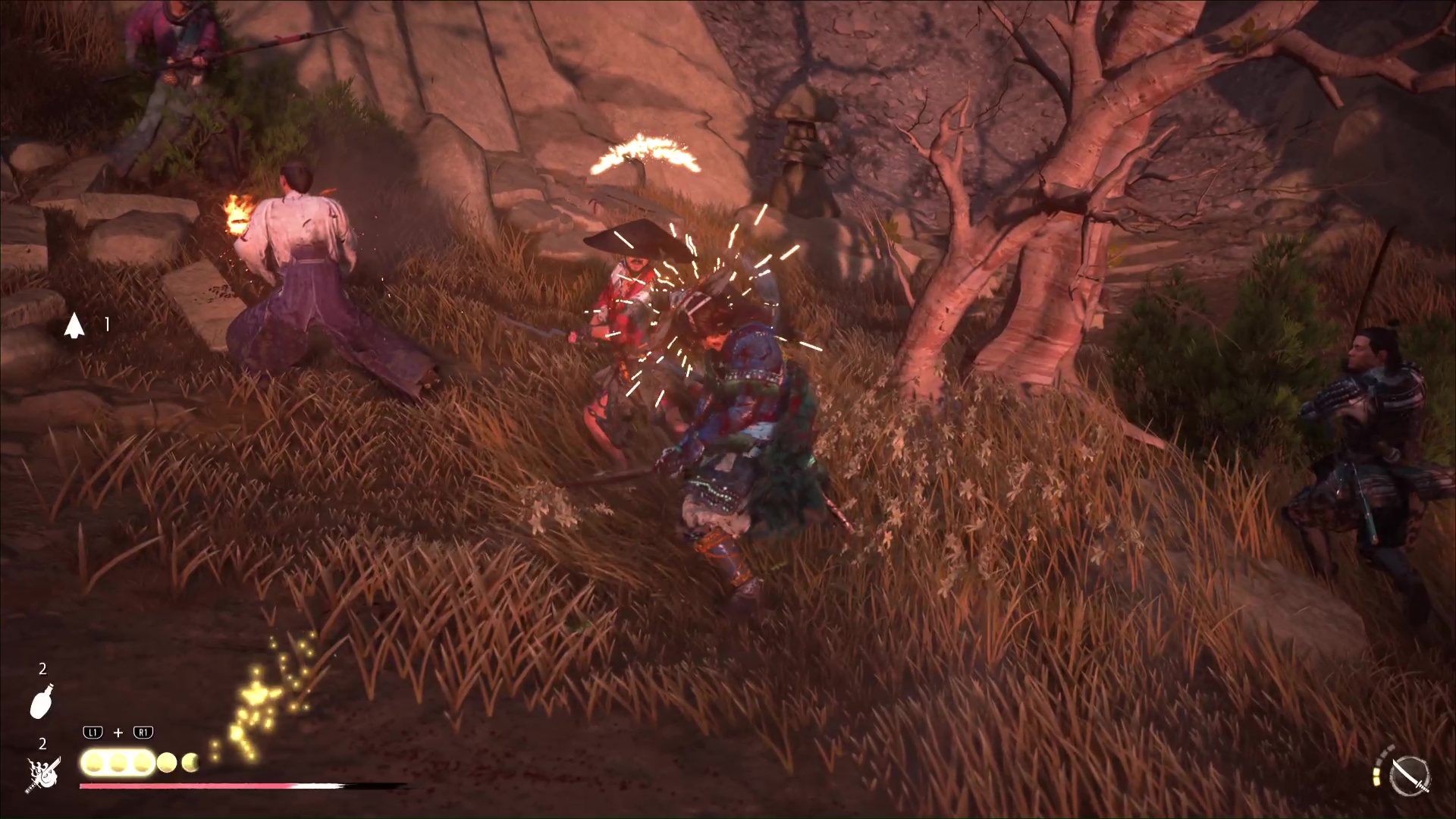 Testez-la tout de suite face aux ronin plus bas en sachant que, de base, l’effet ne dure pas très longtemps. N’oubliez pas de prendre des munitions auprès de Goro. Une fois la première vague de ronin battue, continuez de vous battre face à une deuxième, un peu plus loin.