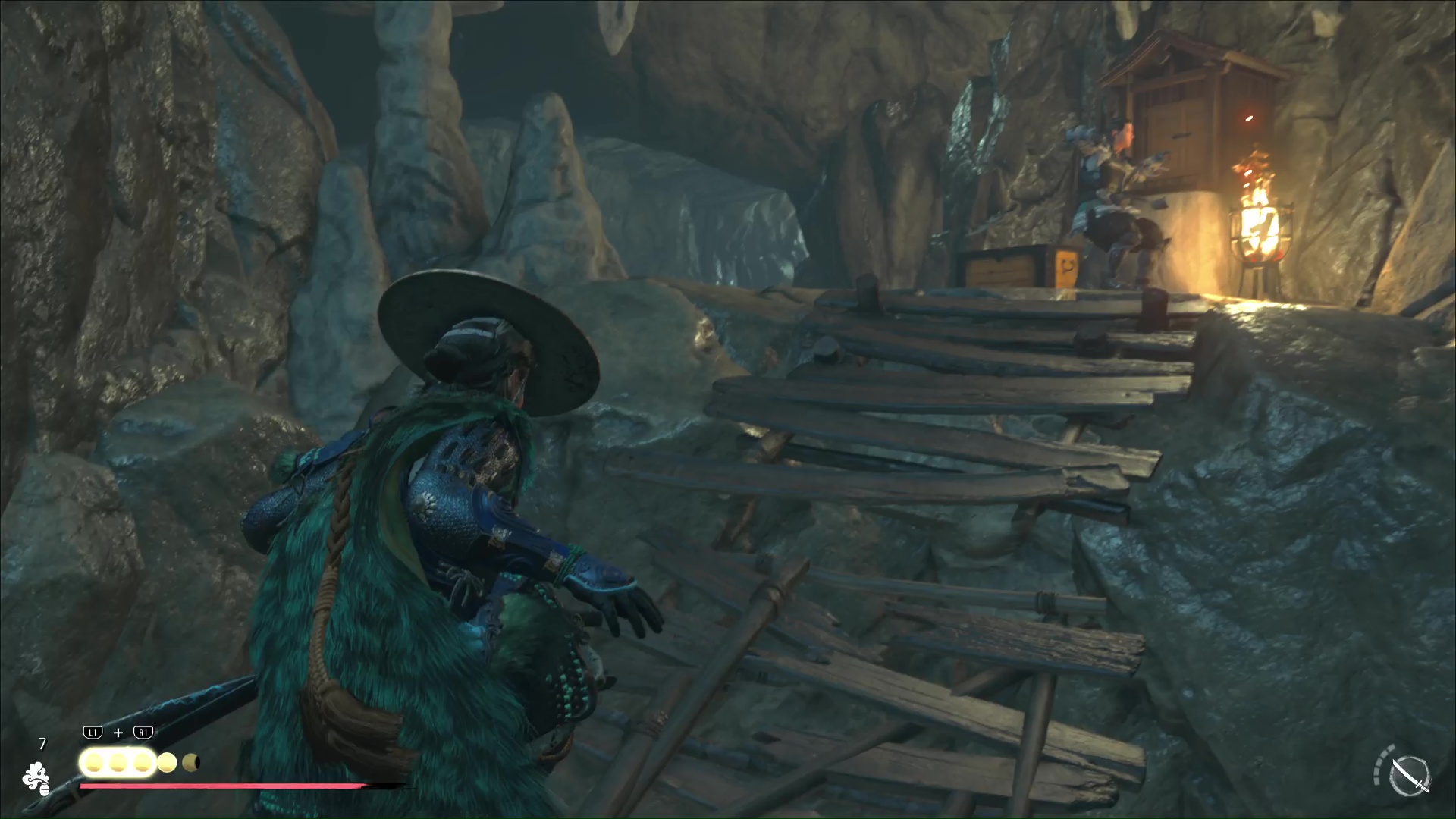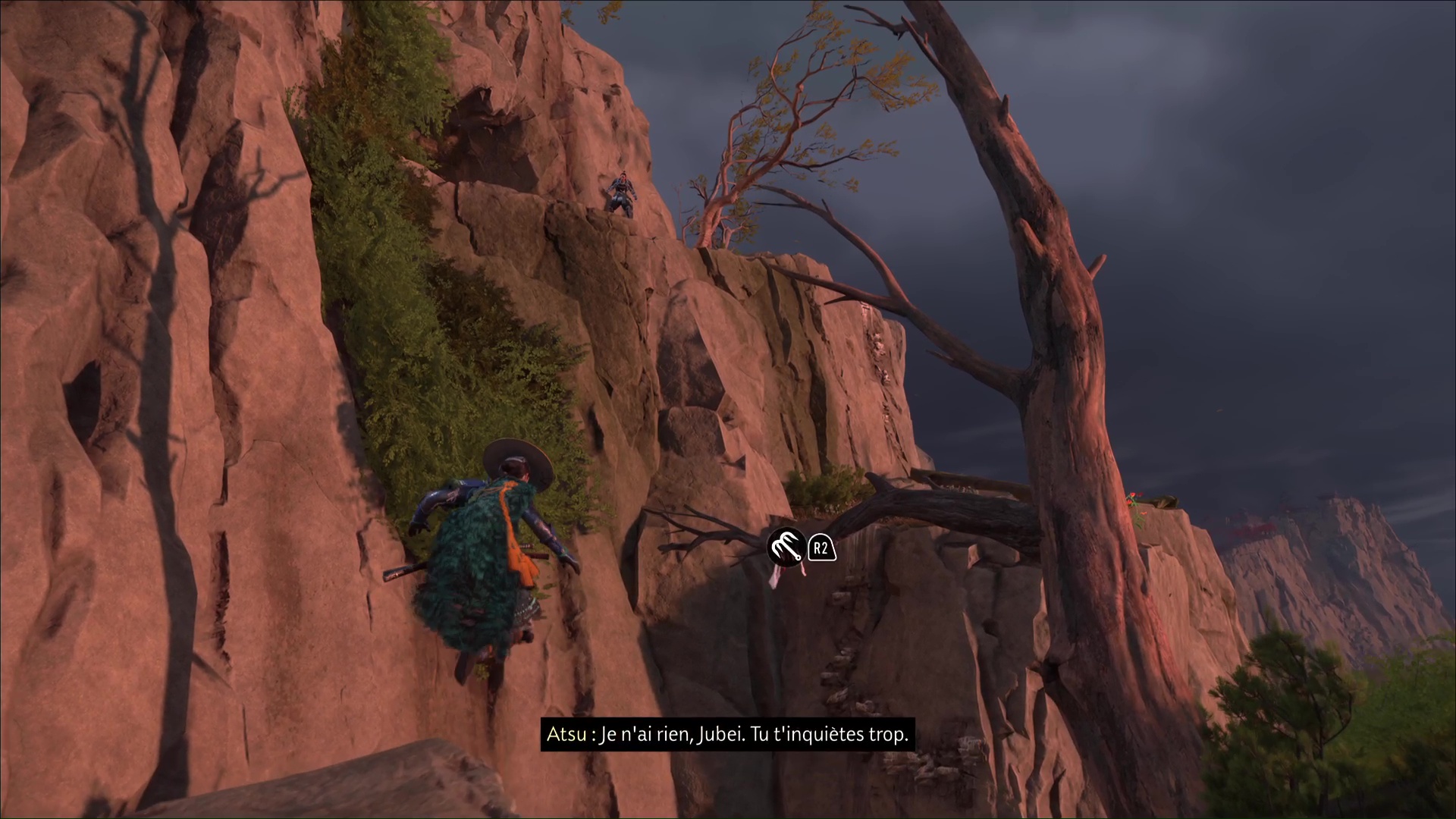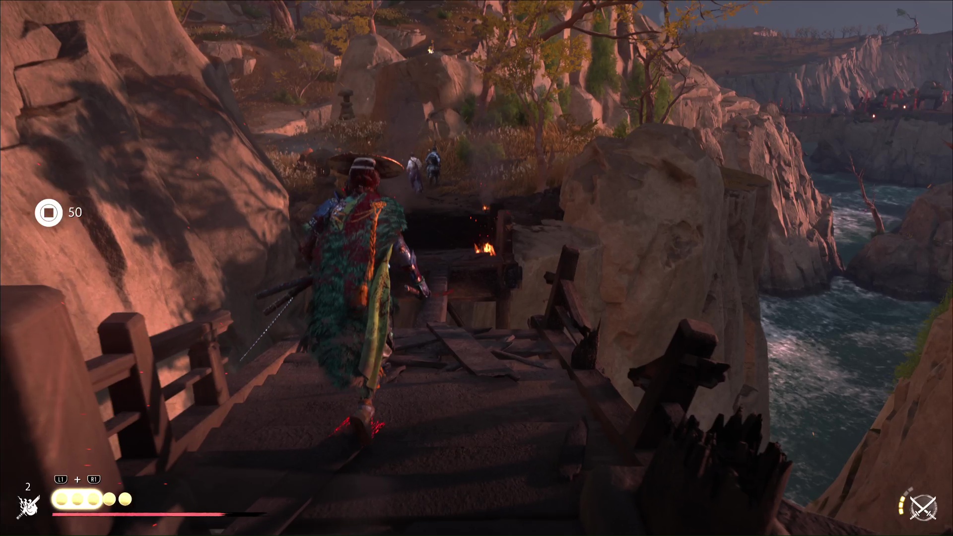 Jubei peut désormais vous rejoindre, et l’ascension peut reprendre. Suivez le chemin balisé et, rapidement, vous serez freiné par une barrière. Grâce à Jubei et votre grappin, tirez dessus pour vous libérer un passage. Continuez à progresser avant que le pont ne cède à votre passage.