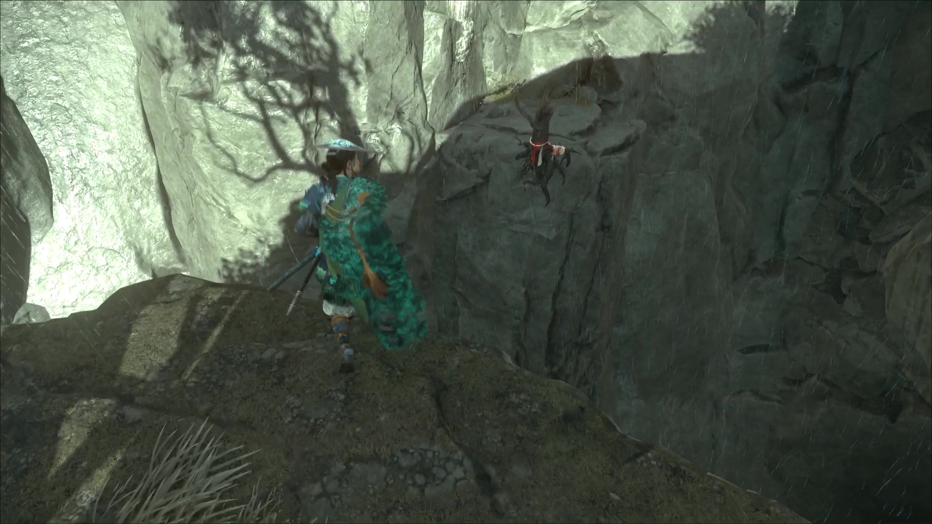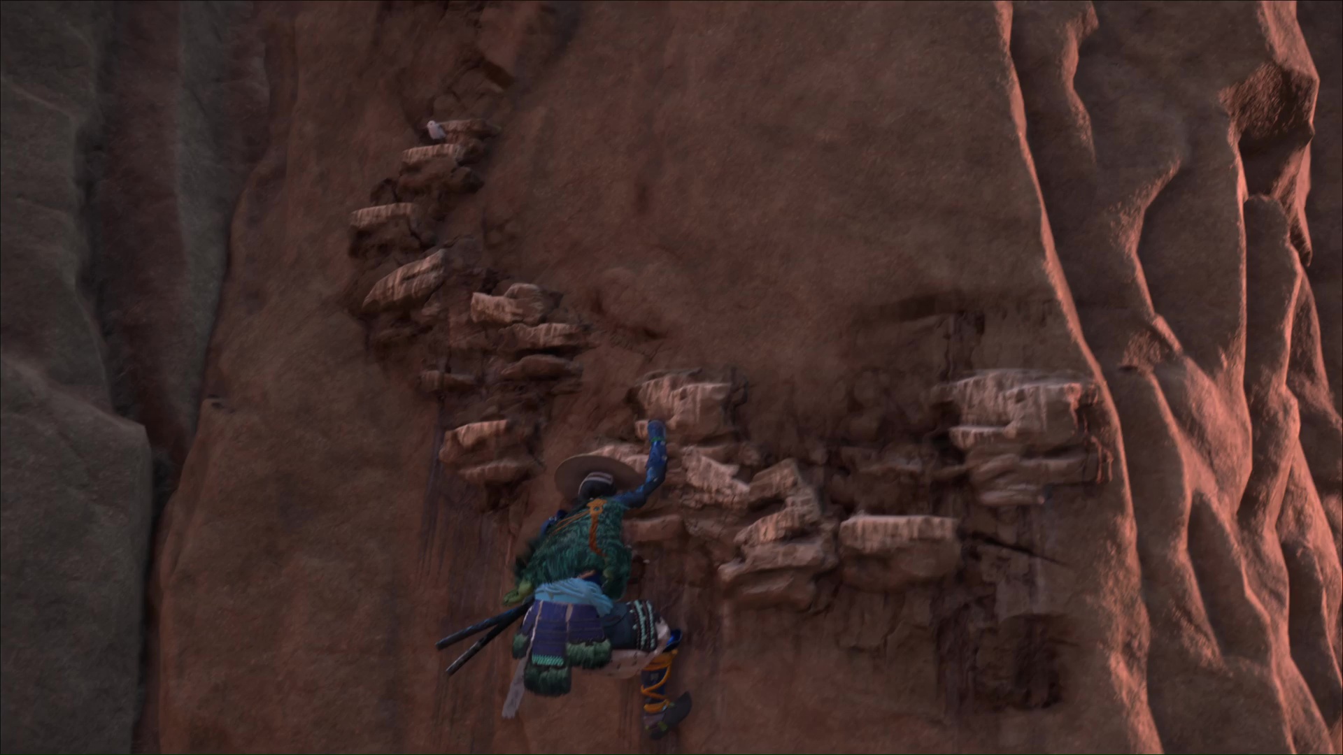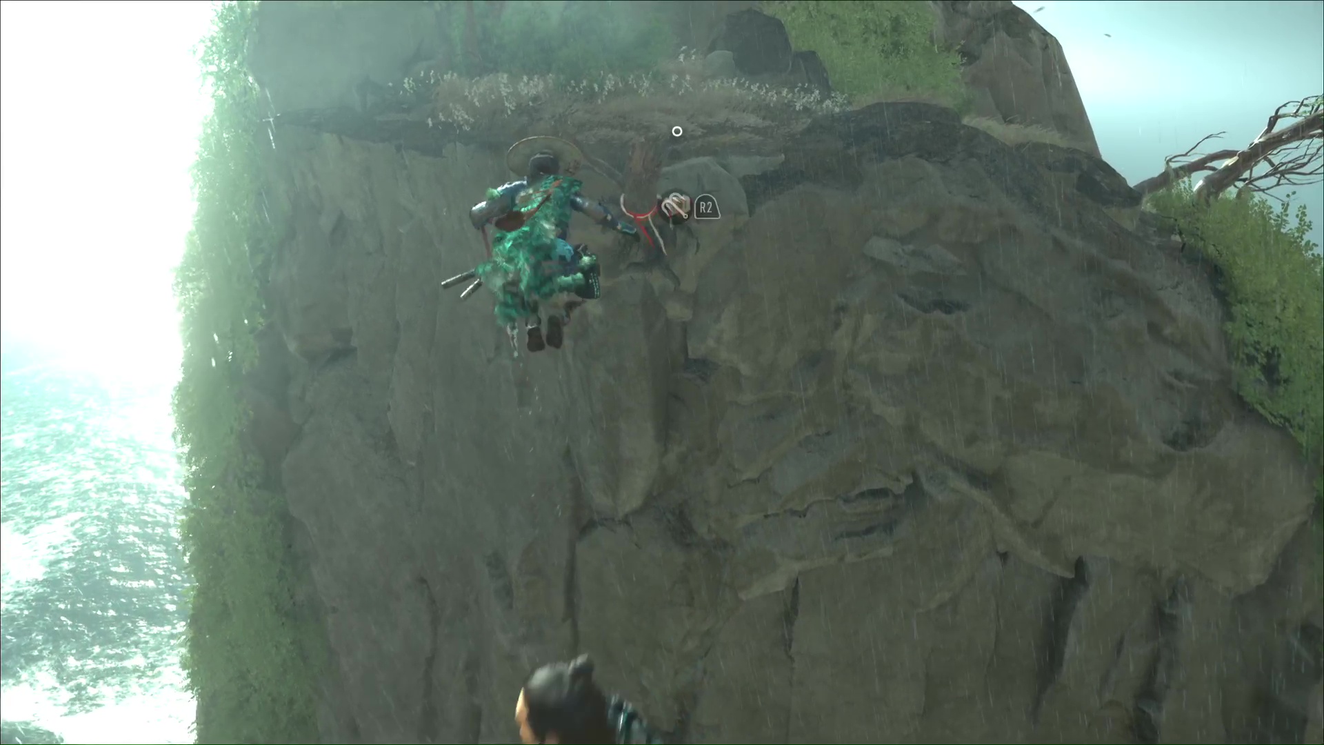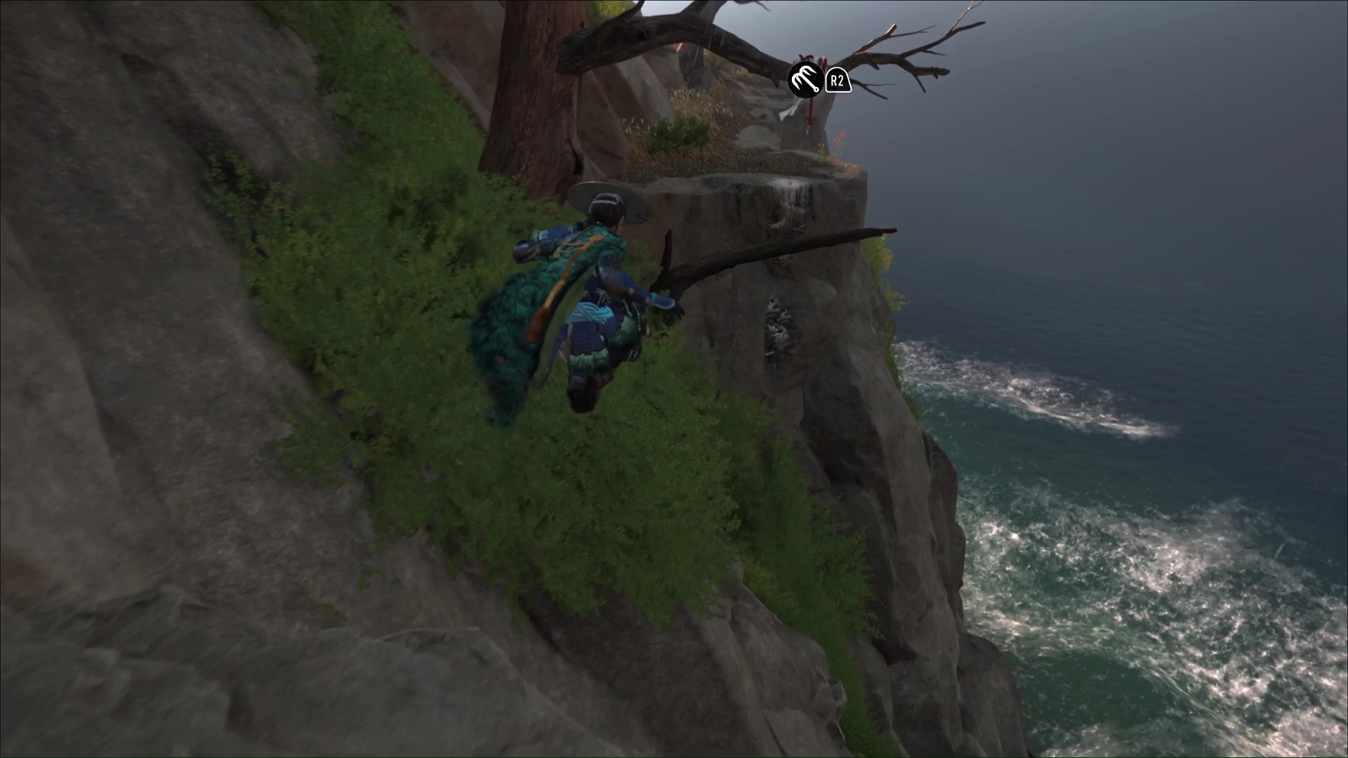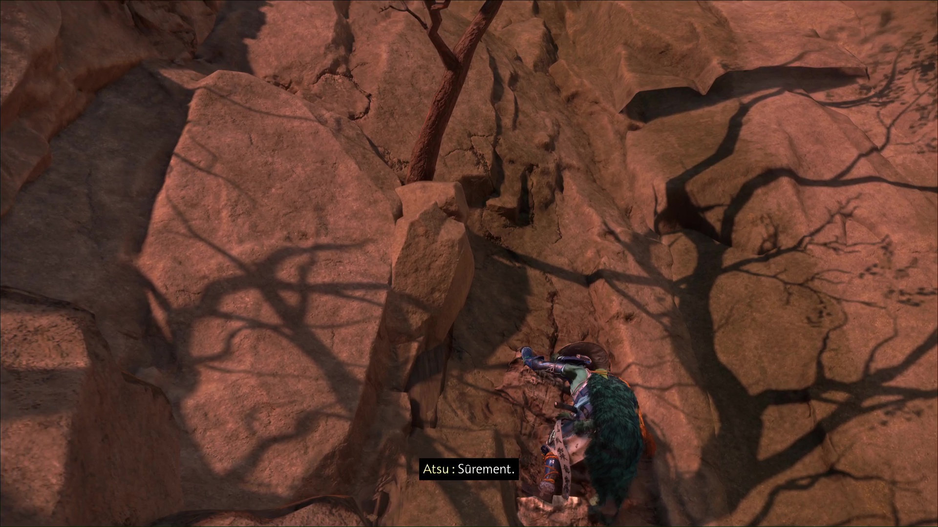 En bas, quittez la grotte et descendez les prises d’escalade pour vous retrouver à longer la falaise. Sautez au grappin sur une branche pour vous retrouver debout sur une autre. Bondissez une nouvelle fois pour vous rattraper à des prises rocheuses.