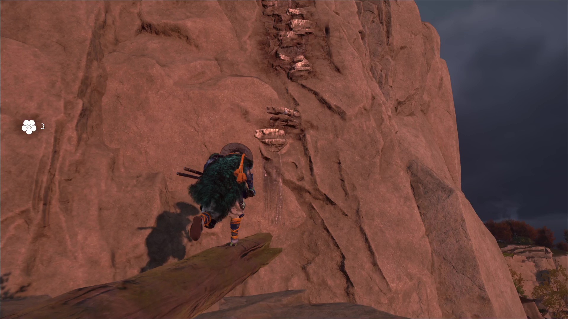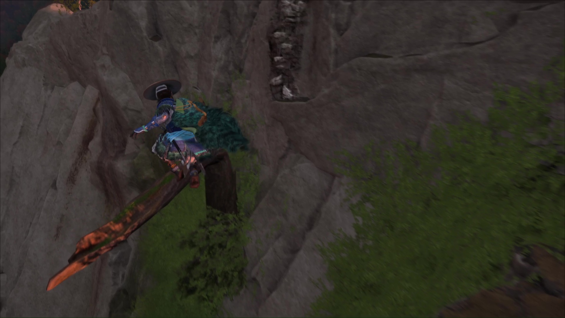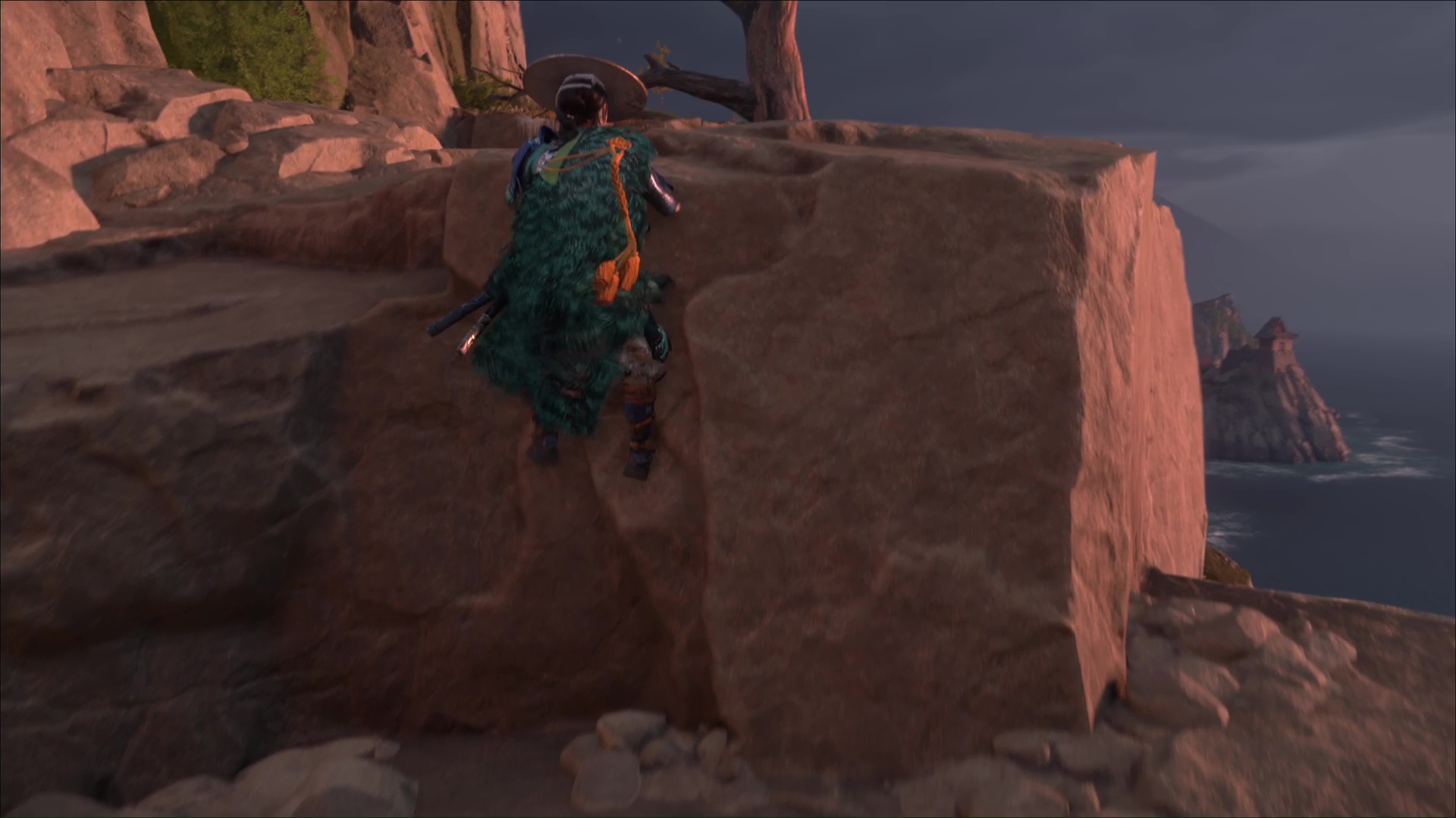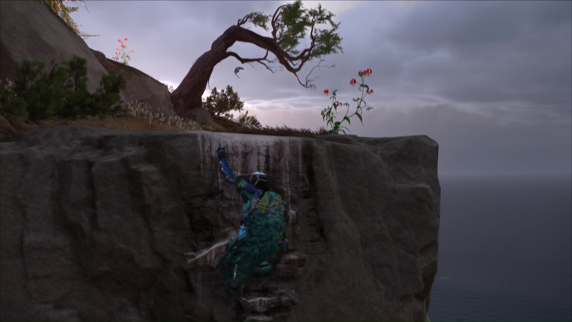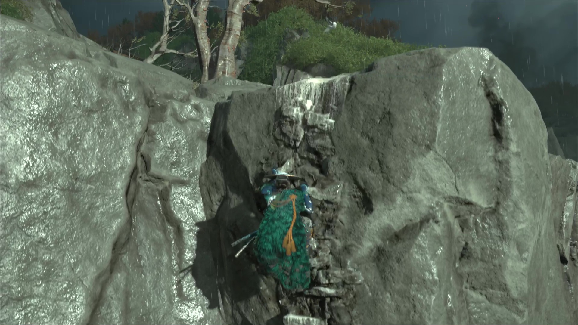 En bas, quittez la grotte et descendez les prises d’escalade pour vous retrouver à longer la falaise. Sautez au grappin sur une branche pour vous retrouver debout sur une autre. Bondissez une nouvelle fois pour vous rattraper à des prises rocheuses.