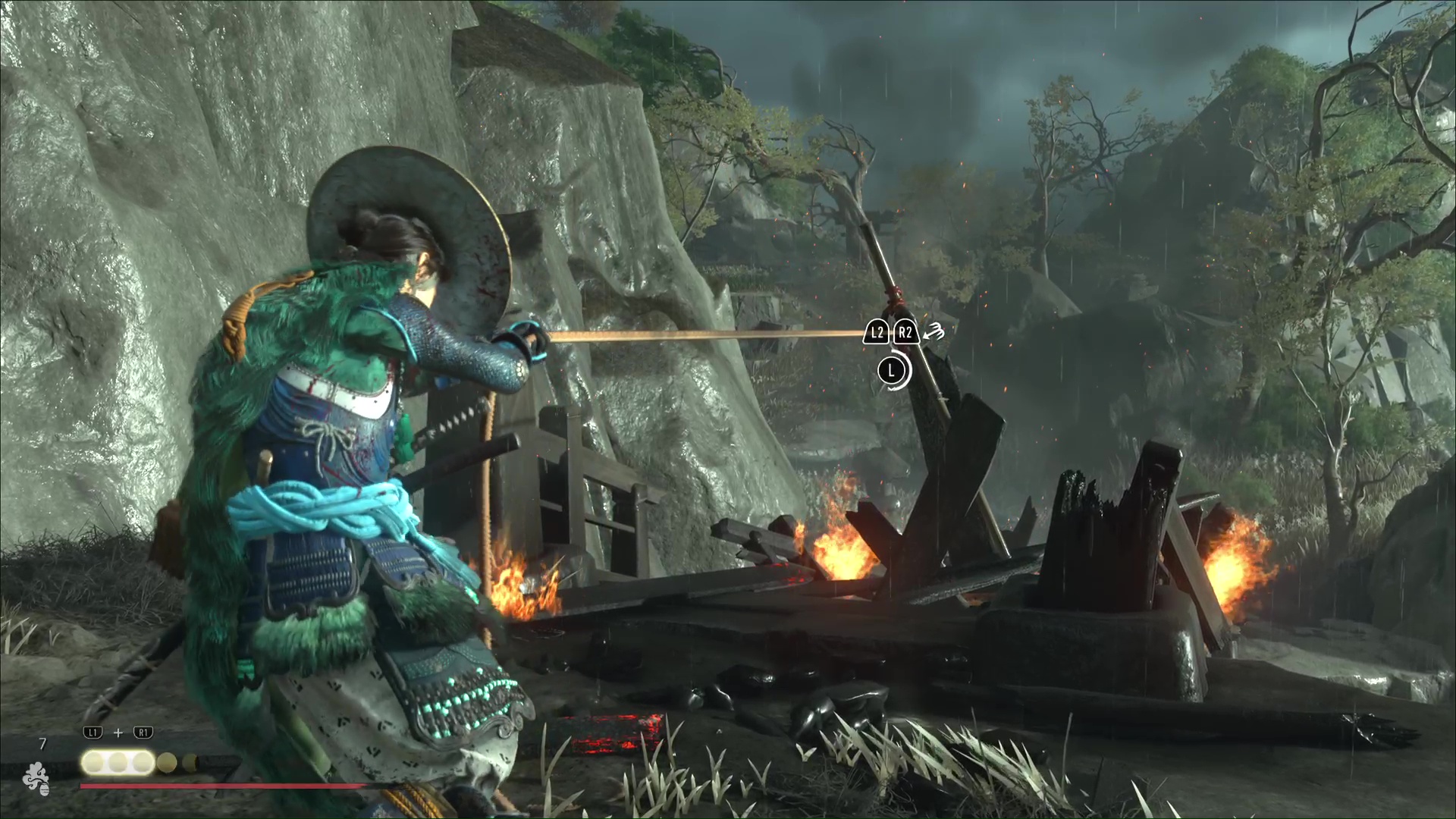 Une fois la zone nettoyée, votre avancée est interrompue par un pont en flammes. Vous allez donc devoir contourner et ouvrir l’accès à Jubei. À gauche du pont quand vous lui faites face, cherchez un tronc auquel s’accrocher avec le grappin. Sautez vers lui et hissez-vous en face, puis continuez jusqu’à apercevoir un nouveau tronc.