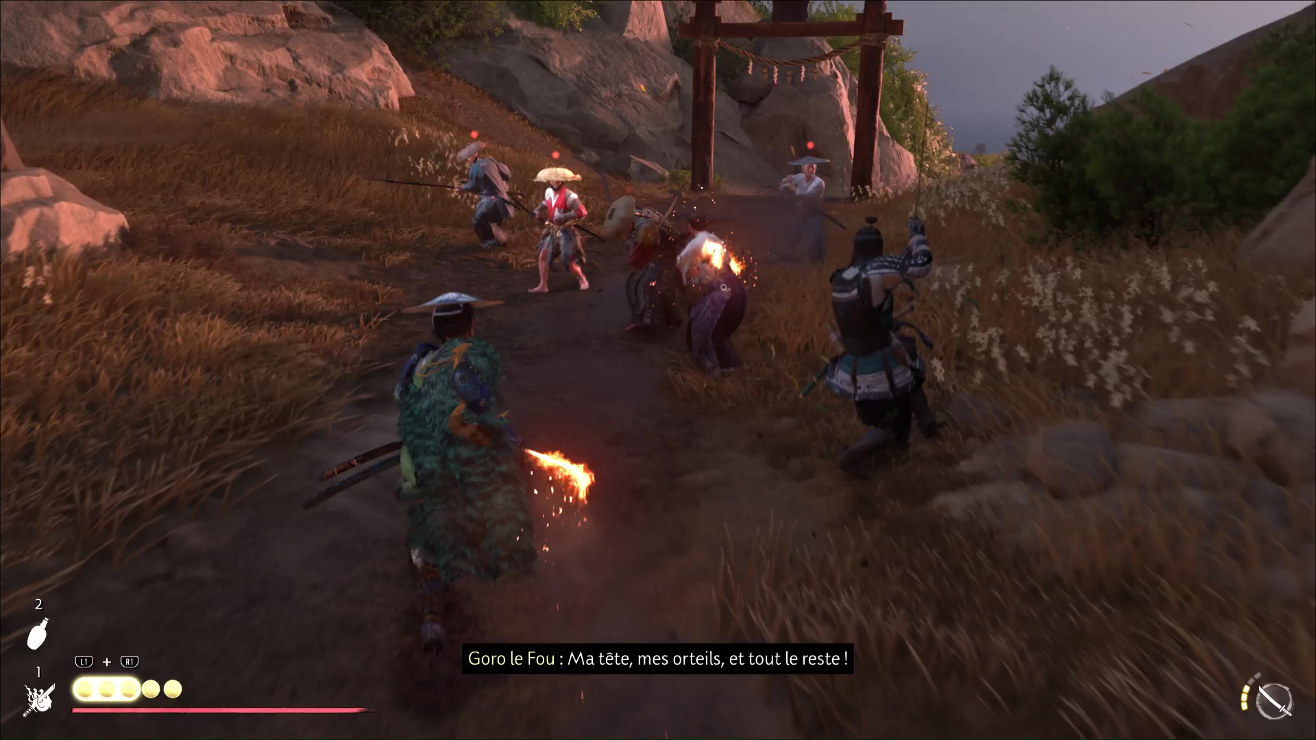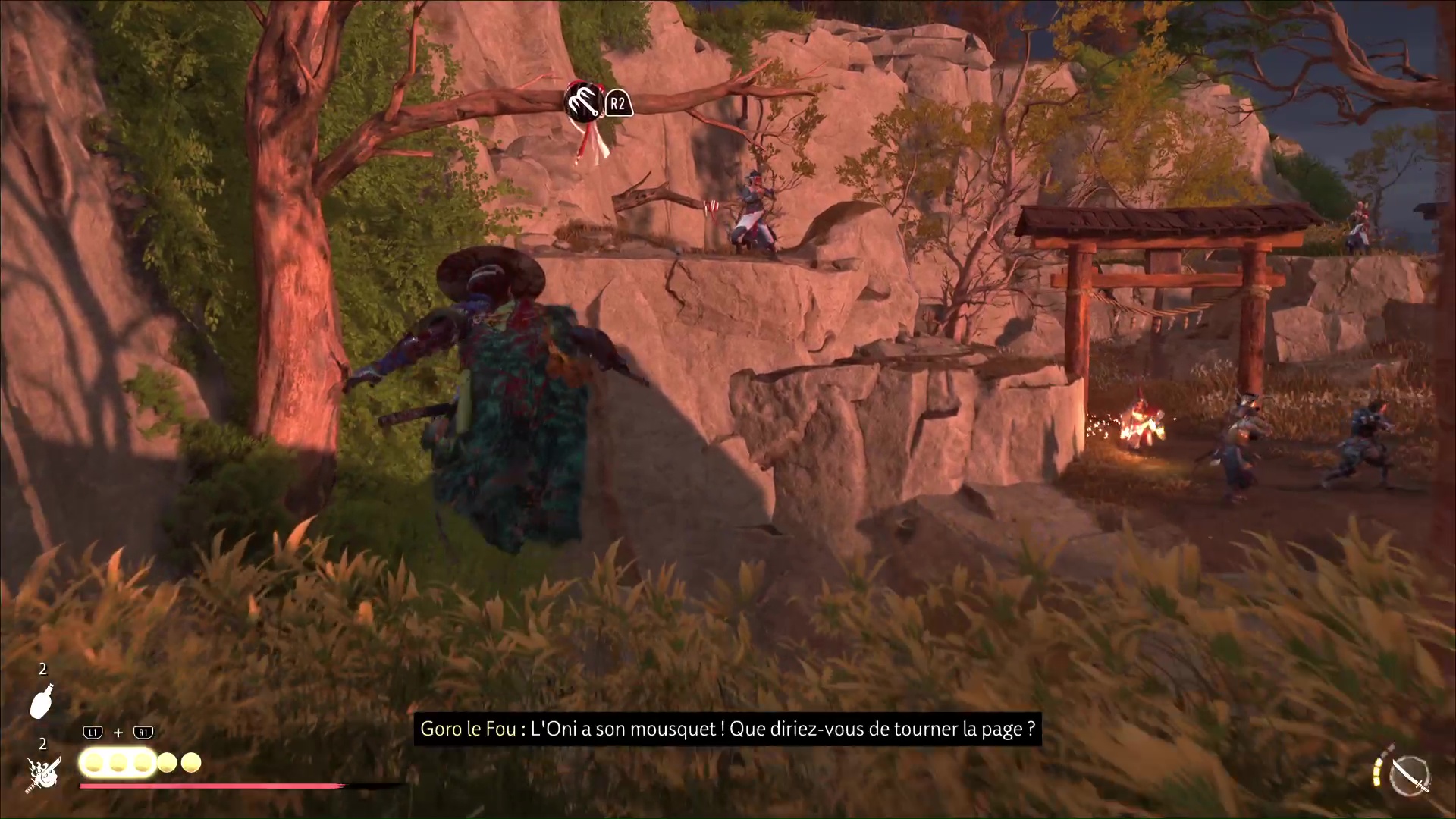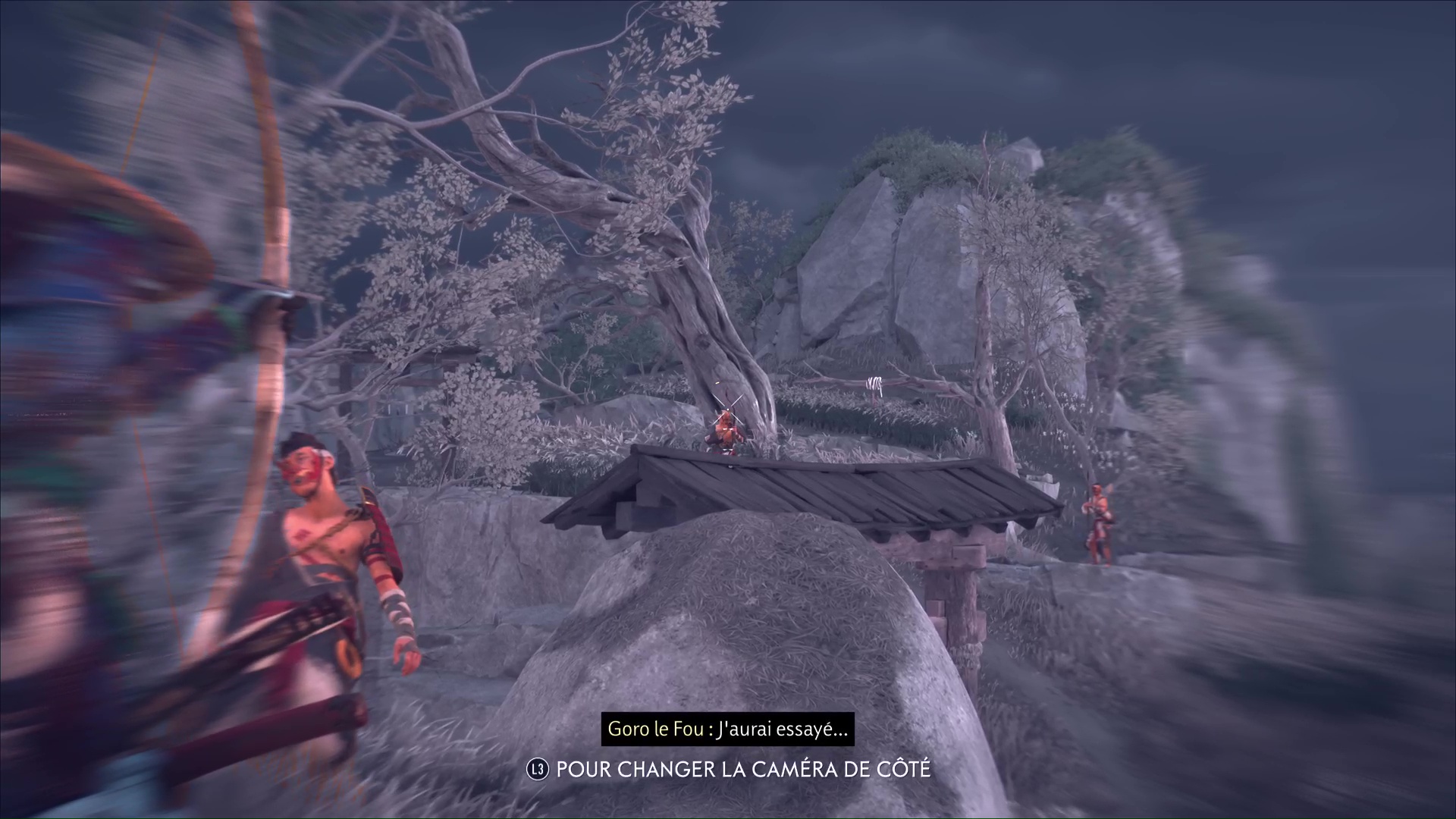 Allez directement rejoindre l’archer sur la gauche grâce au grappin pour le tuer, puis éliminez également à l’arc les autres archers pour être plus tranquille. Allez rejoindre Goro et Jubei et terminez le combat en battant au corps à corps les ennemis restants, dont une brute.