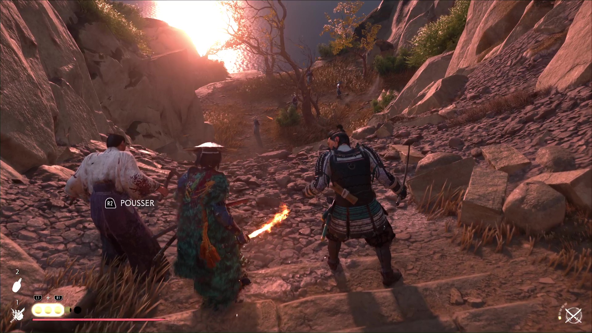 Progressez ensuite jusqu’au sommet d’une pente glissante. Poussez Goro et glissez vous aussi dessus pour rejoindre une autre vague de ronin. Une fois tout le monde vaincu, traversez le pont et, une fois encore, des ennemis viennent vous cueillir.