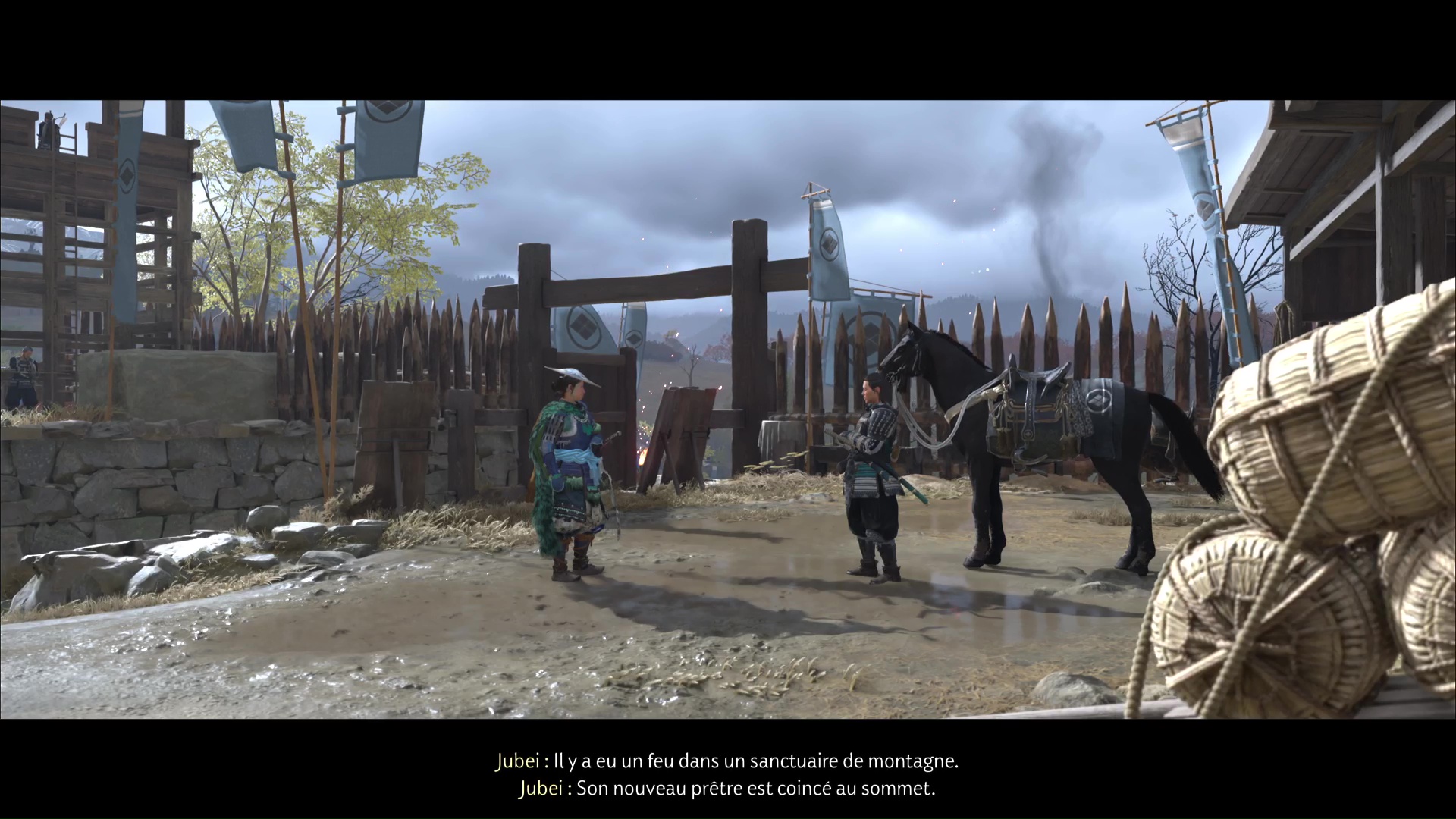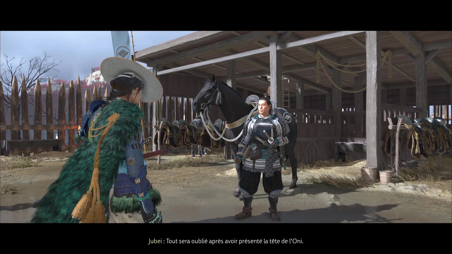 Le commandant désapprouve la présence d’Atsu et l’aide qu’elle apporte, mais Jubei insiste avant de quitter la tente. Suivez-le dehors jusqu’aux chevaux, et il vous dira que peu importe sa désobéissance, le principal pour les Matsumae reste les résultats.