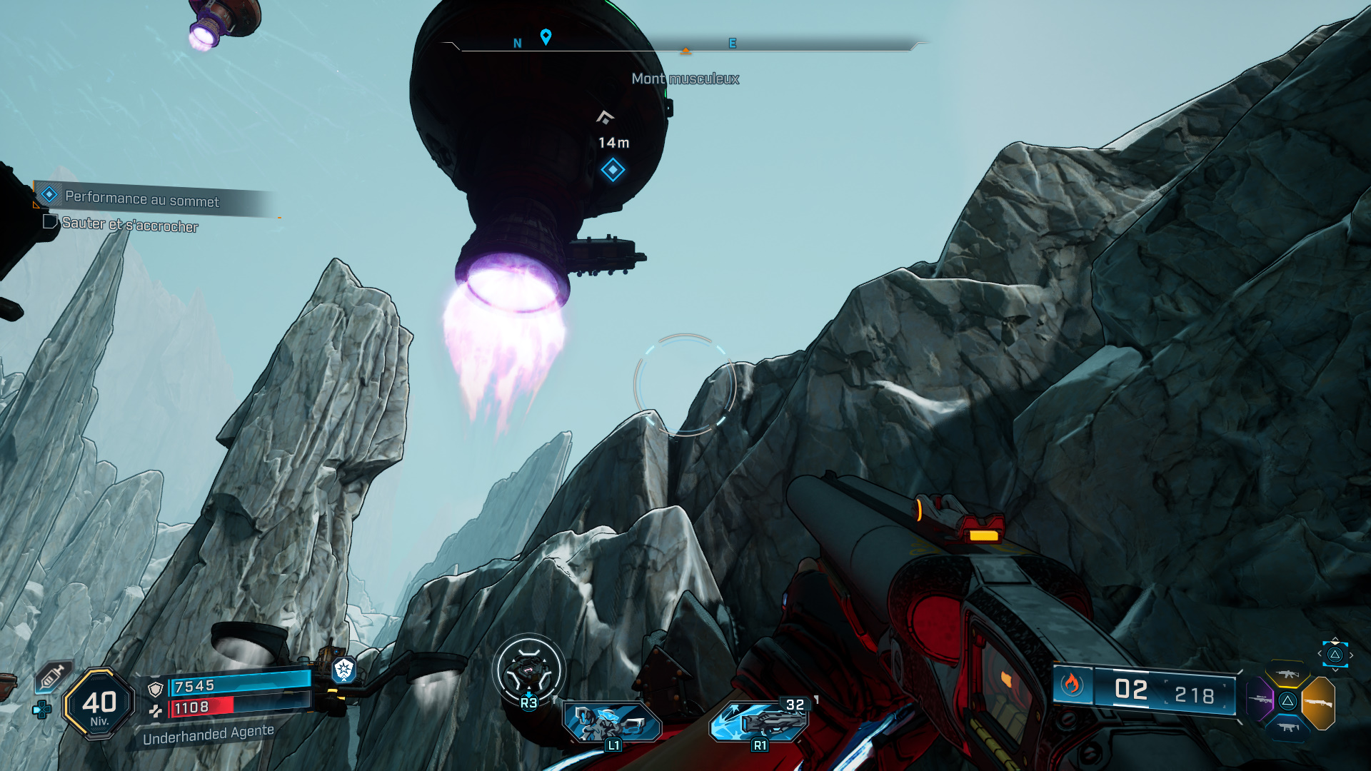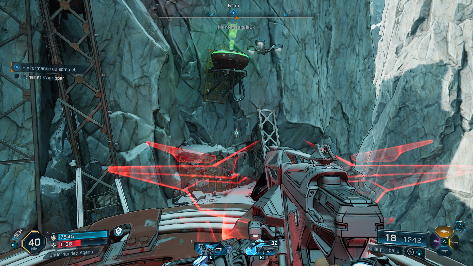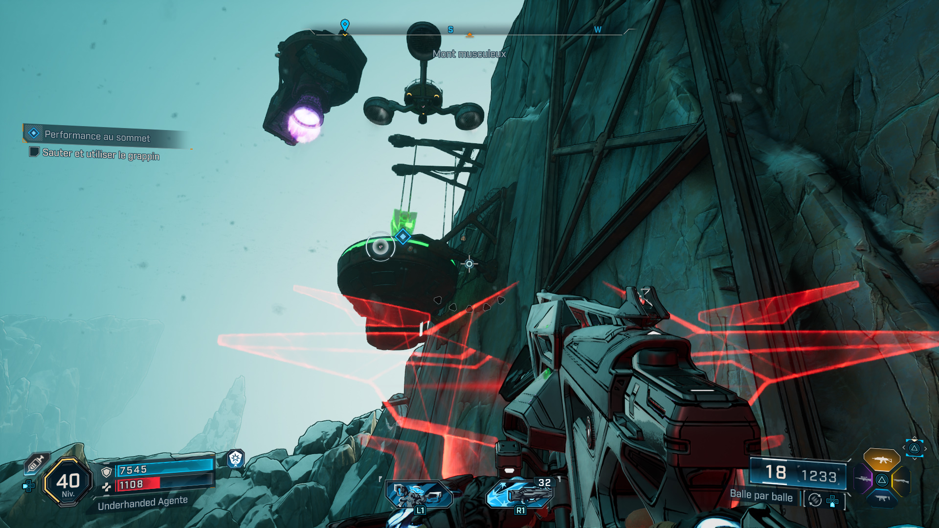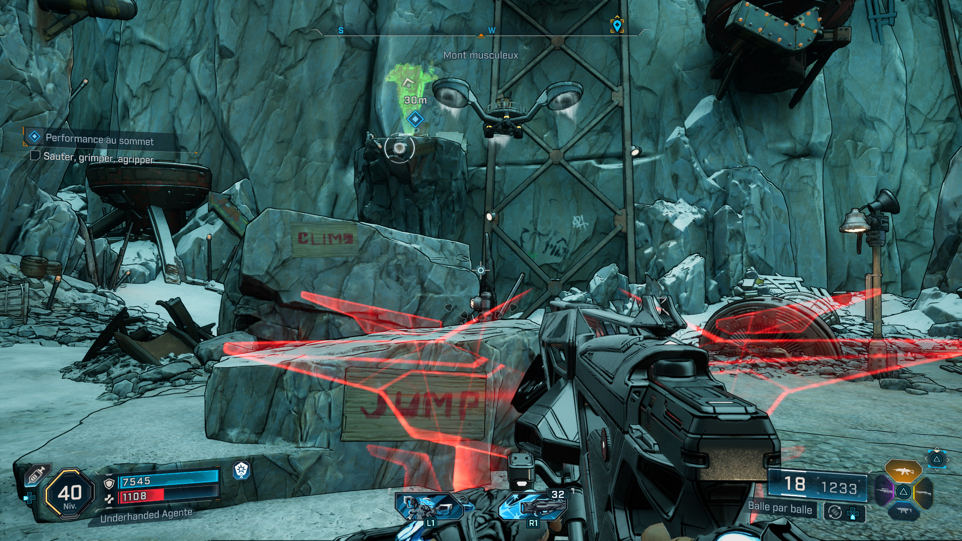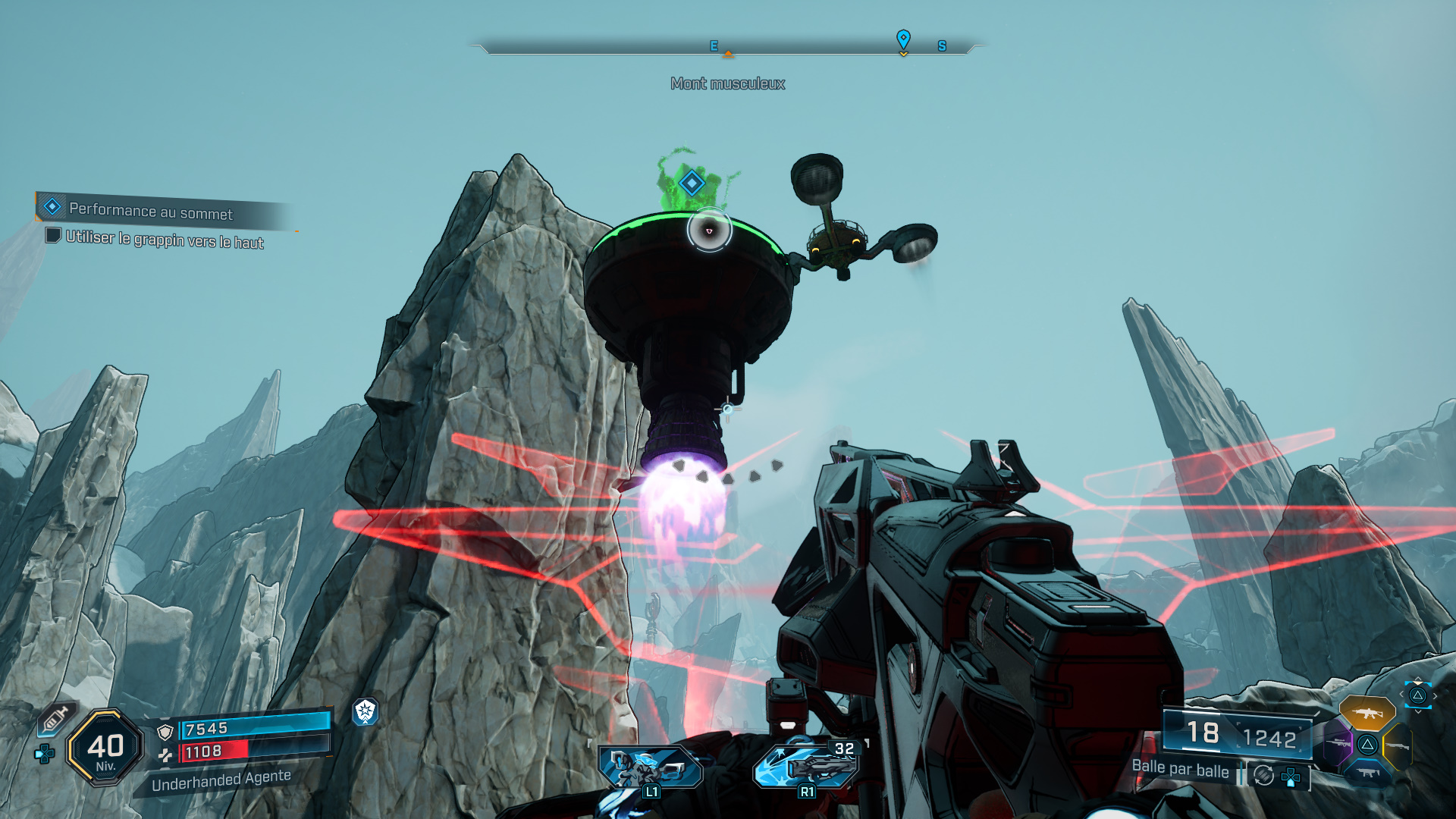 Tout d’abord, suivez le petit échauffement de Claptrap qui consiste respectivement à sauter, grimper puis agripper le point d’accroche afin de rejoindre une première petite plateforme rocheuse en hauteur. De là, enchaînez avec votre grappin grâce aux différents points d’accroche pour atteindre l’objectif.