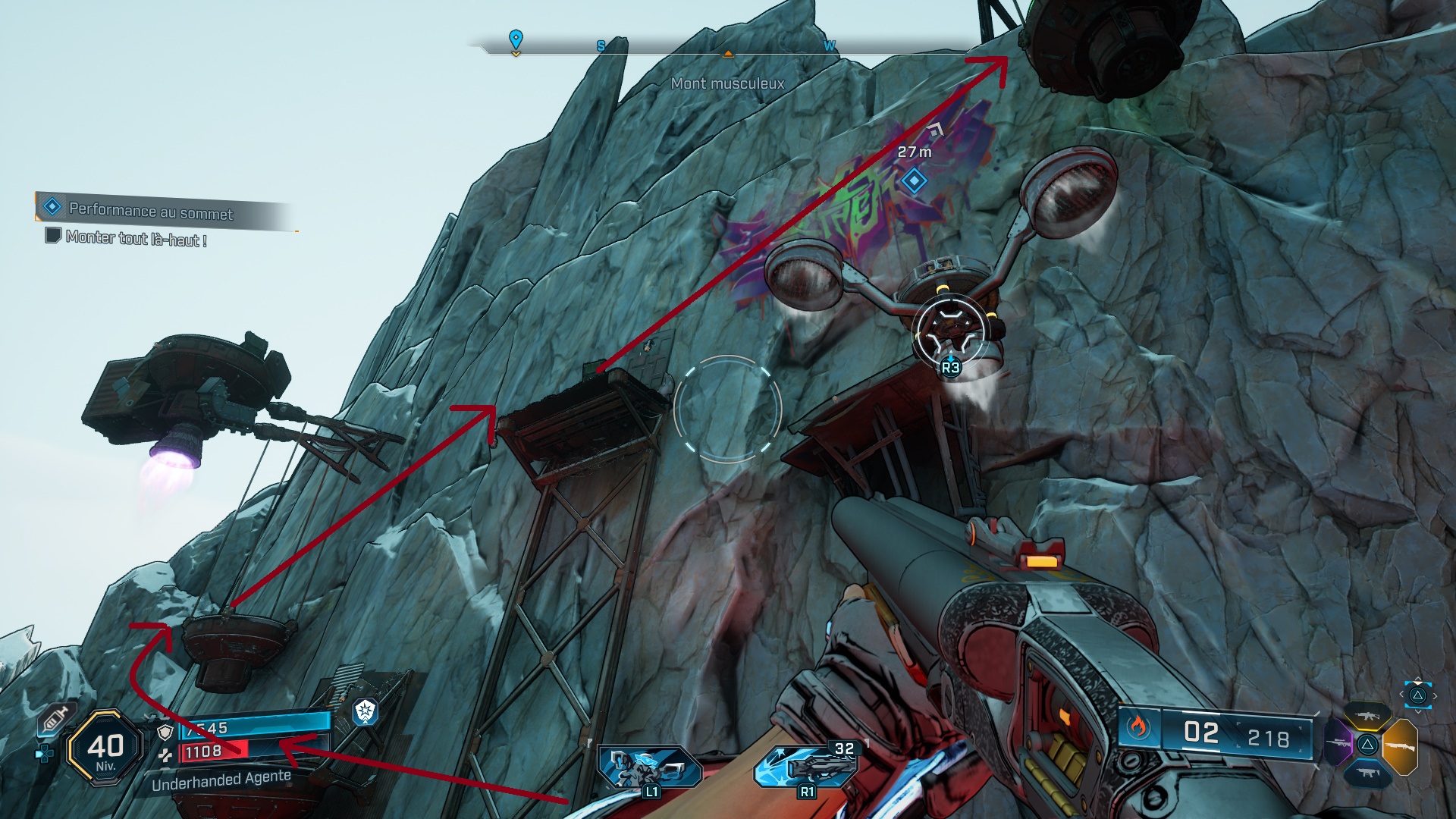 Redescendez de la plateforme et placez-vous sur celle de départ pour le deuxième défi. Ici, planez vers l’objectif suivant avant d’agripper la plateforme, puis attendez que Claptrap installe une nouvelle plateforme en hauteur pour l’atteindre à l’aide de votre grappin. Suivez ensuite le chemin indiqué sur notre image ci-dessous pour grimper tout en haut, et terminez le défi en atteignant la dernière plateforme indiquée.