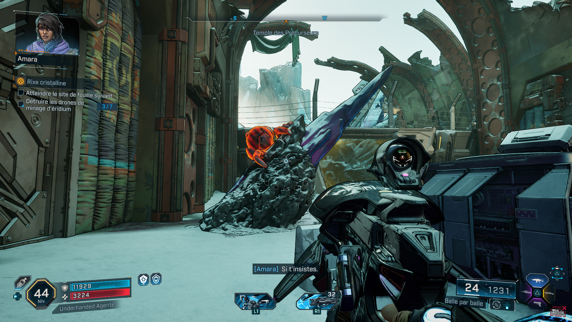 Avant de partir à la recherche de cette Sirène, parlez à Calder le Réfractaire au Puits de Belton, et sans plus tarder, mettez le cap vers l’est à bord de votre Digirunner pour rejoindre le Cœur de la Montagne. Là-bas, continuez de suivre l’indicateur de votre boussole jusqu’à déclencher une cinématique introduisant un personnage bien connu de l’opus précédent : Amara la Sirène. Bienvenue au Vestige du Sanctuary !