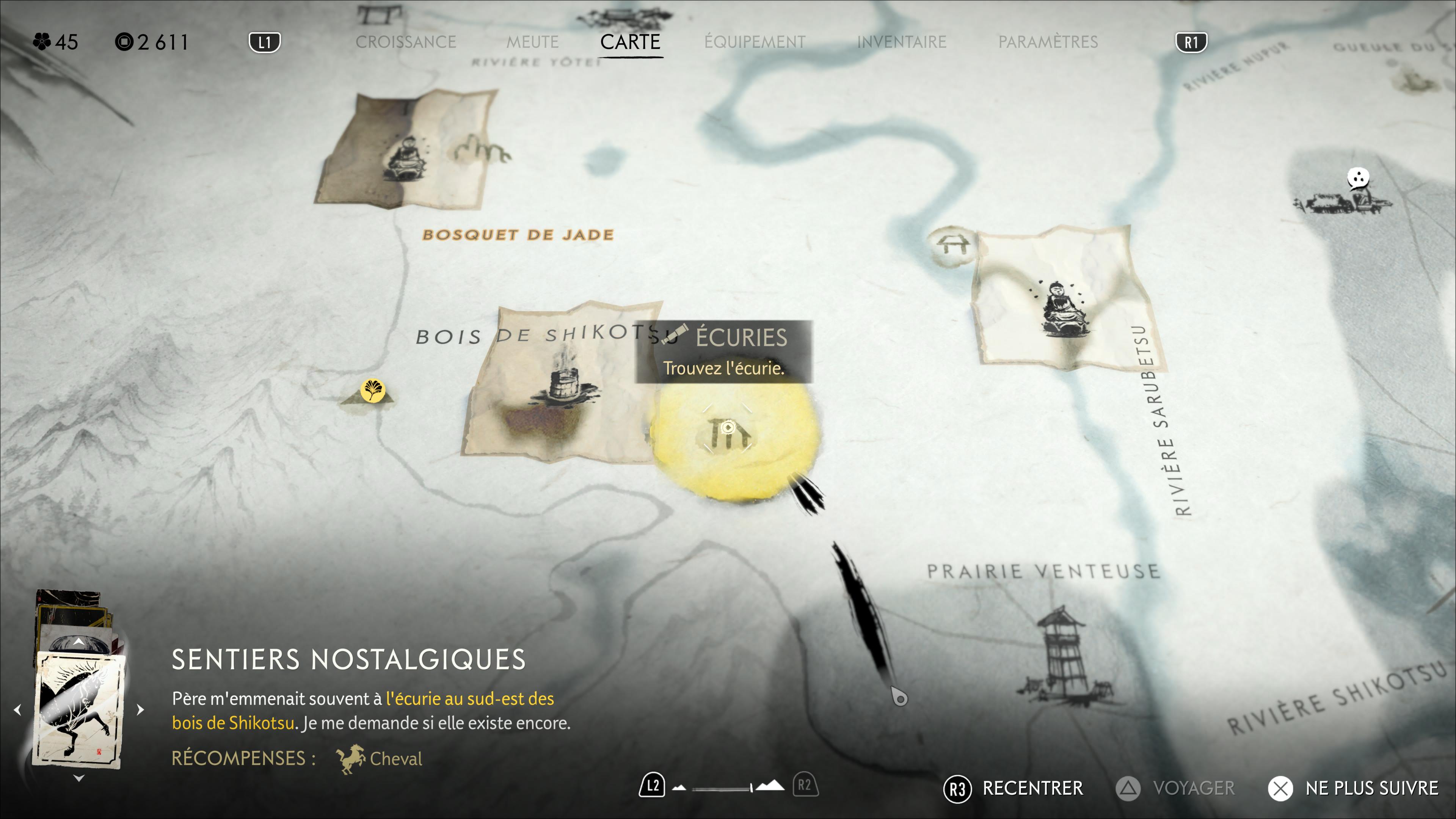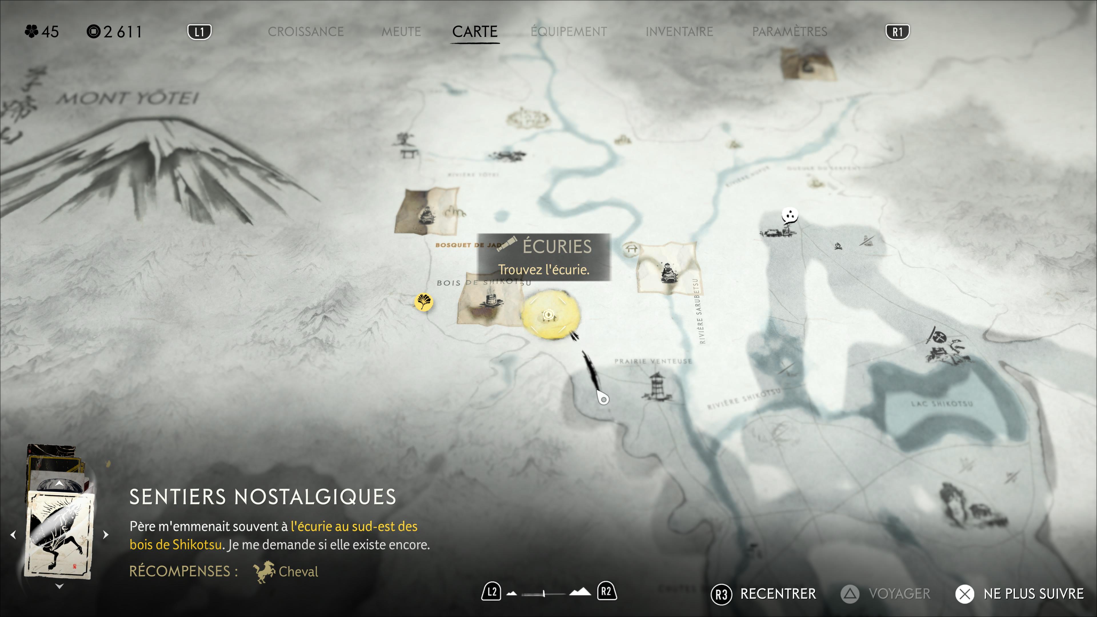 Réussir un long voyage, c’est pouvoir compter sur une monture fidèle. Dans Ghost of Yōtei, on peut compter sur un cheval depuis le début de l’aventure, mais il est possible d’en changer. Dans les Prairies de Yōtei, il existe en effet une écurie qu’Atsu a bien connu enfant. Seize ans plus tard, il est temps d’y retourner pour voir si elle est toujours debout. Direction le nord-ouest de la Prairie venteuse.