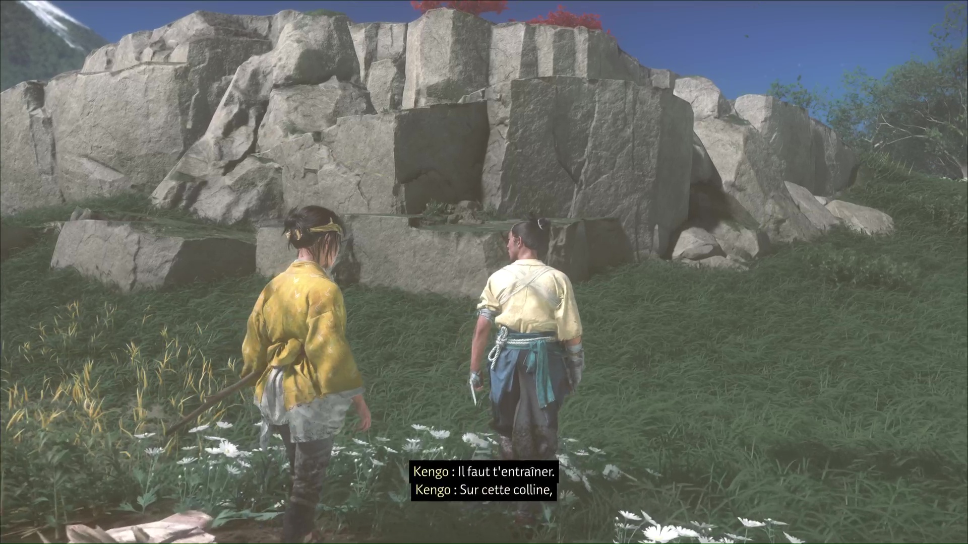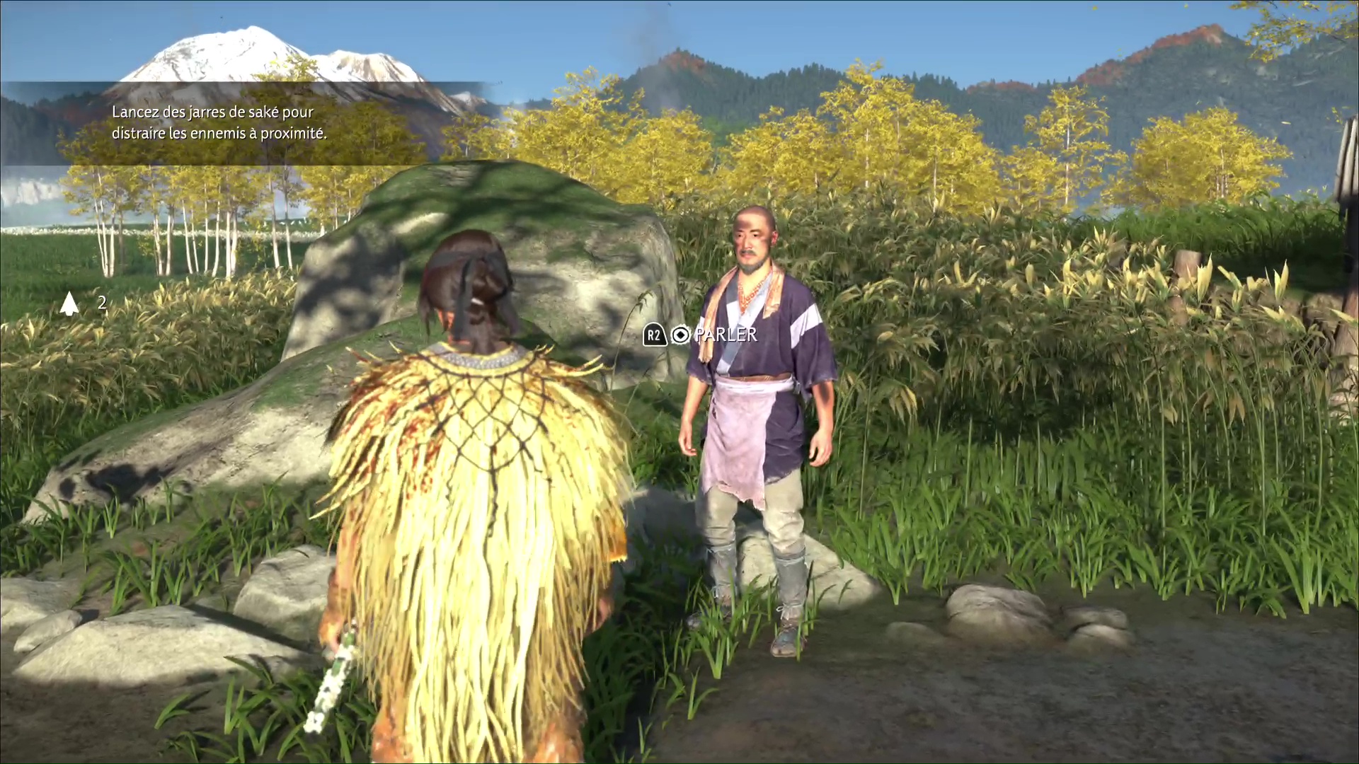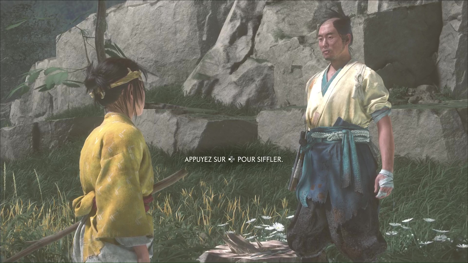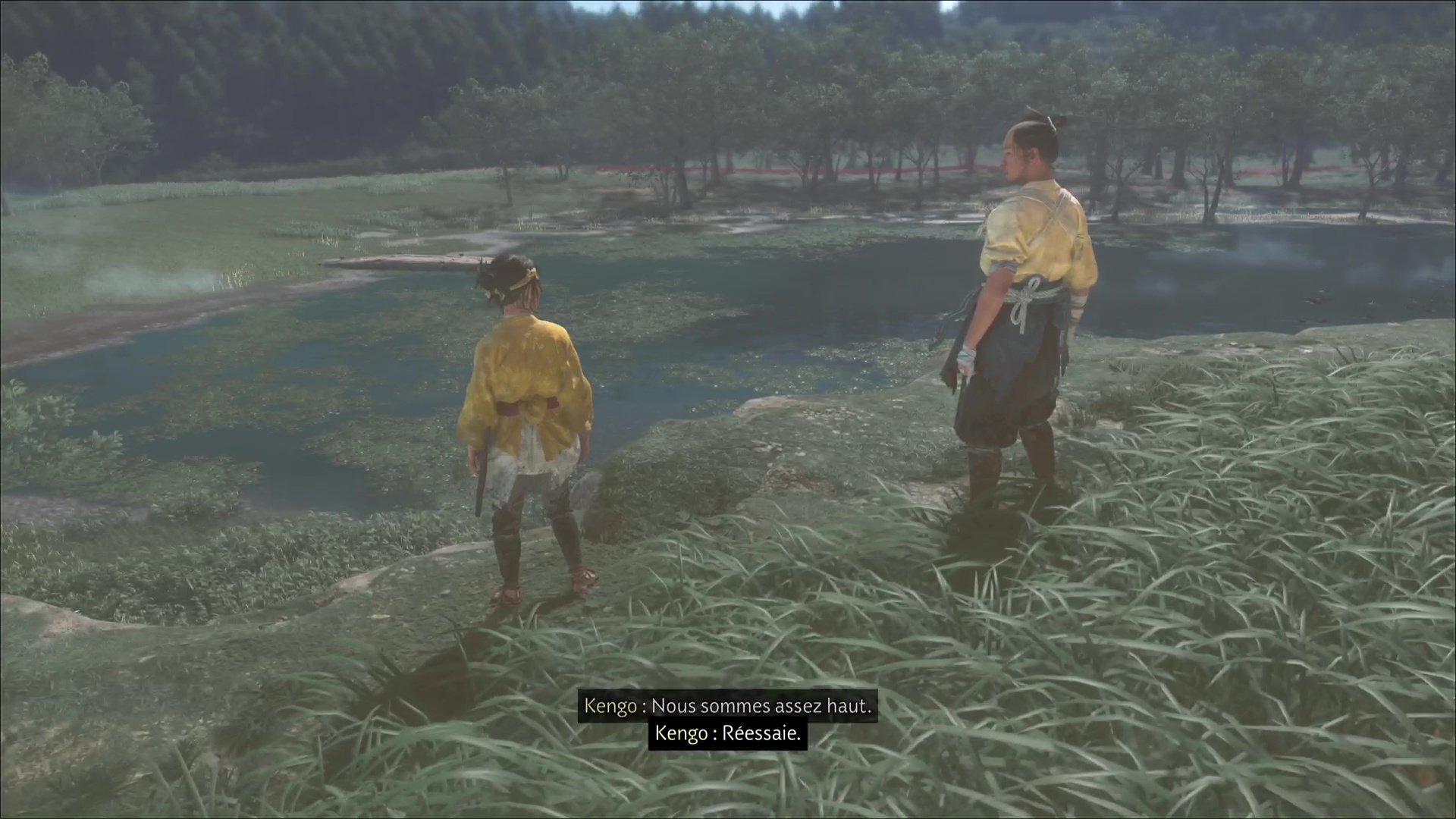 Arrivé à une souche, Kengo décide de poser un charme. Il demandera ensuite à Atsu de siffler. Faites-le, sans succès. Prenez ensuite de la hauteur en montant sur la colline juste à côté.