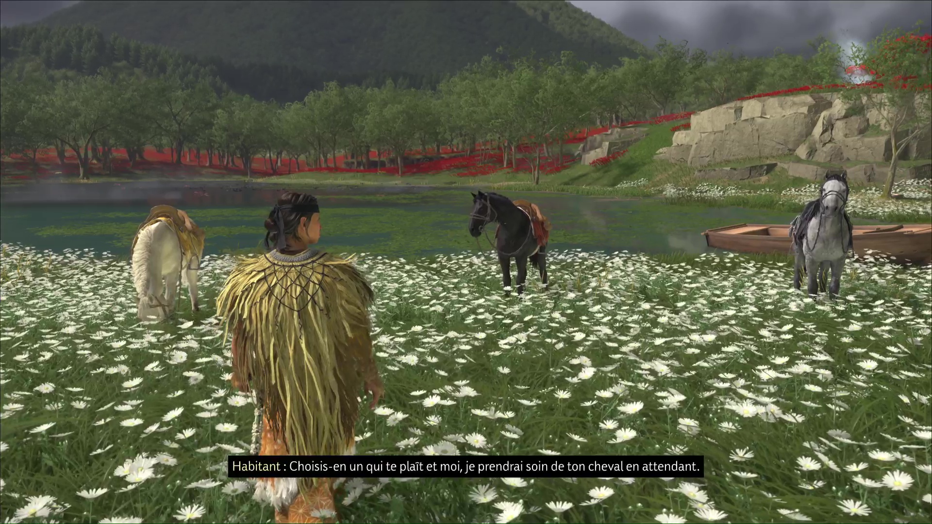 Justement, de retour au présent, le propriétaire tient sa parole. Sifflez pour faire rappliquer des chevaux. Vous avez le choix entre trois. Il est possible de garder le blanc, que vous avez depuis le début, sinon un noir et un gris peuvent être choisis.