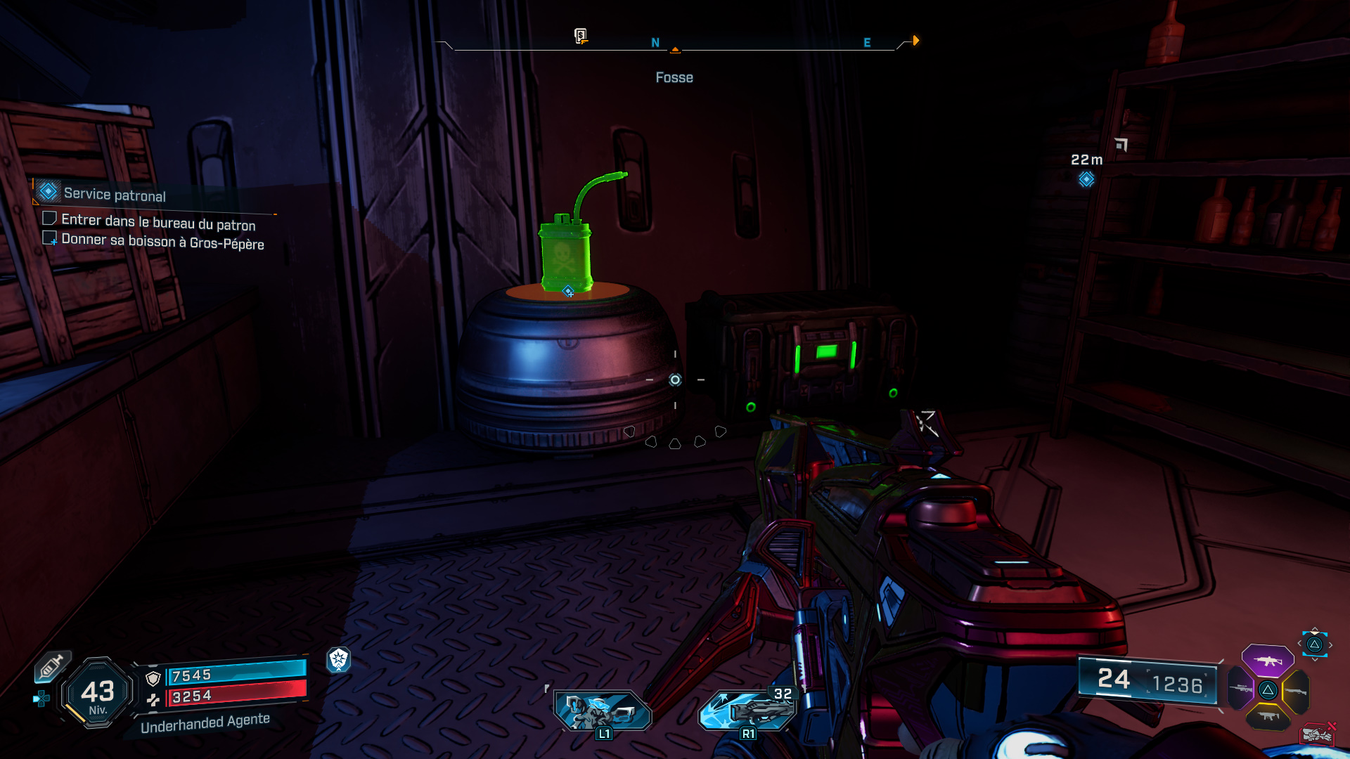 Approchez-vous du bar, prenez la boisson de Gros-Pépère et apportez-lui, enfin… jetez-lui à la figure pour qu’il vous laisse passer, ce qui contourne la sécurité et rejoint finalement votre objectif principal consistant à entrer dans le bureau du patron.