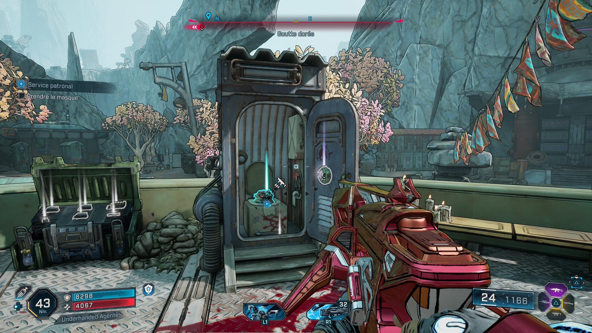 Une fois à l’intérieur, avancez et parlez de nouveau à Picketty qui, de façon plus conciliante, vous suggère de vous rendre du côté de la Goutte Dorée dans la Forêt de l’Hémoroc. En arrivant sur place, nettoyez la zone d’objectif des Atropées et cherchez le point d’échange marqué sur votre boussole. Un point d’échange qui n’est autre qu’une cabine WC, ouvrez alors la porte pour y trouver le masque du patron.