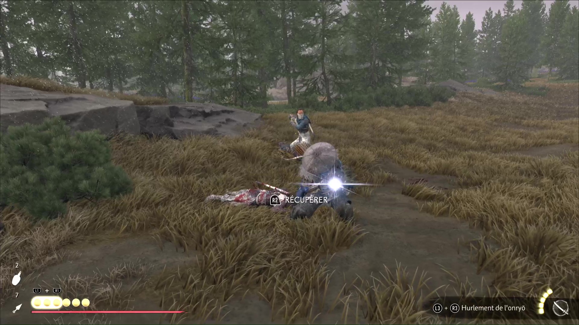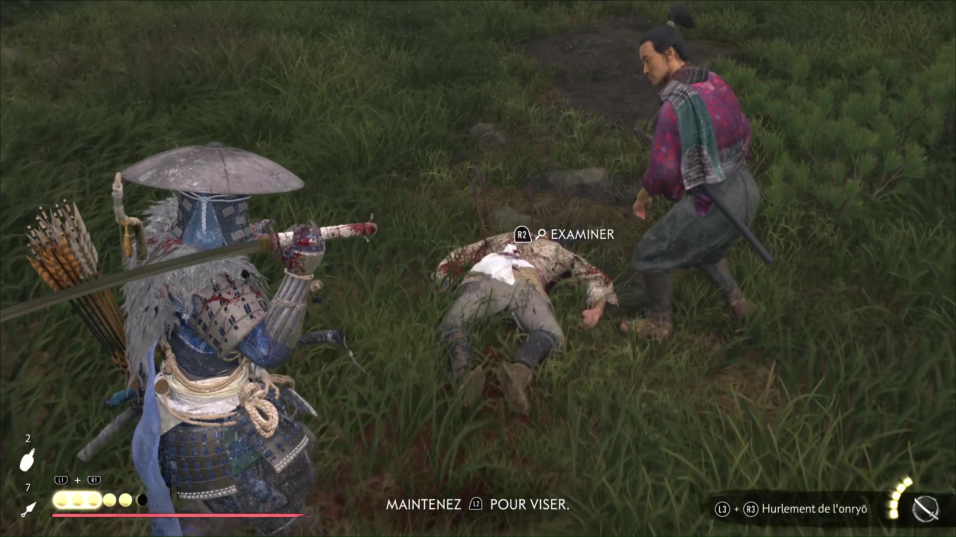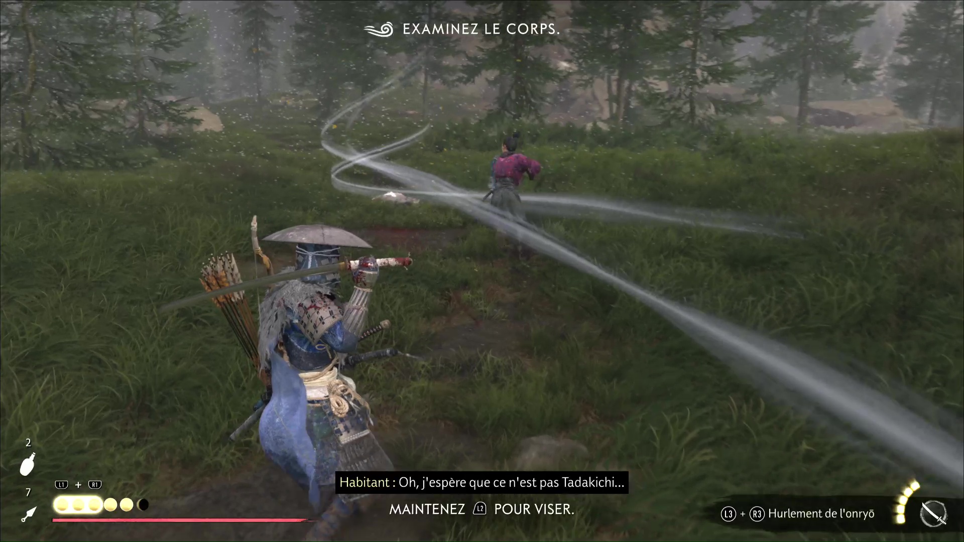 Une fois les Neuf-Queues vaincus, reprenez votre route. Au bout de quelques mètres, le frère tombe sur un corps, en espérant que ce ne soit pas son frère. Examinez le corps et, heureusement, il ne s’agit pas de Tadakichi.