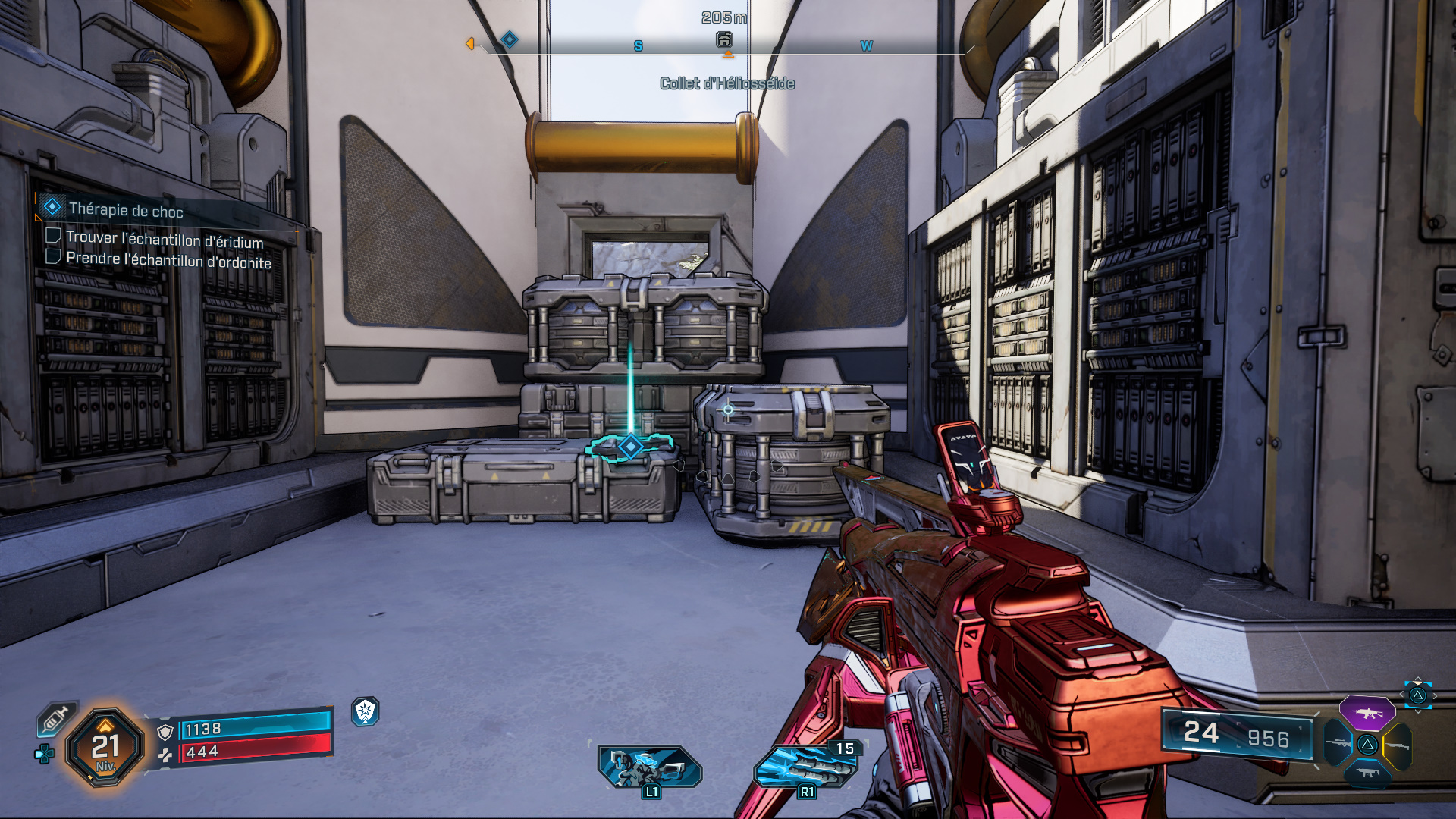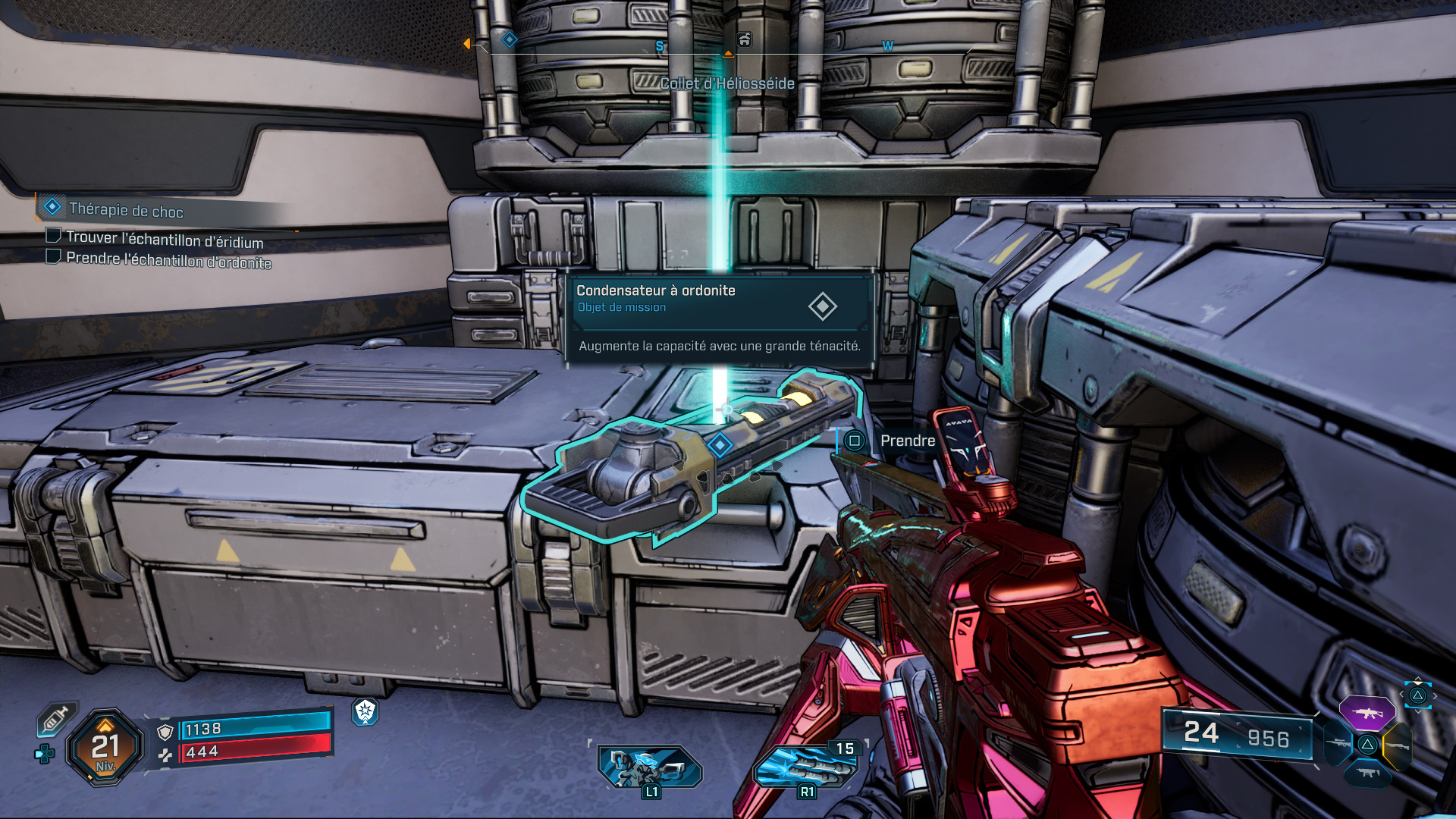 Parlez à la Professeure Ambreleigh pour accepter sa requête consistant à récolter 2 types de minerai : un échantillon d’éridium et un autre d’ordonite. Vous pouvez les récupérer dans n’importe quel ordre, ici, nous choisissons d’aller d’abord vers le nord, pas très loin de là. Suivez votre boussole pour rejoindre la zone d’objectif, là où vous trouverez un condensateur à ordonite sur des caisses entre deux petits silos.