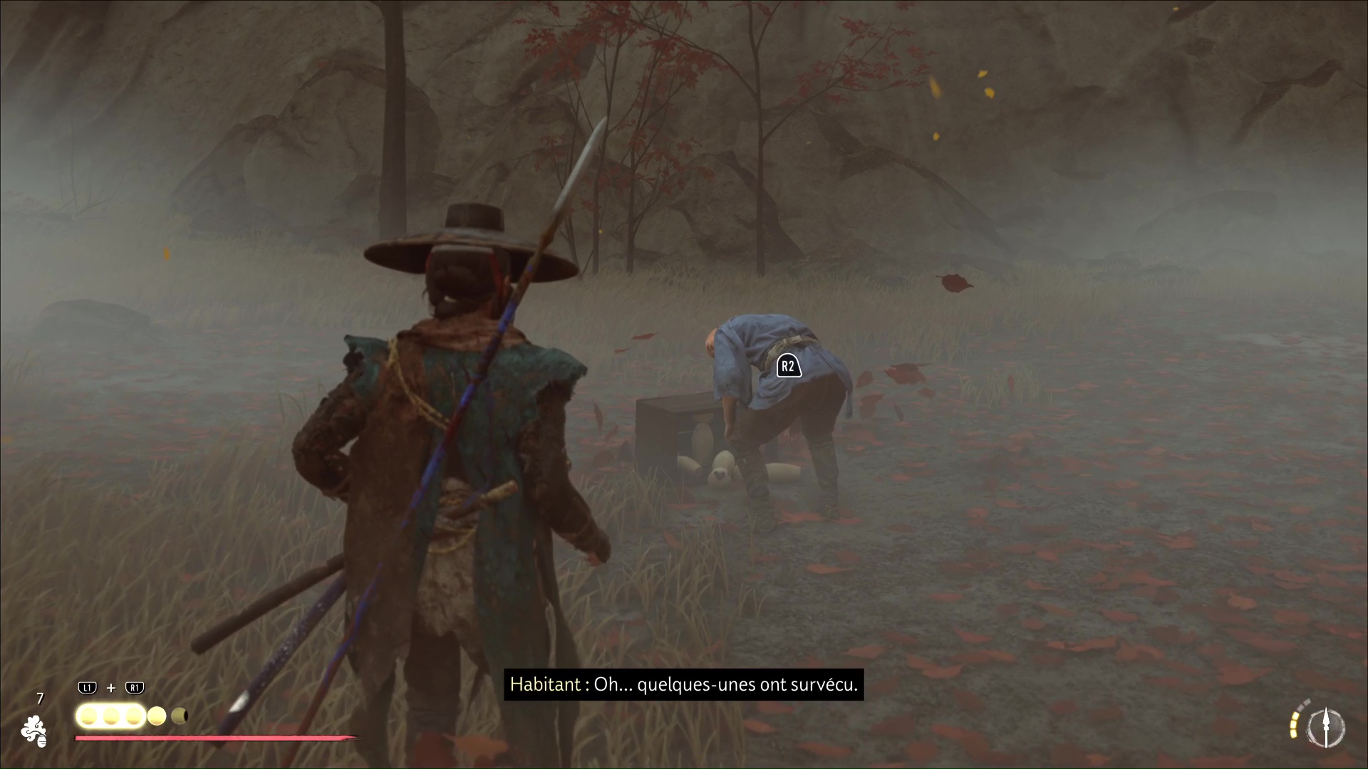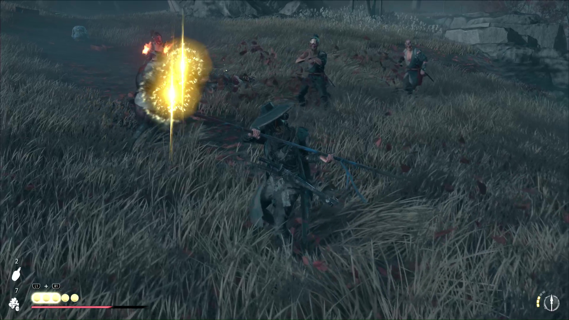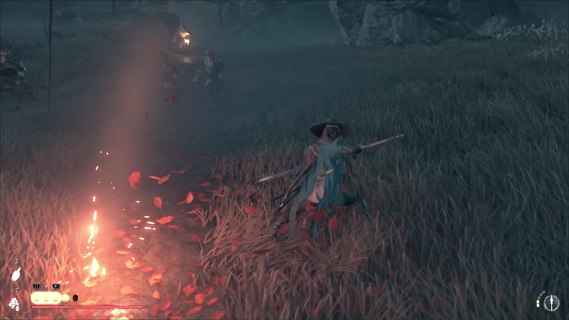 Arrivé à destination, les ronin prennent peur face à la supériorité numérique des pillards, vous laissant seul(e) contre tous. Prenez garde au pyromane et allez cueillir rapidement les archers sur le rocher devant vous. Plusieurs ennemis tiennent aussi des doubles faucilles, qu’ils peuvent enflammer.