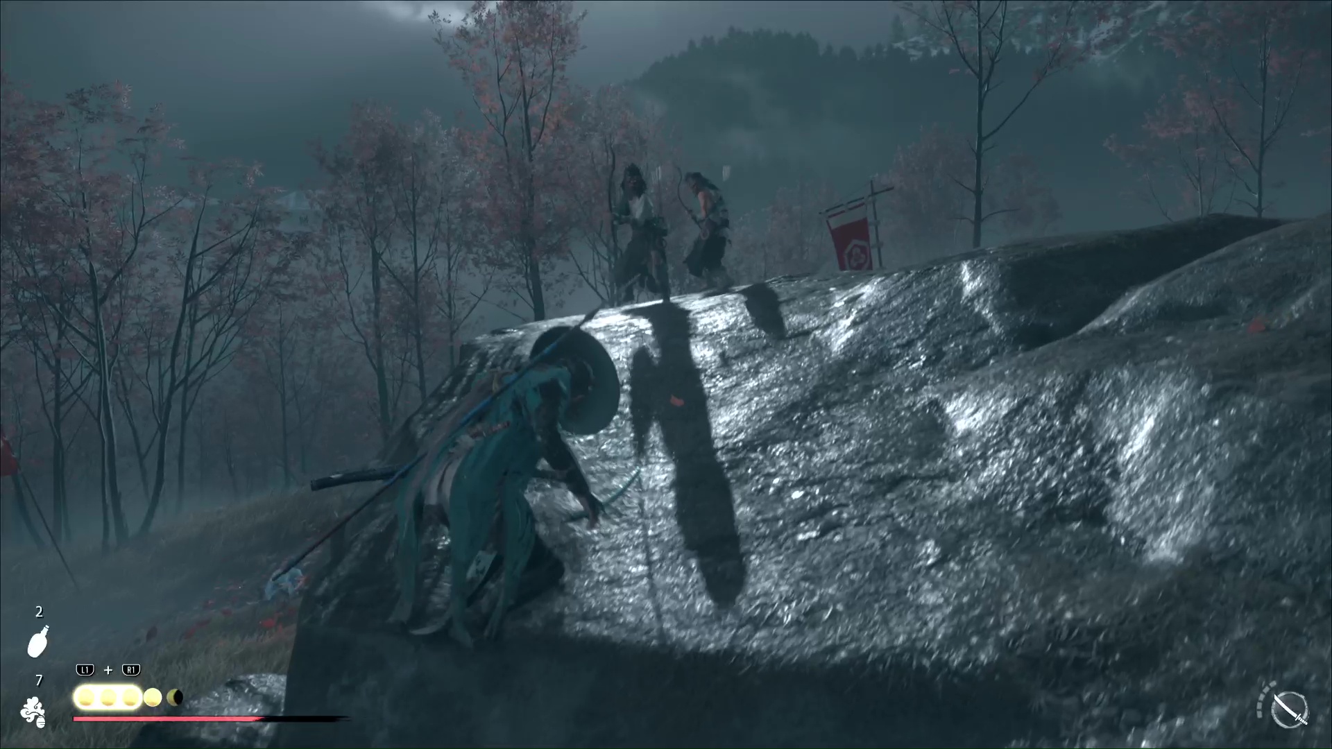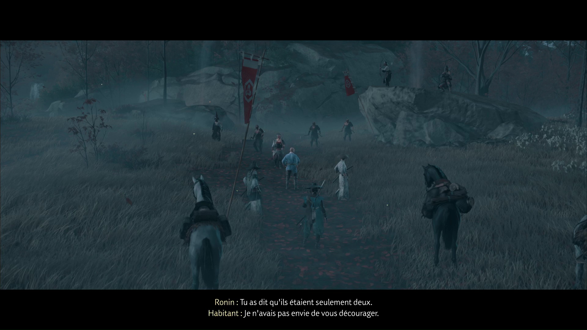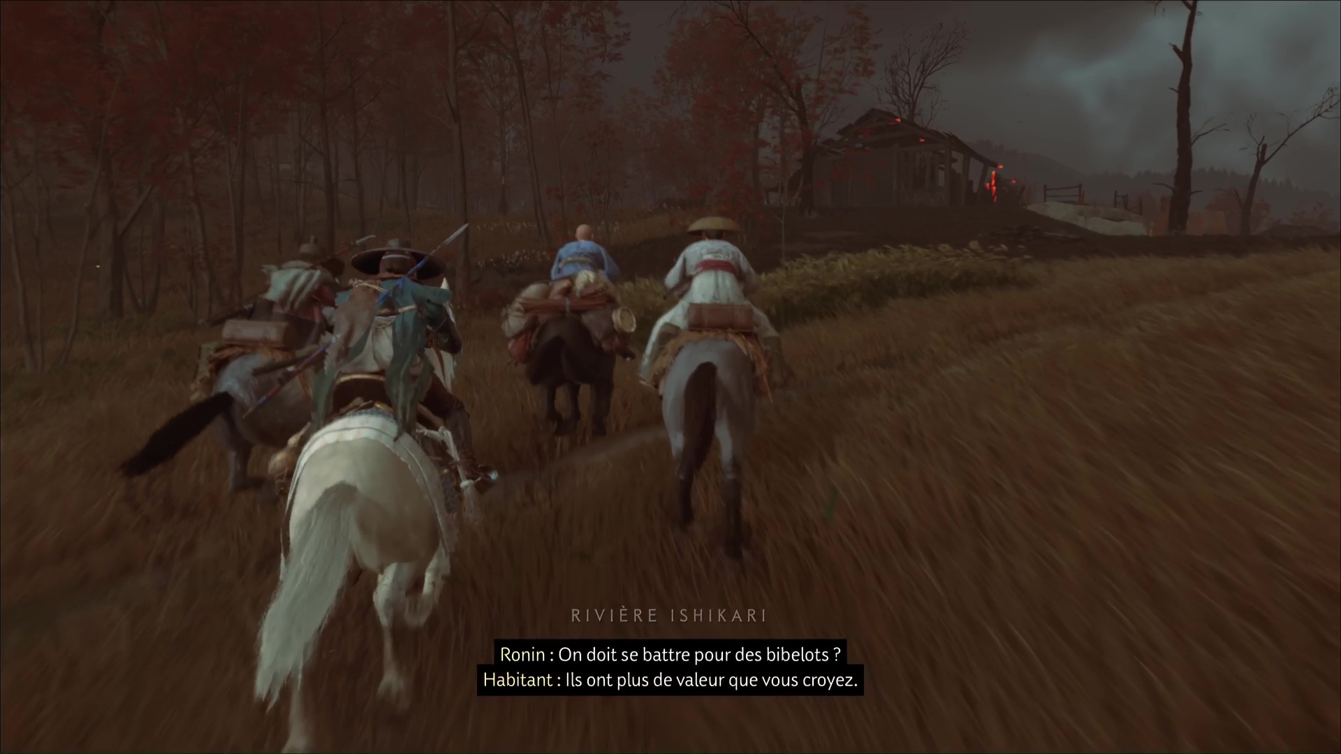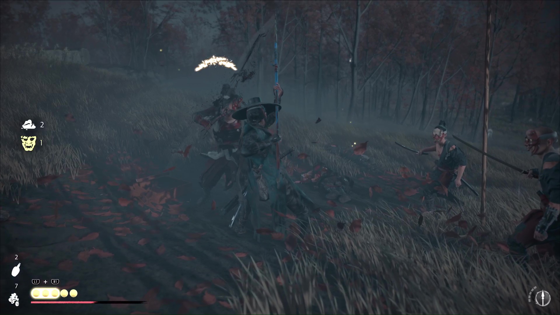 Arrivé à destination, les ronin prennent peur face à la supériorité numérique des pillards, vous laissant seul(e) contre tous. Prenez garde au pyromane et allez cueillir rapidement les archers sur le rocher devant vous. Plusieurs ennemis tiennent aussi des doubles faucilles, qu’ils peuvent enflammer.