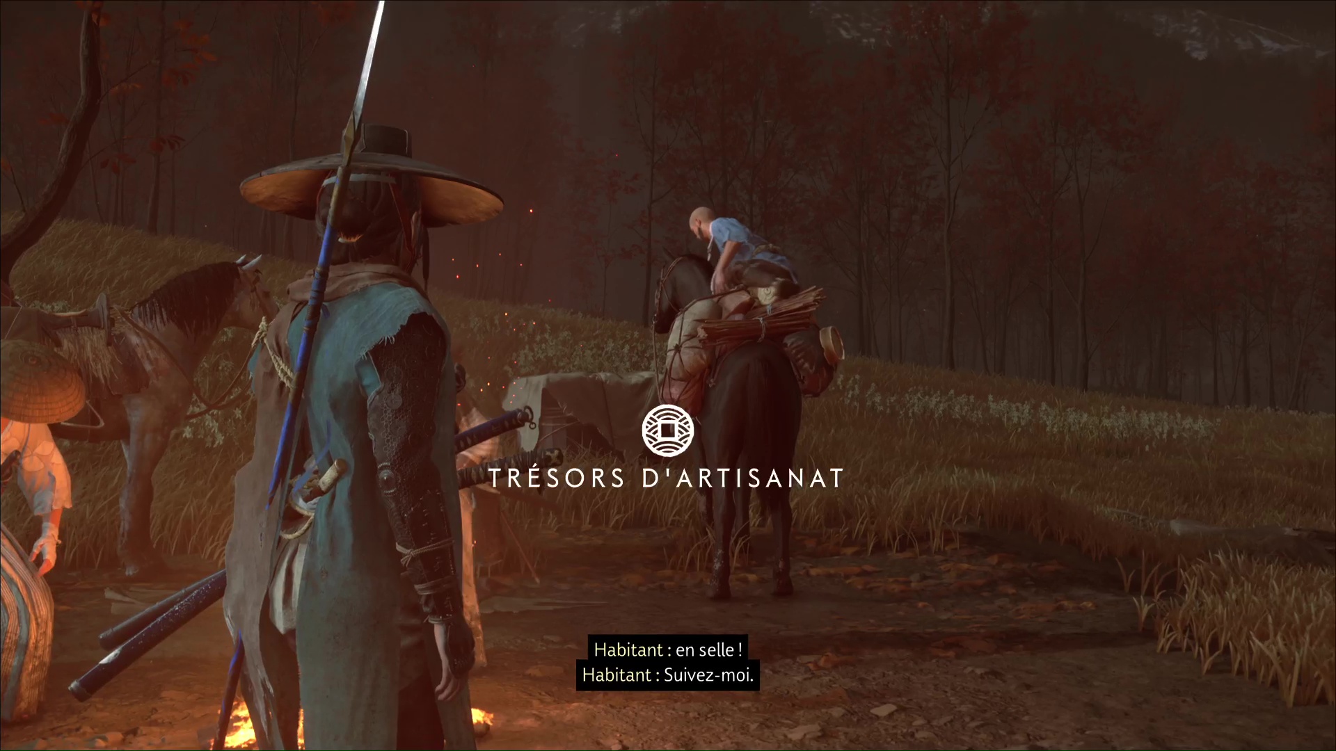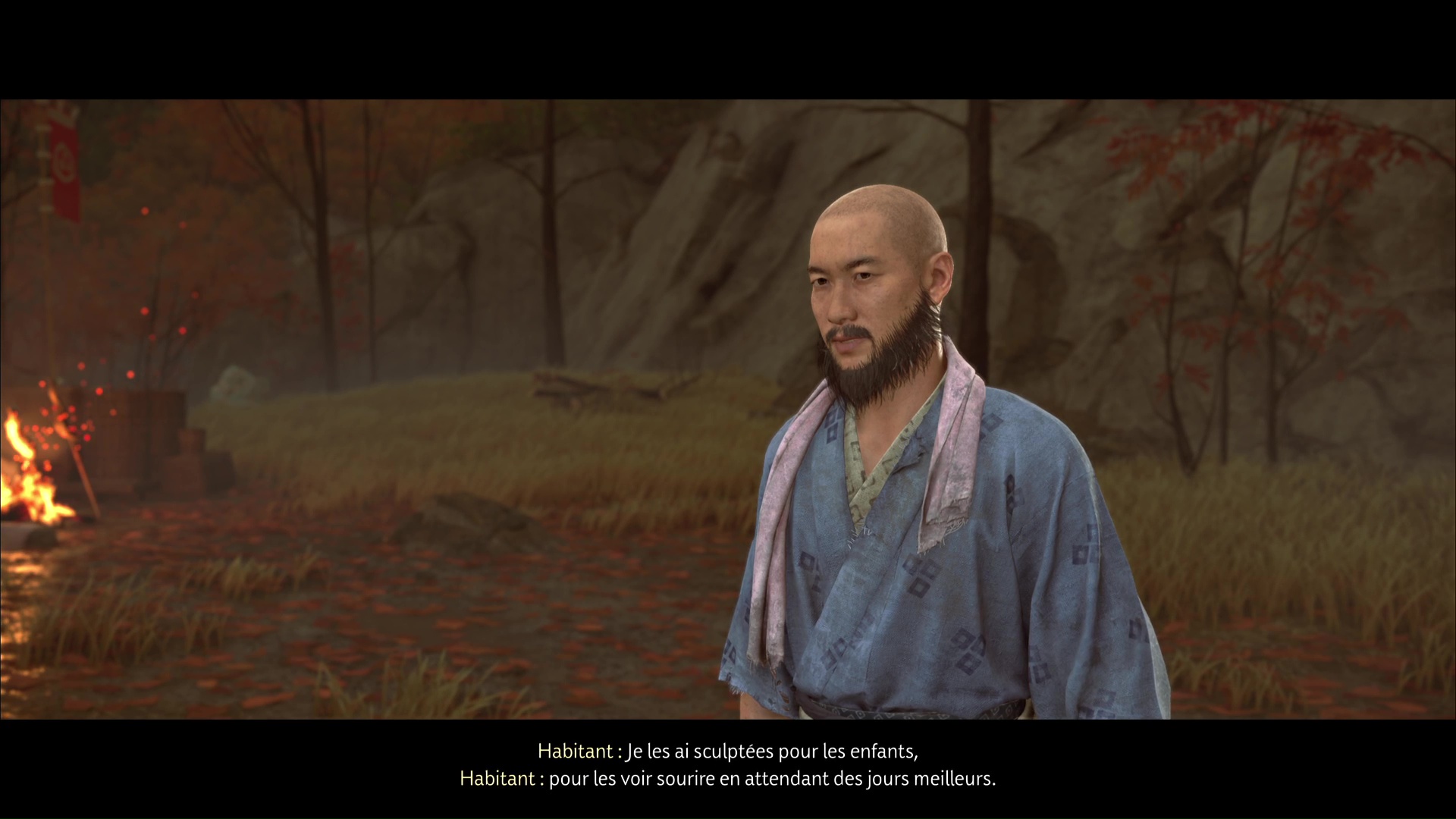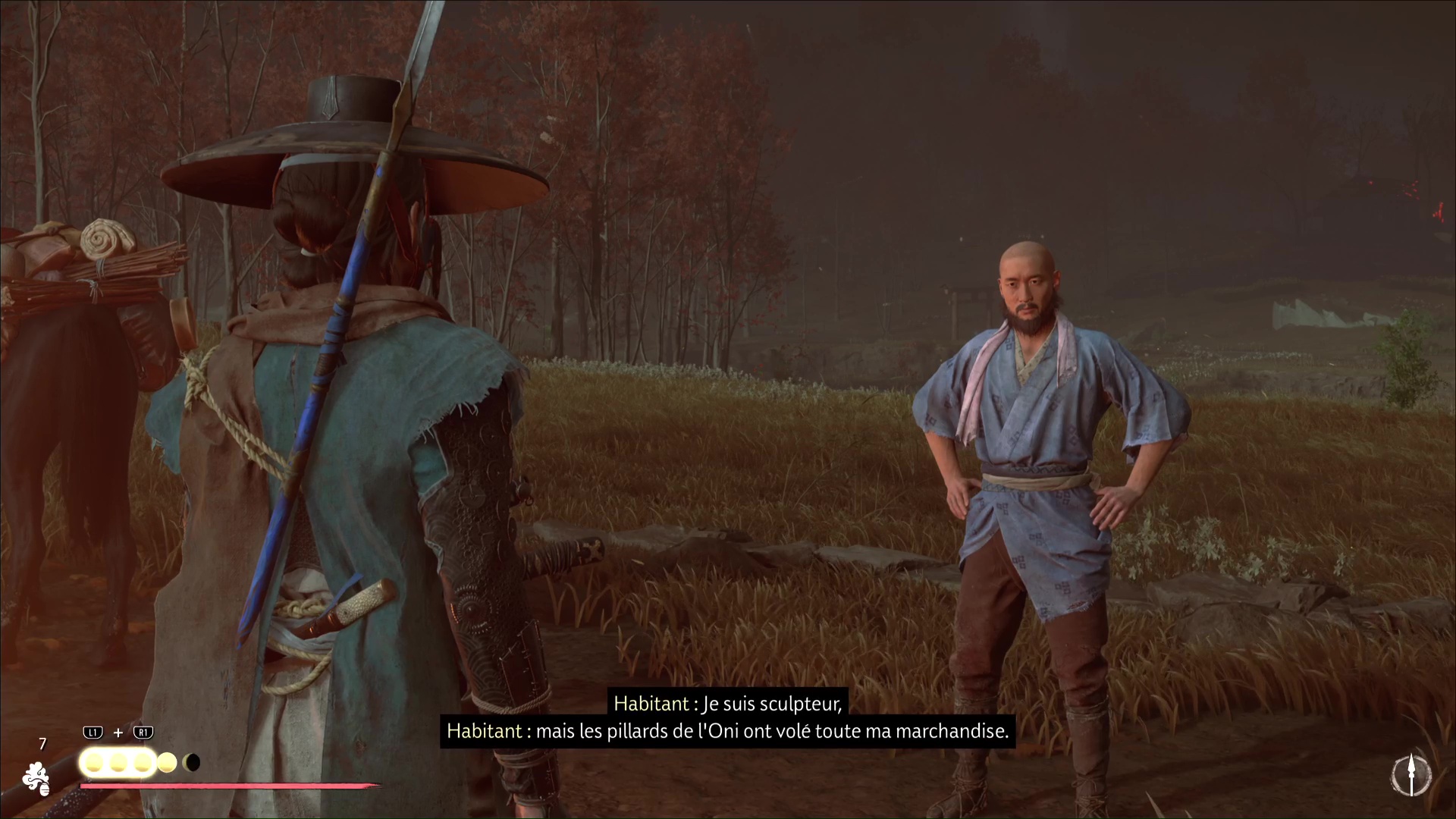 Parlez-lui et il vous confiera ses mésaventures. Ses œuvres ont été volées par les pillards de l’Oni. D’autres ronin l’accompagnent déjà, mais le sculpteur préfère compter sur une personne supplémentaire. Acceptez la mission et suivez le sculpteur à cheval.