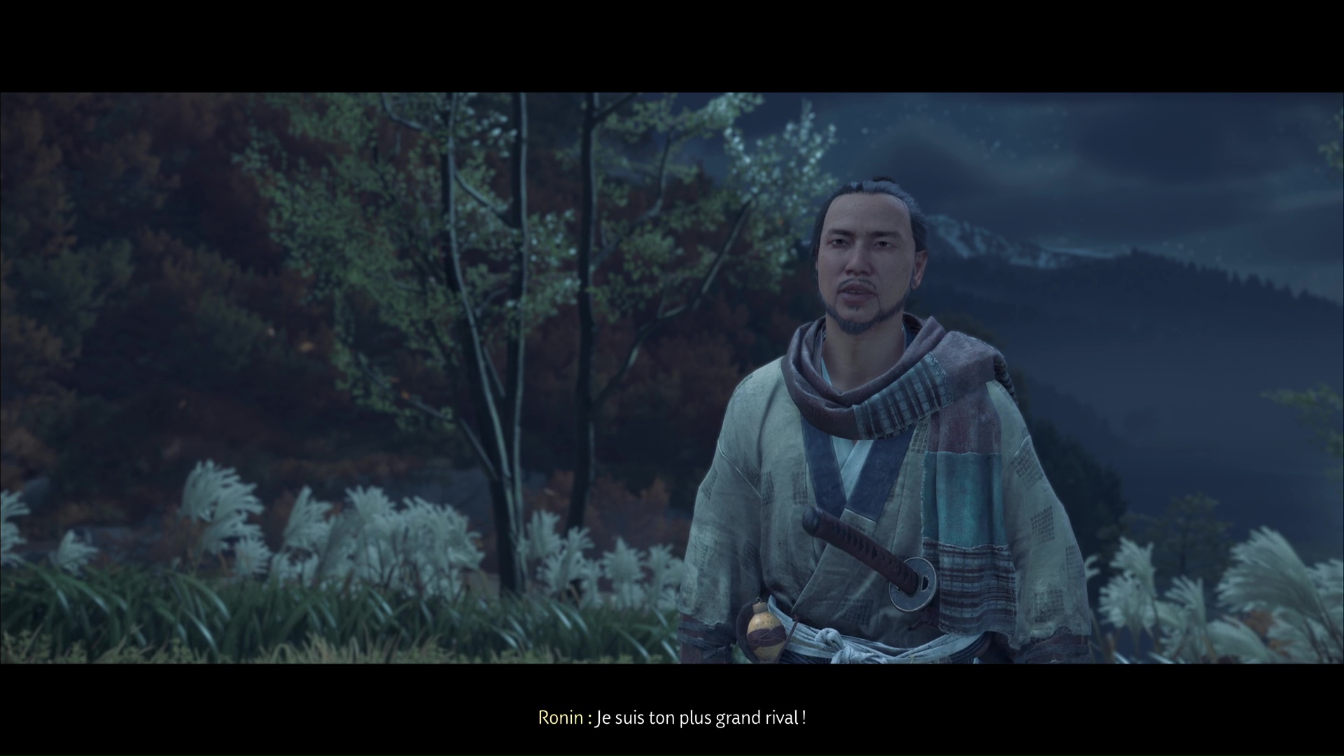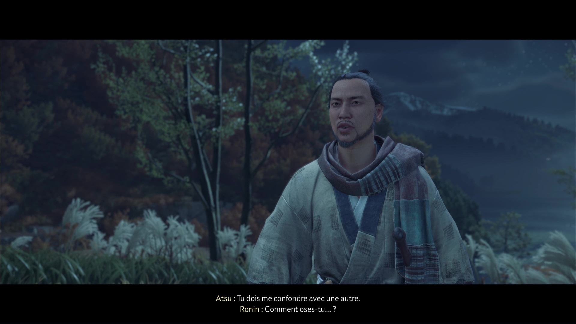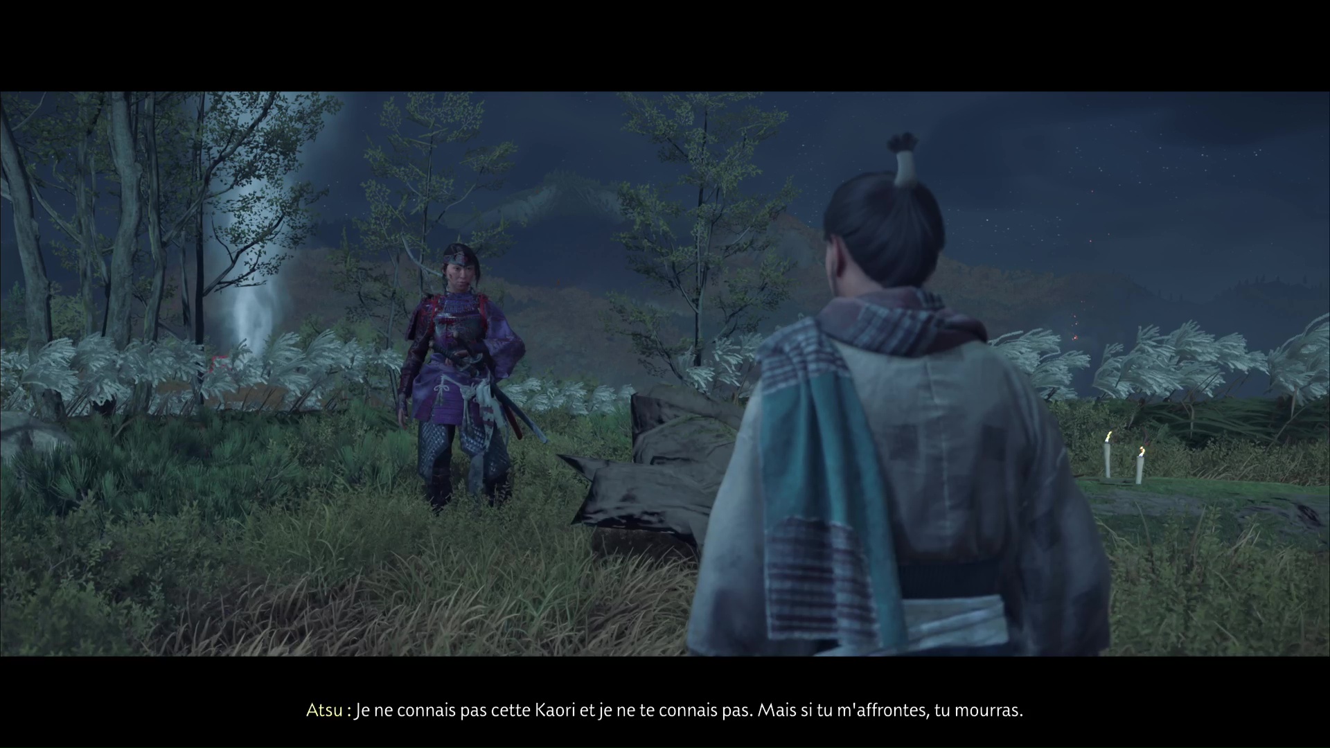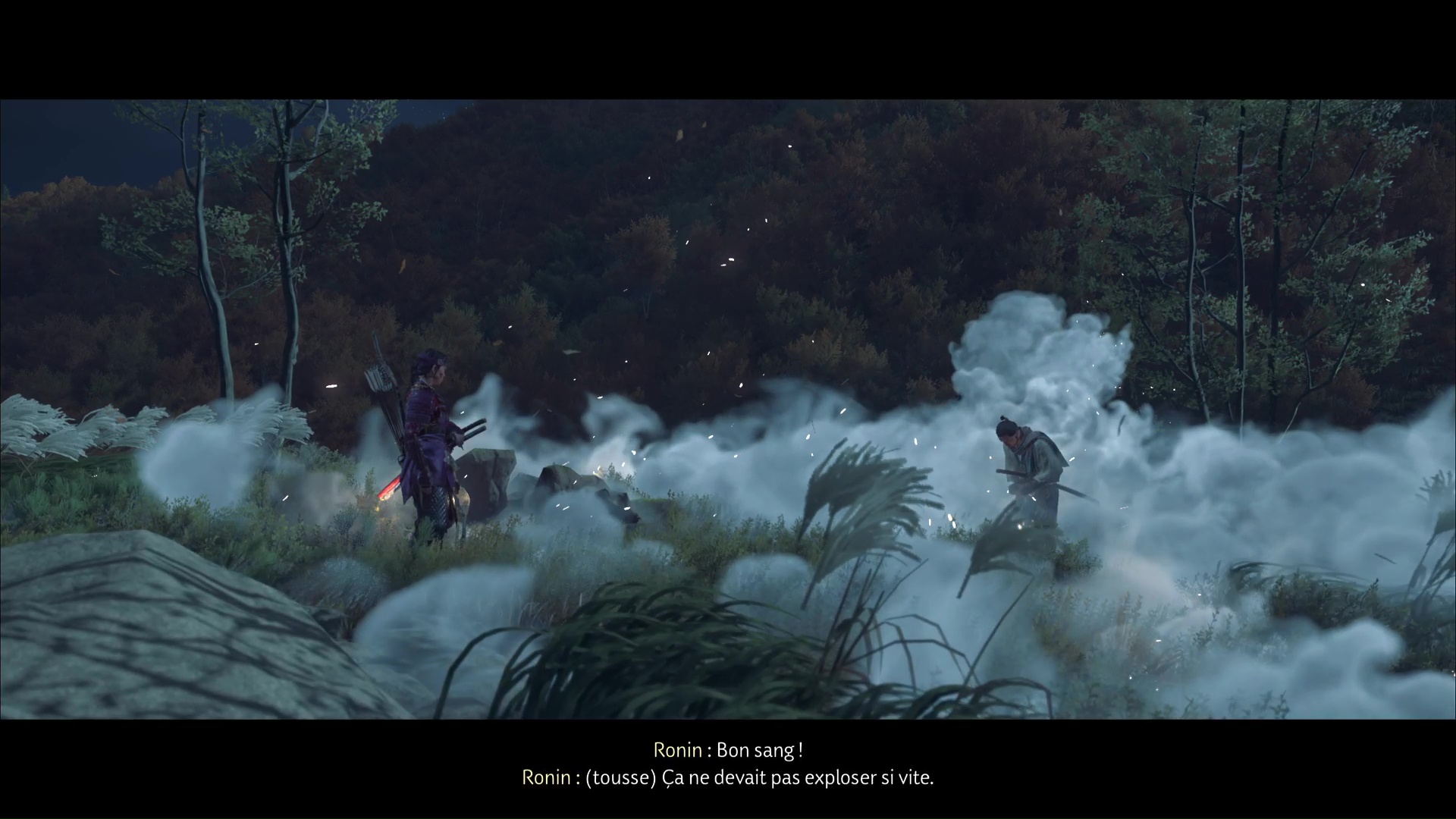 Sur place, et sur un arbre mort couché, un bouquet de fleurs entouré de bougies pousse à l’intérieur. Examinez-le et un ronin va surgir. Il va confondre Atsu avec quelqu’un d’autre et, en voulant faire un effet avec sa bombe fumigène, il se plante et celle-ci explose trop tôt.