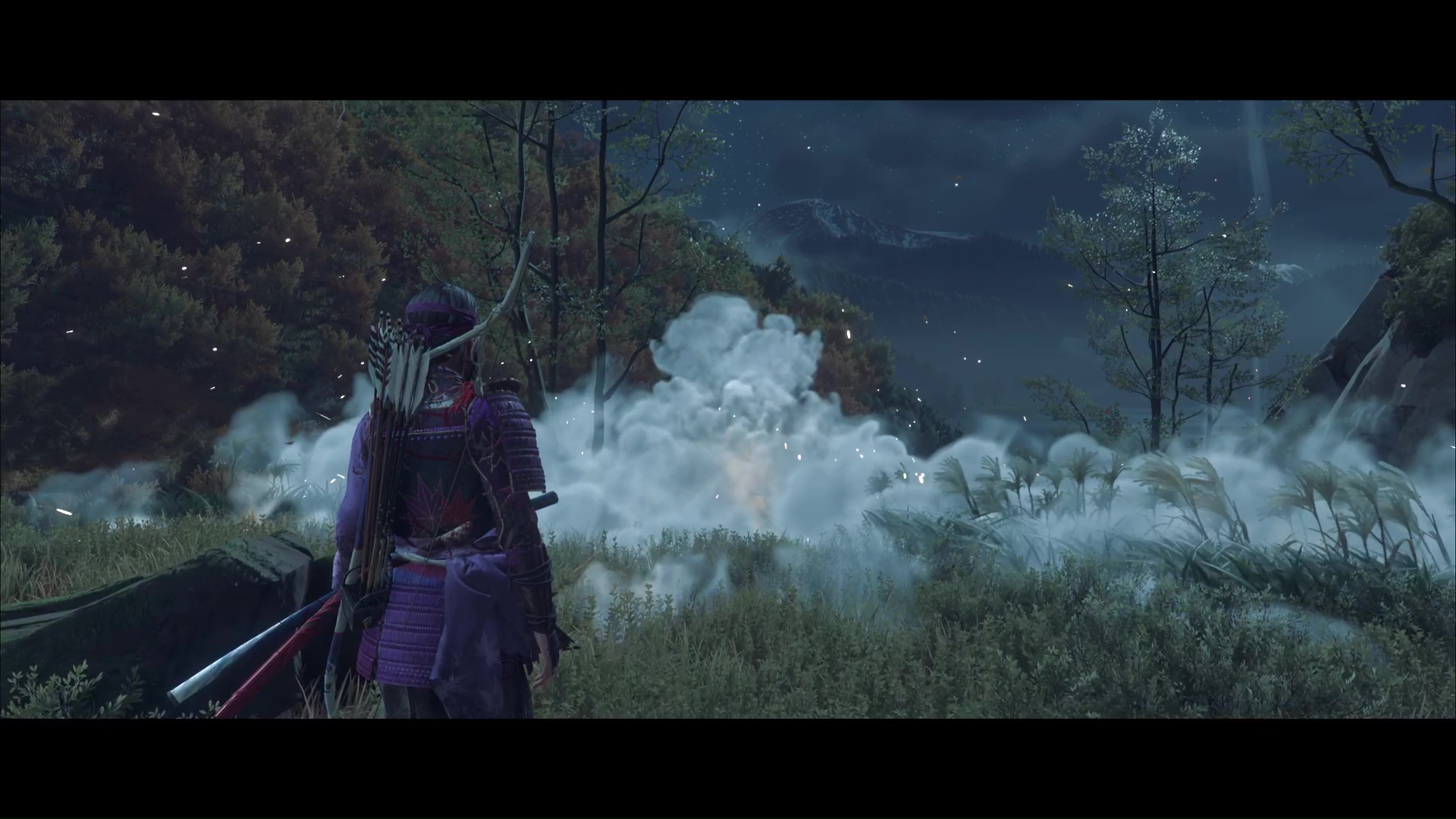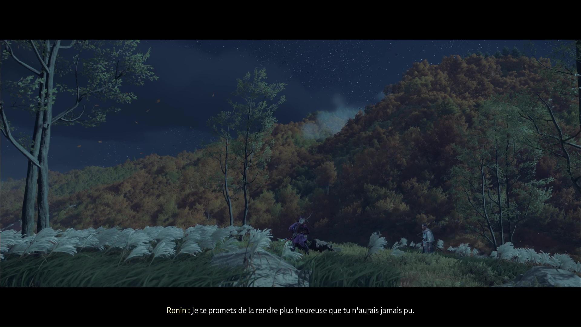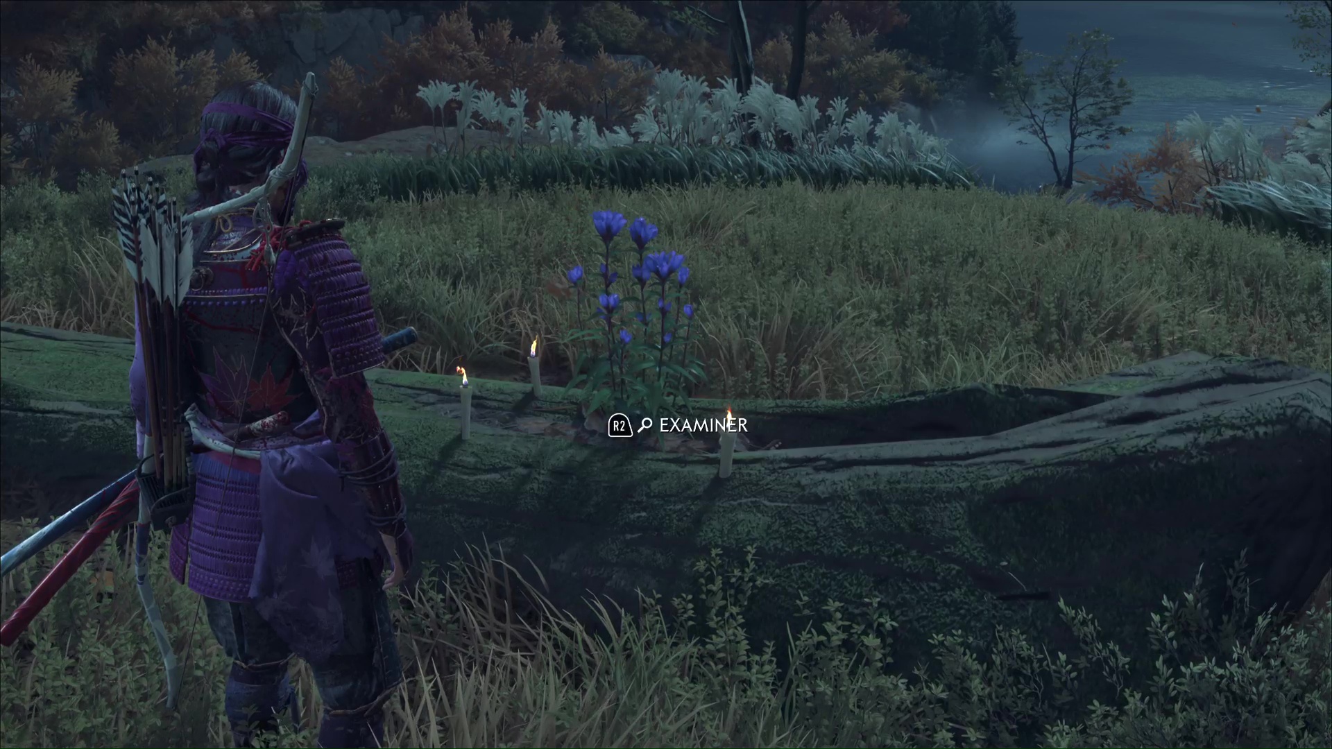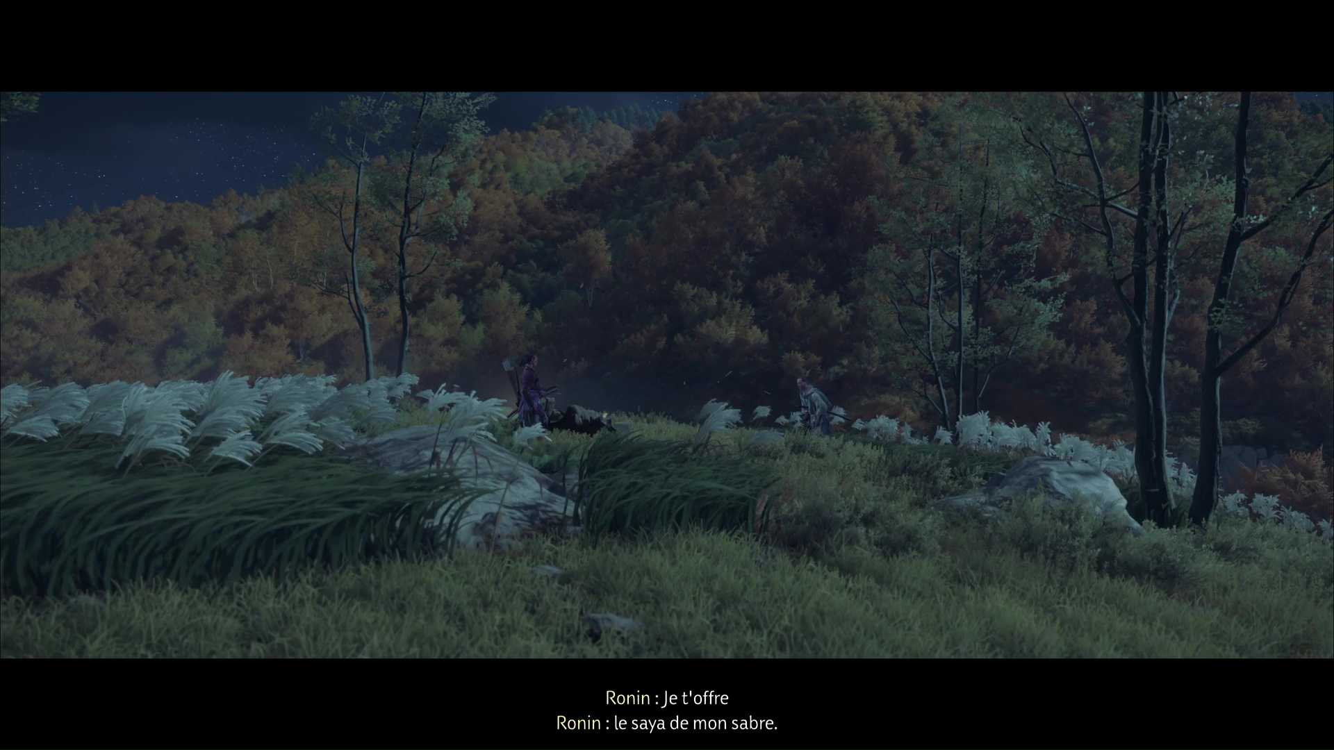 Sur place, et sur un arbre mort couché, un bouquet de fleurs entouré de bougies pousse à l’intérieur. Examinez-le et un ronin va surgir. Il va confondre Atsu avec quelqu’un d’autre et, en voulant faire un effet avec sa bombe fumigène, il se plante et celle-ci explose trop tôt.