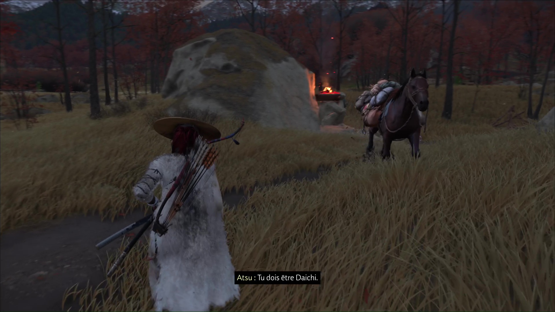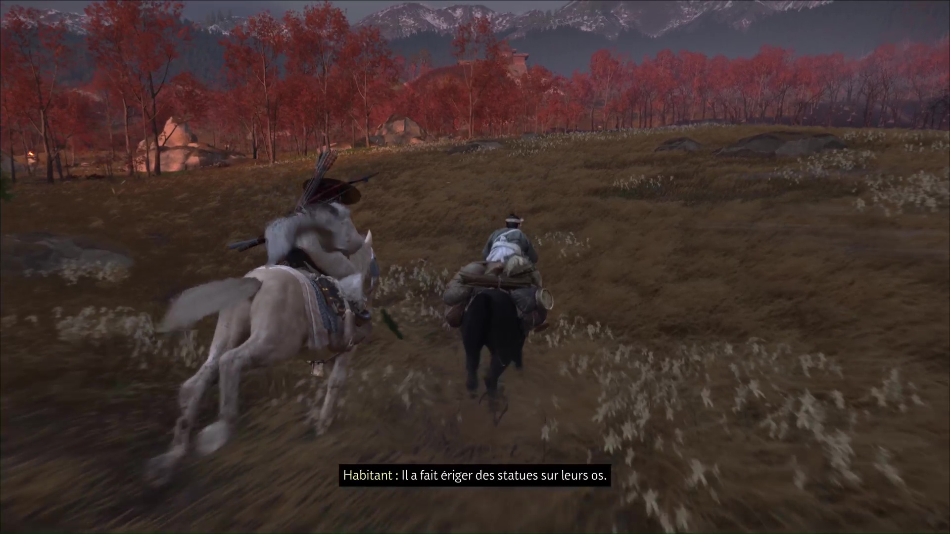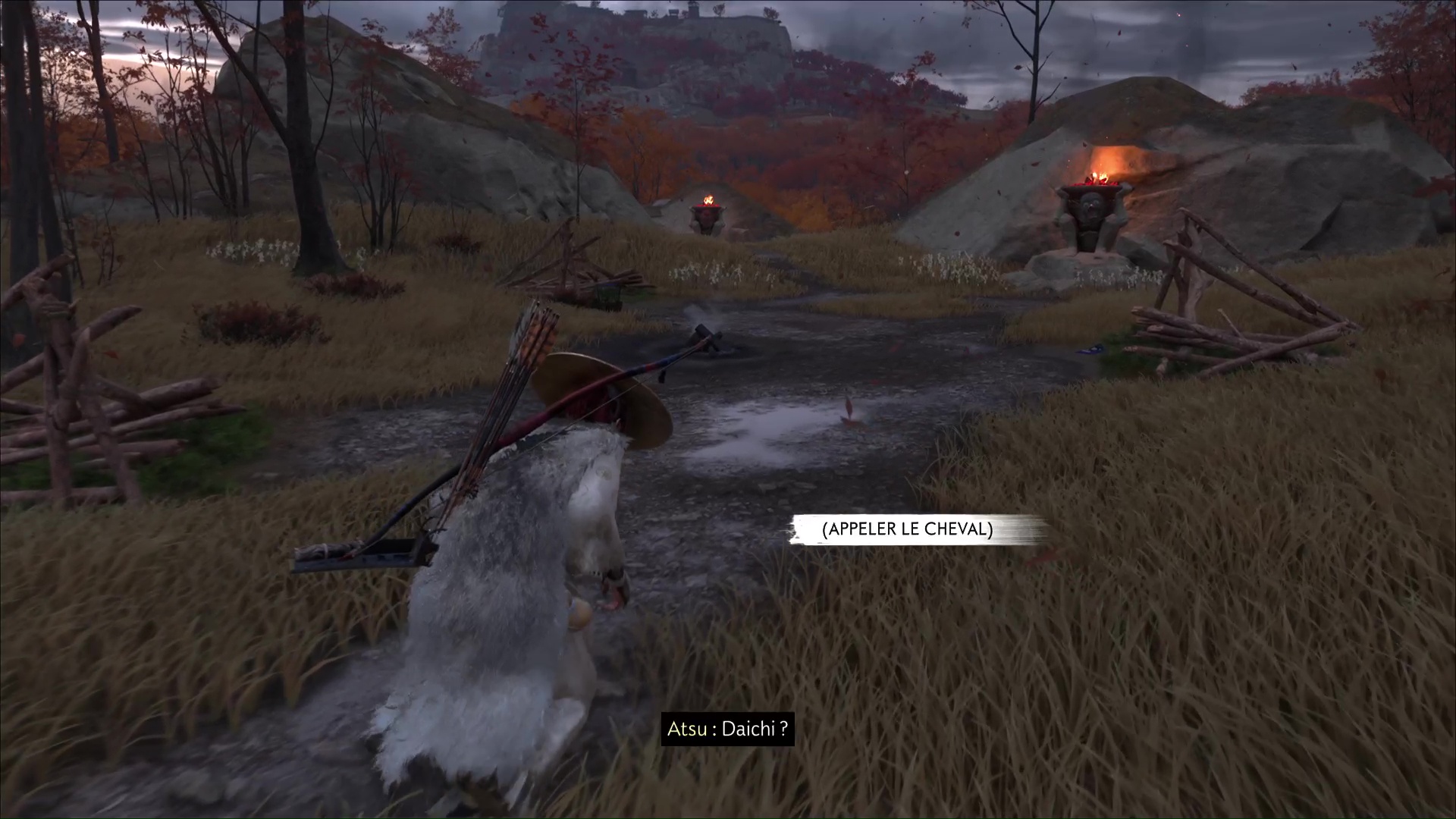 Suivez ensuite à cheval l’habitant puis, arrivé dans la zone maudite, il vous laisse vous en occuper en solo. Commencez par retrouver Daichi. Appelez le cheval grâce à la touche affichée à l’écran, et faites votre petit tour en suivant les statues.