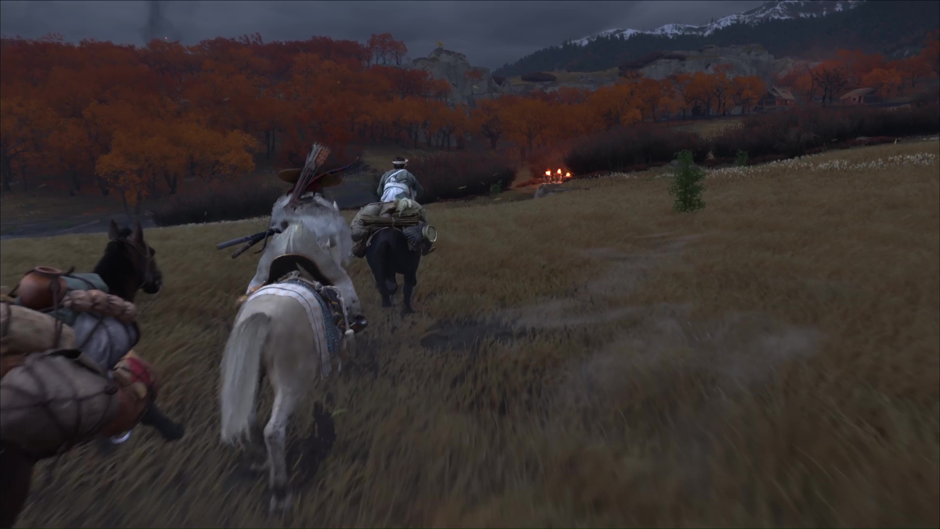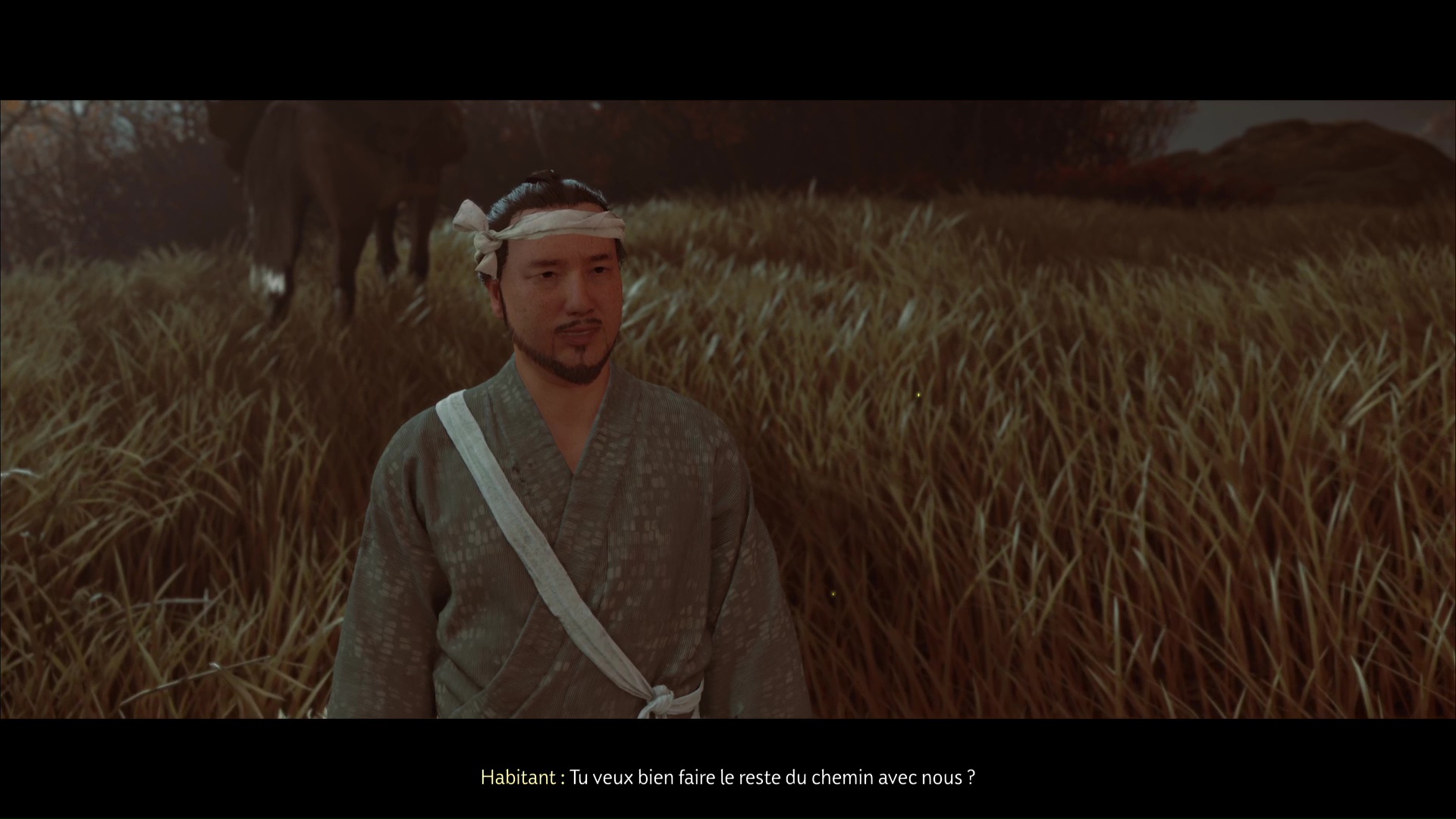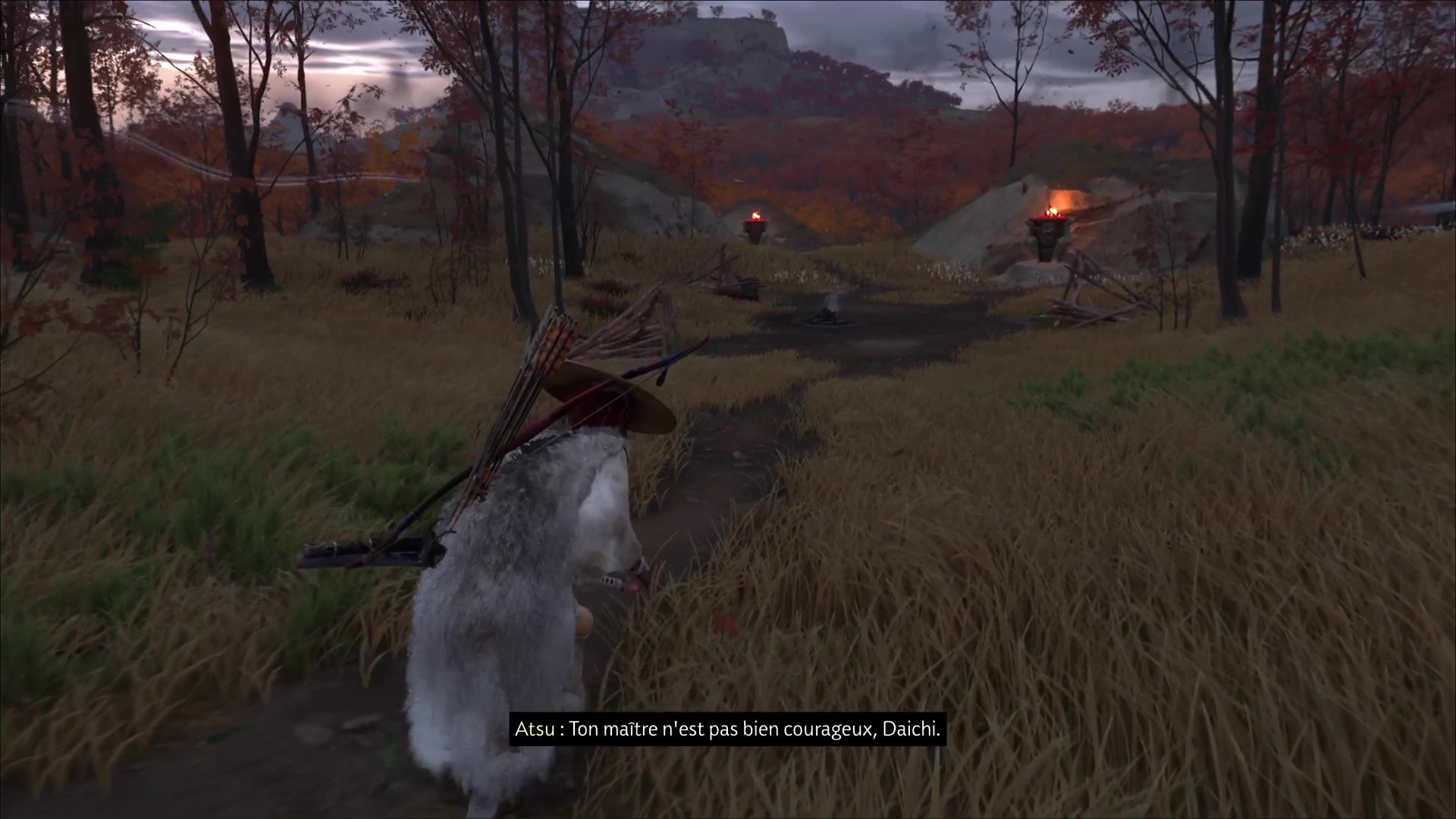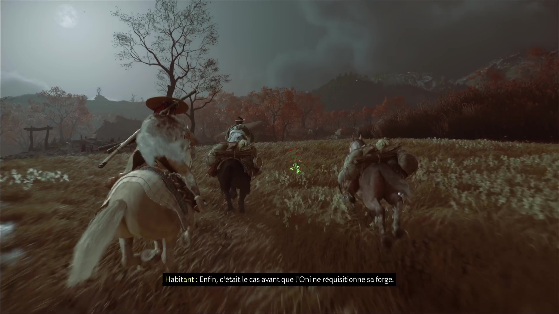 Suivez ensuite à cheval l’habitant puis, arrivé dans la zone maudite, il vous laisse vous en occuper en solo. Commencez par retrouver Daichi. Appelez le cheval grâce à la touche affichée à l’écran, et faites votre petit tour en suivant les statues.